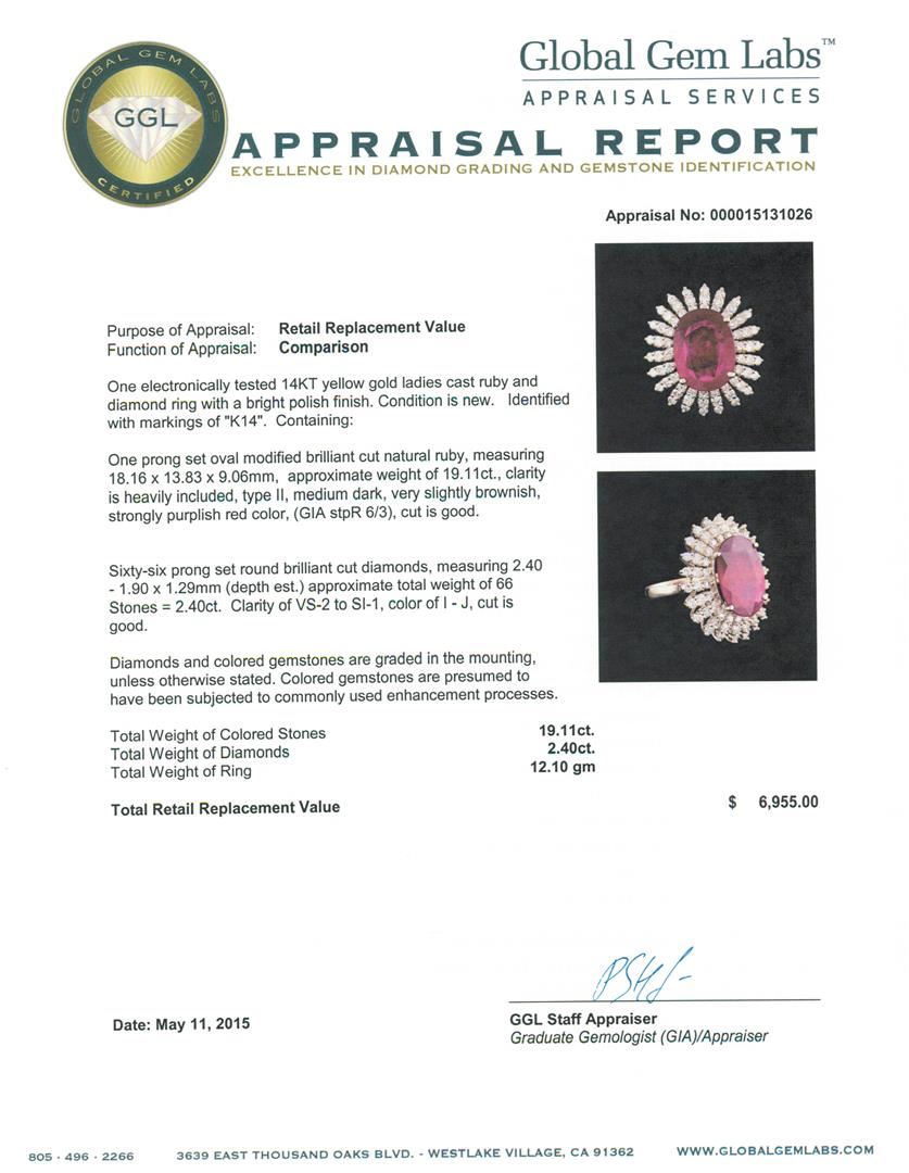 One electronically tested 14KT yellow gold ladies cast ruby and diamond ring with a bright polish finish. Identified with markings of "K14". Condition is new. Containing: One prong set oval modified brilliant cut natural ruby, measuring 18.16 x 13.83 x 9. GGL Appraised at $6,955.00.