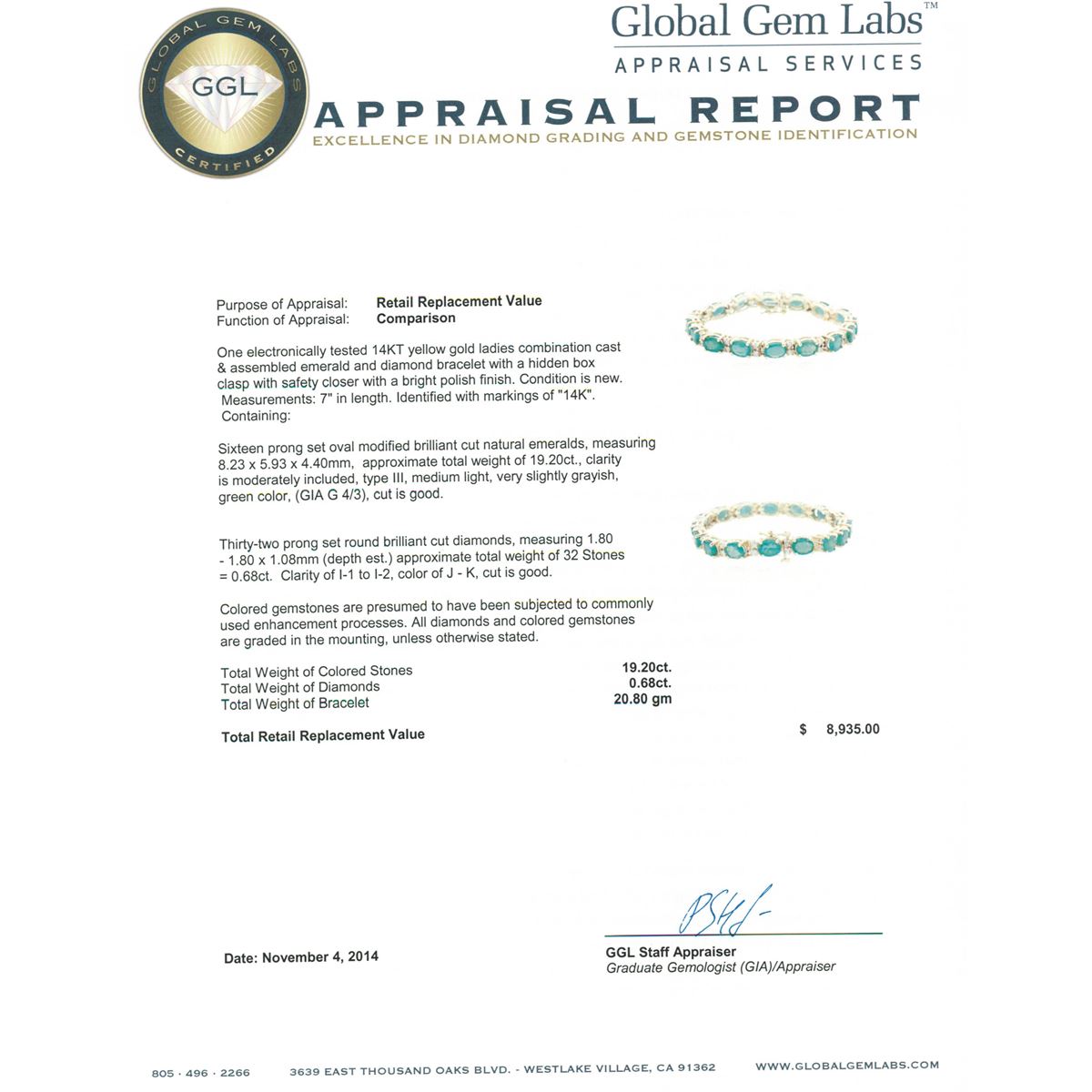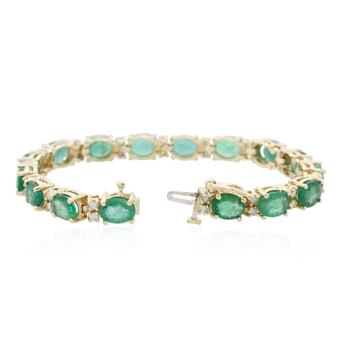 One electronically tested 14KT yellow gold ladies combination cast & assembled emerald and diamond bracelet with a hidden box clasp with safety closer with a bright polish finish. Measurements: 7" in length. Identified with markings of "14K". Condition is new. Containing: Sixteen prong set oval modified brilliant cut natural emeralds, measuring 8.23 x 5.93 x 4.40mm, approximate total weight of 19.20ct., clarity is moderately included, type III, medium light, very slightly grayish, green color, (GIA G 4/3), cut is good. Thirty-Two prong set round brilliant cut diamonds, measuring 1.80 - 1.80 x 1.08mm (depth est.) approximate total weight of 32 Stones = 0.68ct. Clarity: I-1 to I-2. Color: J - K, Cut is Good. Colored gemstones are presumed to have been subjected to commonly used enhancement processes. All diamonds and colored gemstones are graded in the mounting, unless otherwise stated. Total Weight of Colored Stones 19.20ct. Total Weight of Diamonds 0.68ct. Total Weight of Bracelet 20.80 grams. GGL Appraised at $8,935.00.