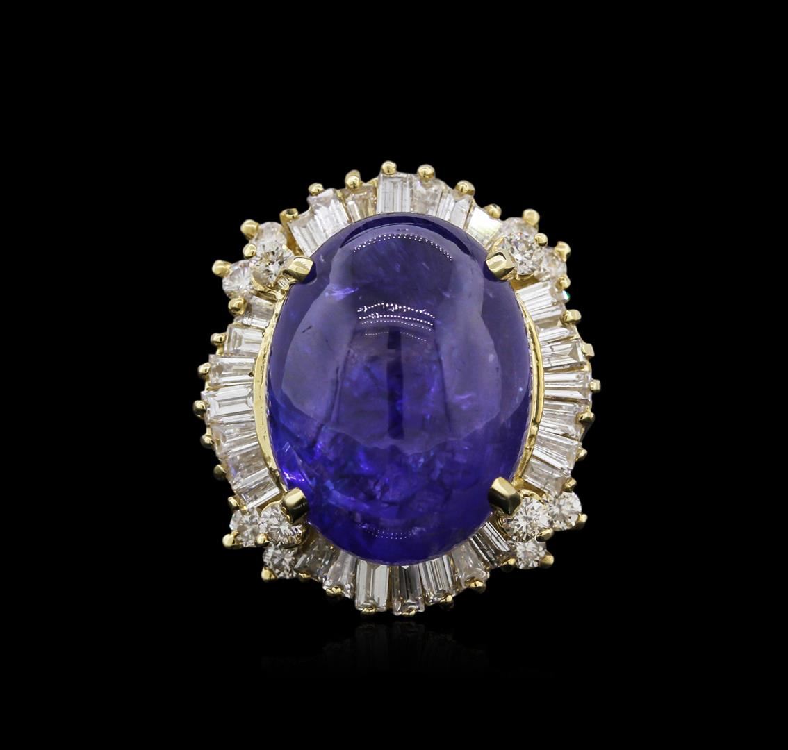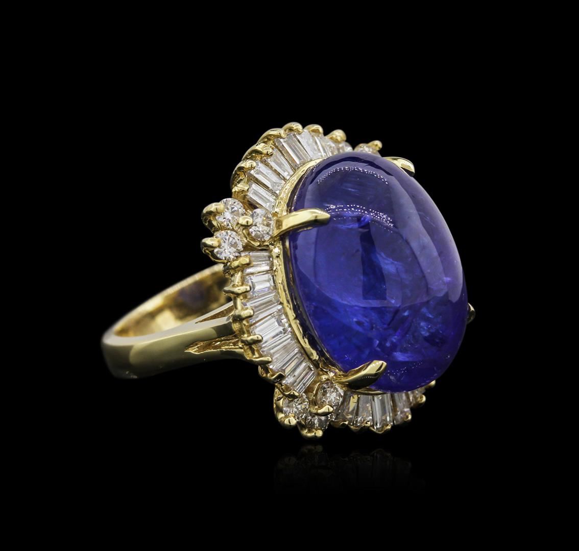 One electronically tested 14KT yellow gold ladies cast tanzanite and diamond ring with a bright polish finish. Identified with markings of "14K". Condition is new. Containing: One prong set oval cabochon cut natural tanzanite, measuring 18.20 x 13.50 x 8.78mm, approximate weight of 19.51ct., clarity is heavily included, type I, medium, very slightly grayish, violet color, (GIA V 5/3), cut is good. Twelve prong set round brilliant cut diamonds, measuring 2.00 - 2.00 x 1.20mm (depth est.) approximate total weight of 12 Stones = 0.35ct. Clarity: SI-2 to I-1. Color: L - M, Cut is Good. Twenty-Eight channel set baguette cut diamonds, measuring from 3.00 x 1.50 x 1.28mm (depth est.) to 4.00 x 1.50 x 1.28mm (depth est.) approximate total weight of 28 Stones = 1.72ct. Clarity: SI-1 to SI-2. Color: H - I, Cut is Good. Diamonds and colored gemstones are graded in the mounting, unless otherwise stated. Colored gemstones are presumed to have been subjected to commonly used enhancement processes. Total Weight of Colored Stones 19.51ct. Total Weight of Diamonds 2.07ct. Total Weight of Ring 13.30 grams. GGL Appraised at $10,400.00.