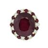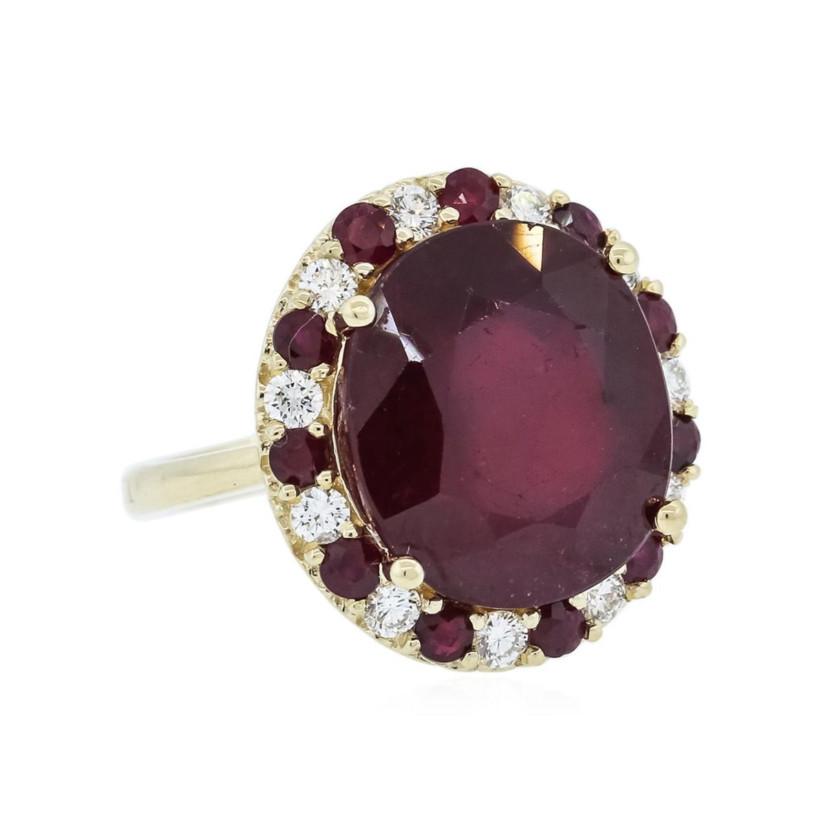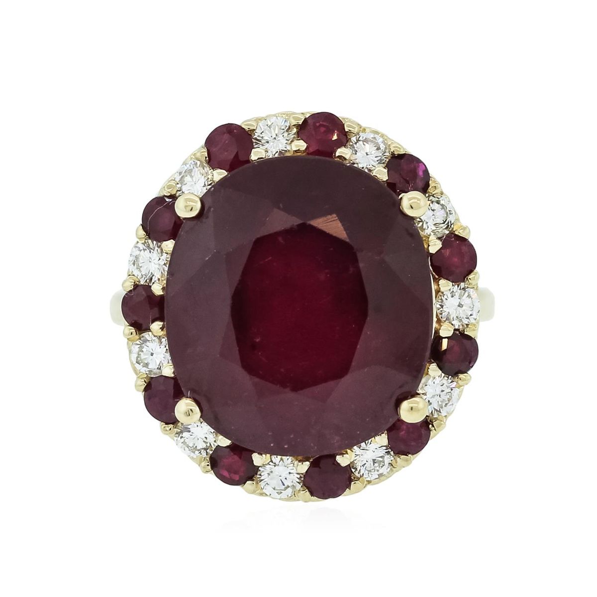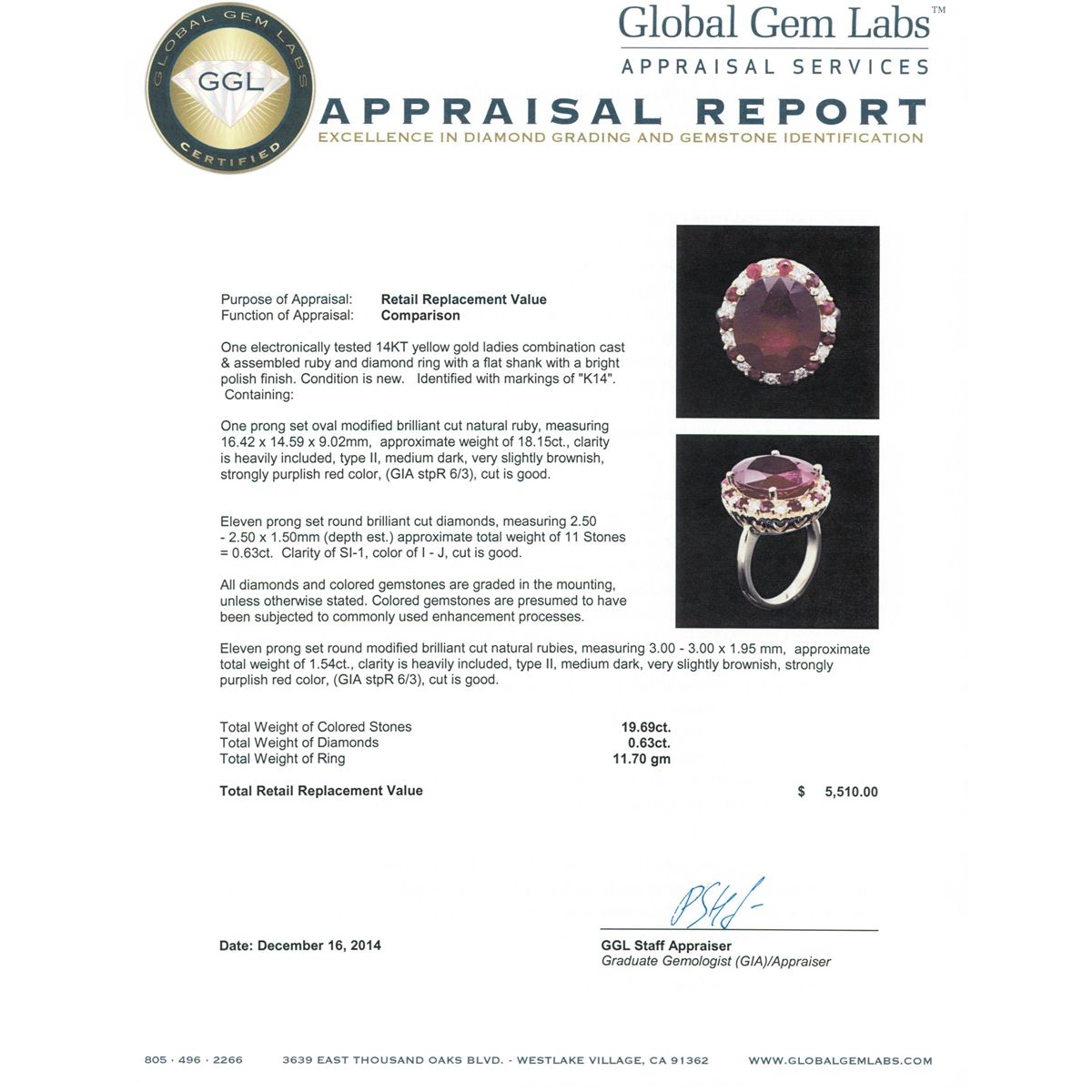 One electronically tested 14KT yellow gold ladies combination cast & assembled ruby and diamond ring with a flat shank with a bright polish finish. Identified with markings of "K14". Condition is new. Containing: One prong set oval modified brilliant cut natural ruby, measuring 16.42 x 14.59 x 9.02mm, approximate weight of 18.15ct., clarity is heavily included, type II, medium dark, very slightly brownish, strongly purplish red color, (GIA stpR 6/3), cut is good. Eleven prong set round brilliant cut diamonds, measuring 2.50 - 2.50 x 1.50mm (depth est.) approximate total weight of 11 Stones = 0.63ct. Clarity: SI-1. Color: I - J, Cut is Good. All diamonds and colored gemstones are graded in the mounting, unless otherwise stated. Colored gemstones are presumed to have been subjected to commonly used enhancement processes. Eleven prong set round modified brilliant cut natural rubies, measuring 3.00 - 3.00 x 1.95 mm, approximate total weight of 1.54ct., clarity is heavily included, type II, medium dark, very slightly brownish, strongly purplish red color, (GIA stpR 6/3), cut is good.. Total Weight of Colored Stones 19.69ct. Total Weight of Diamonds 0.63ct. Total Weight of Ring 11.70 grams. GGL Appraised at $5,510.00.