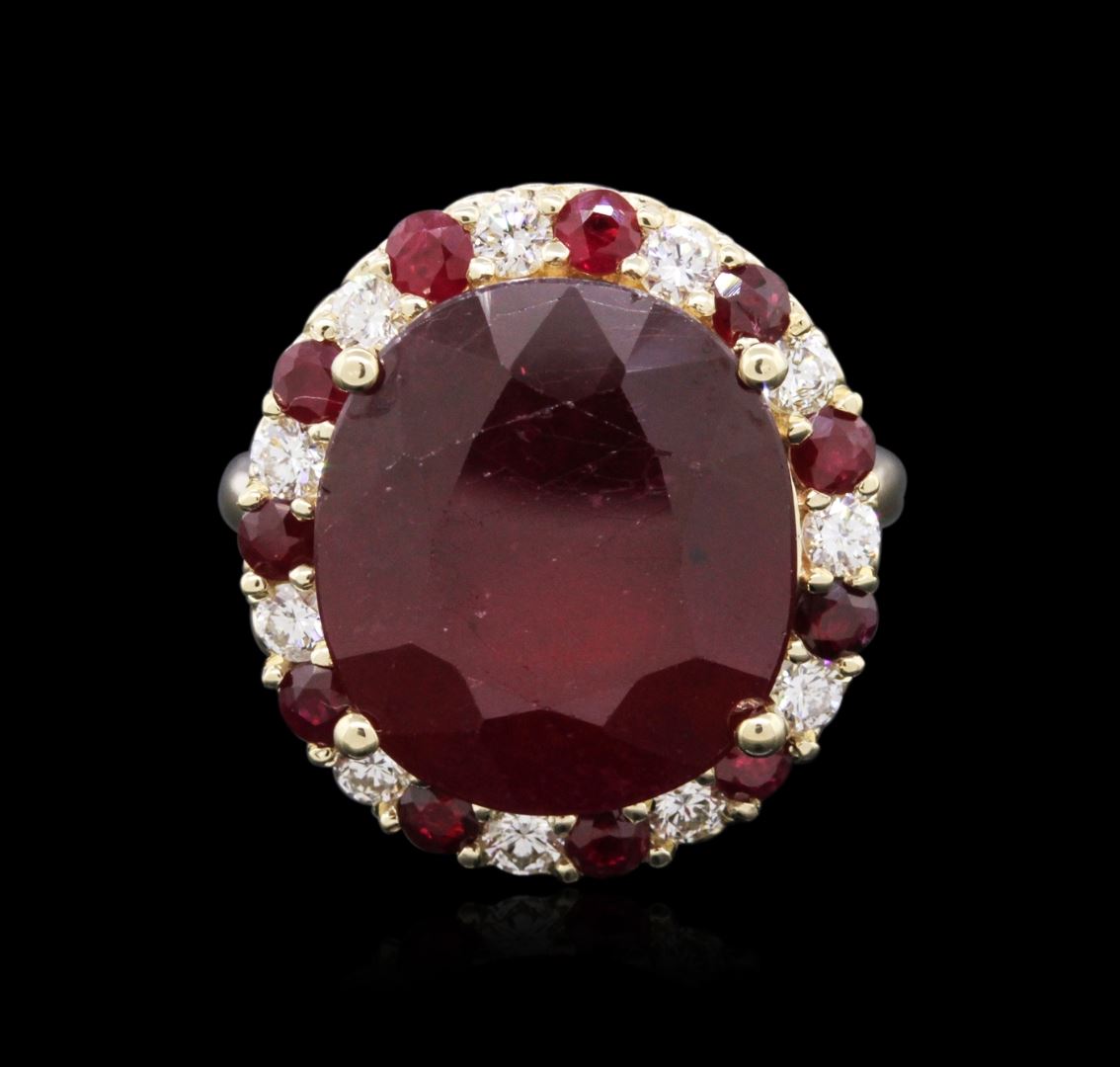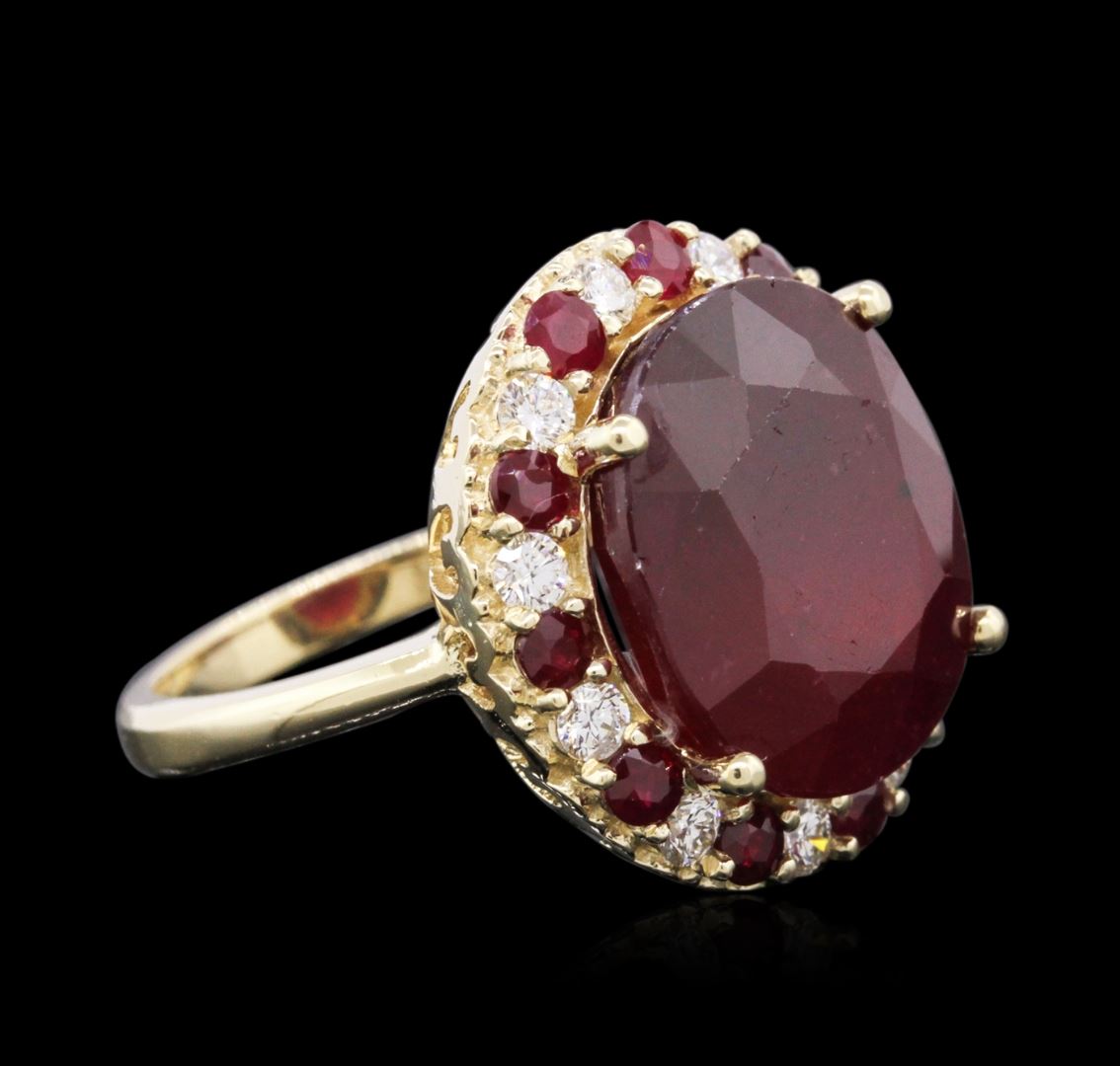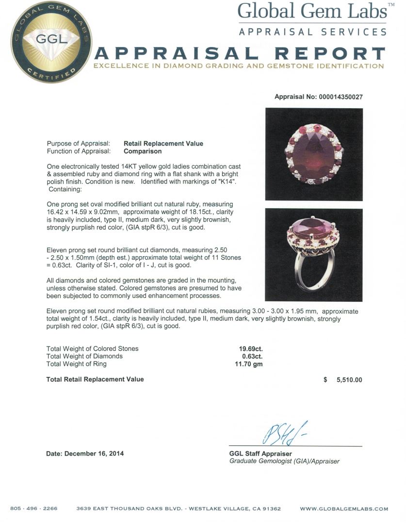 One electronically tested 14KT yellow gold ladies combination cast & assembled ruby and diamond ring with a flat shank with a bright polish finish. Identified with markings of "K14". Condition is new. Containing: One prong set oval modified brilliant cut natural ruby, measuring 16.42 x 14.59 x 9.02mm, approximate weight of 18.15ct., clarity is heavily included, type II, medium dark, very slightly brownish, strongly purplish red color, (GIA stpR 6/3), cut is good. Eleven prong set round brilliant cut diamonds, measuring 2.50 - 2.50 x 1.50mm (depth est.) approximate total weight of 11 Stones = 0.63ct. Clarity: SI-1. Color: I - J, Cut is Good. All diamonds and colored gemstones are graded in the mounting, unless otherwise stated. Colored gemstones are presumed to have been subjected to commonly used enhancement processes. Eleven prong set round modified brilliant cut natural rubies, measuring 3.00 - 3.00 x 1.95 mm, approximate total weight of 1.54ct., clarity is heavily included, type II, medium dark, very slightly brownish, strongly purplish red color, (GIA stpR 6/3), cut is good.. Total Weight of Colored Stones 19.69ct. Total Weight of Diamonds 0.63ct. Total Weight of Ring 11.70 grams. GGL Appraised at $5,510.00.