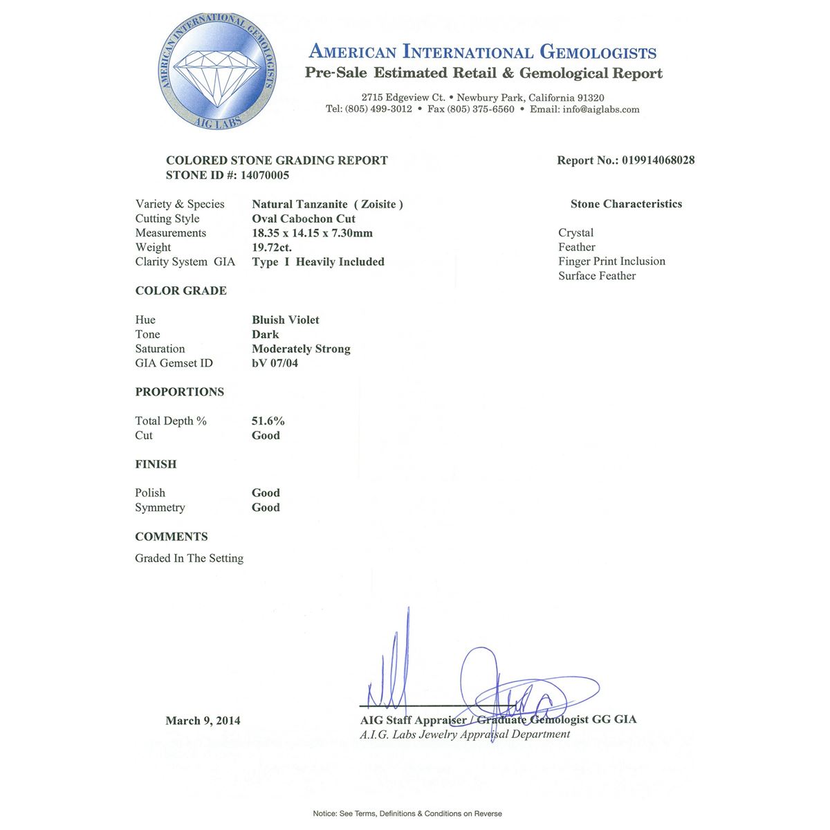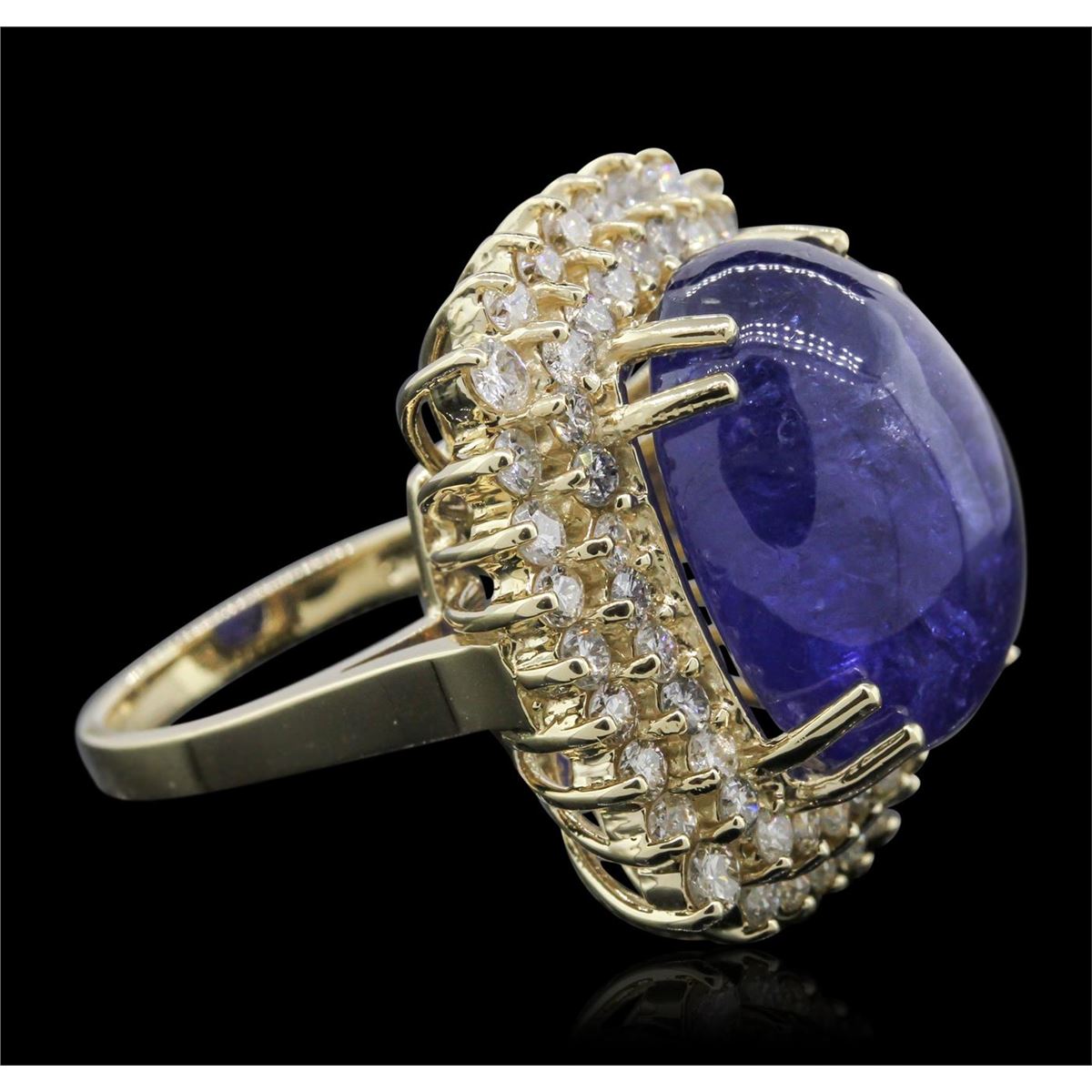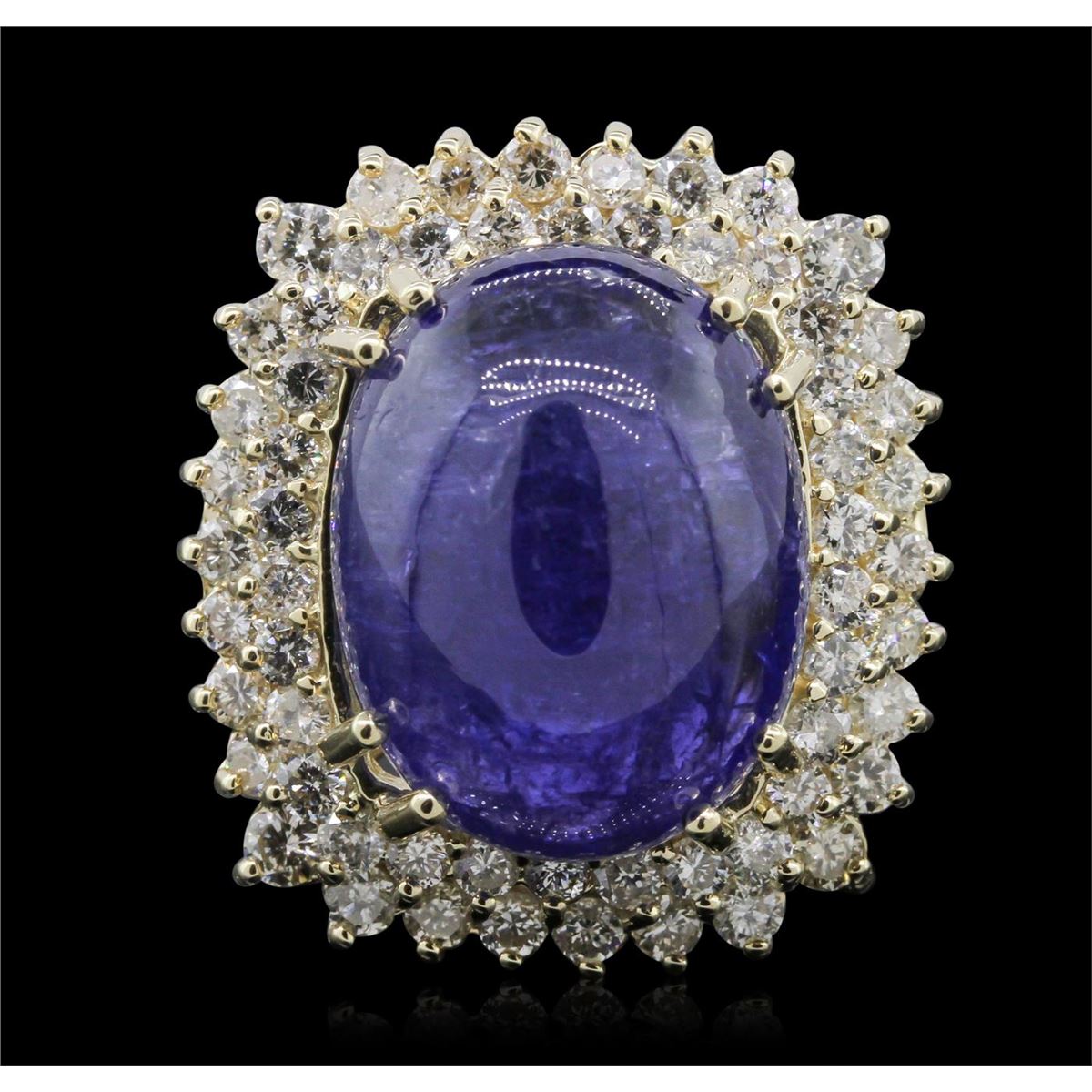 One electronically tested 14KT yellow gold ladies cast tanzanite and diamond ring with a bright polish finish. Condition is new, good workmanship. The featured tanzanite is set within two tiered diamond bezels supported by tapering shoulders, completed by a two and one-half millimeter wide band. Identified with markings of "K14". Containing: One prong set oval cabochon cut natural tanzanite, measuring 18.35 x 14.15 x 7.30mm, 15%. bulge factor, approximate weight of 19.72ct., clarity is heavily included, type I, dark, moderately strong, bluish violet color, (GIA bV 7/4), cut is good. Transmitting light somewhat diffusely, translucent. Naturally occurring internal & external characteristics are present. Colored Stone Grading Report attached. Graded in the setting. Sixty prong set round brilliant cut diamonds, measuring 2.20 - 2.00 x 1.26mm (depth est.) approximate. Total Weight of 60 Stones = 2.13ct. Graded in the setting. Clarity: SI-1 to I-1. Color: I - K. Total Weight of Colored Stones 19.72ct. Total Weight of Diamonds 2.13ct. Total Weight of Ring 15.99 grams. AIG Appraised at $13,045.00.