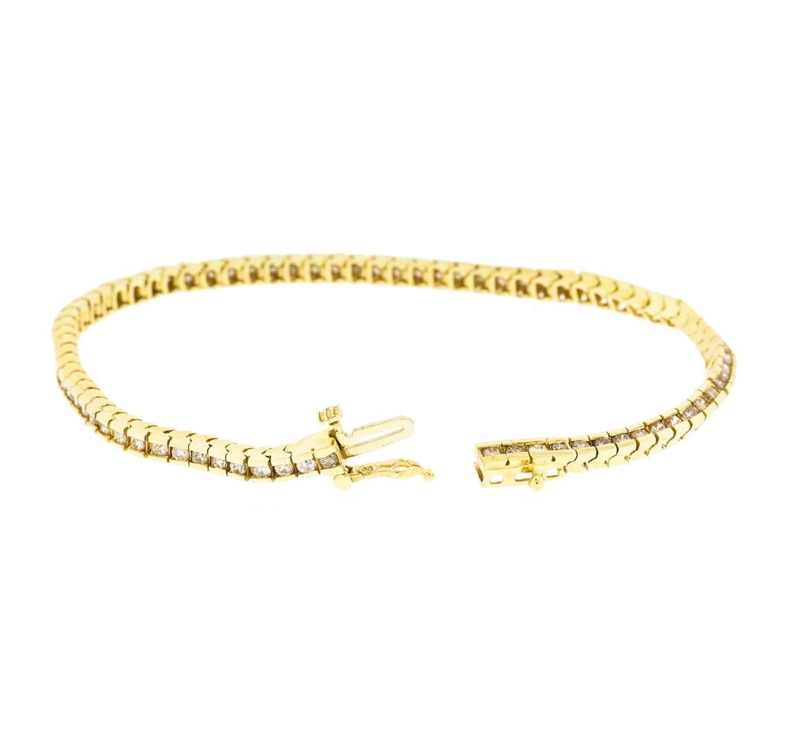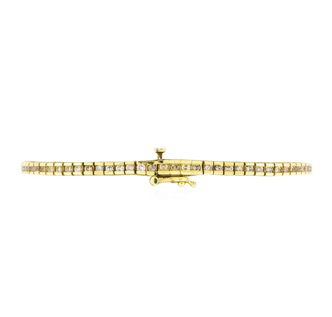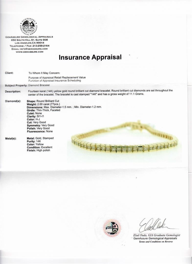 One 14KT Yellow Gold 2.00ctw Diamond Tennis Bracelet with a total weight of 11.1 grams. (77) diamonds with a total weight of 2.00cts with a color of (H-J) and clarity of (SI-1 to I-1). GGA Appraised.