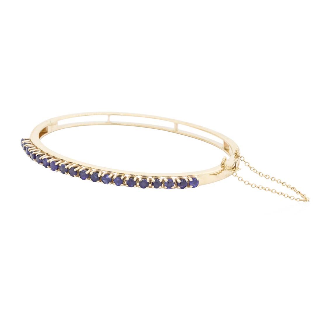 One lady's bangle bracelet featuring: 14KT yellow gold weighing 10.6 grams containing sapphires weighing 2.00ctw. The bracelet has an attached safety chain and measures approximately seven inches in circumference.