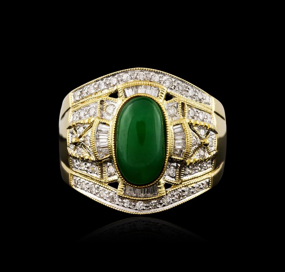 One ring featuring: 14KT yellow gold weighing 10.60 grams containing one jade center weighing 2.00ct and diamonds weighing a total of 1.00ct.