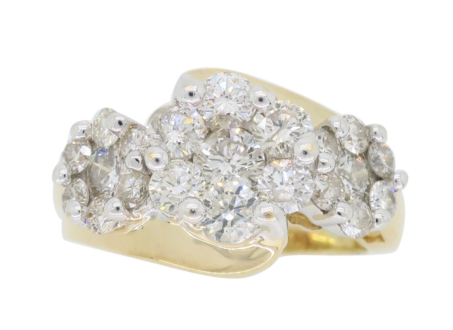 One 14KT Yellow Gold 2.00ctw Diamond Ring. (21) Round Diamonds with a total weight of 2.00cts with a color of H-J and clarity of SI-1. Total weight of this ring is 6.9 grams. Ring size is 8.