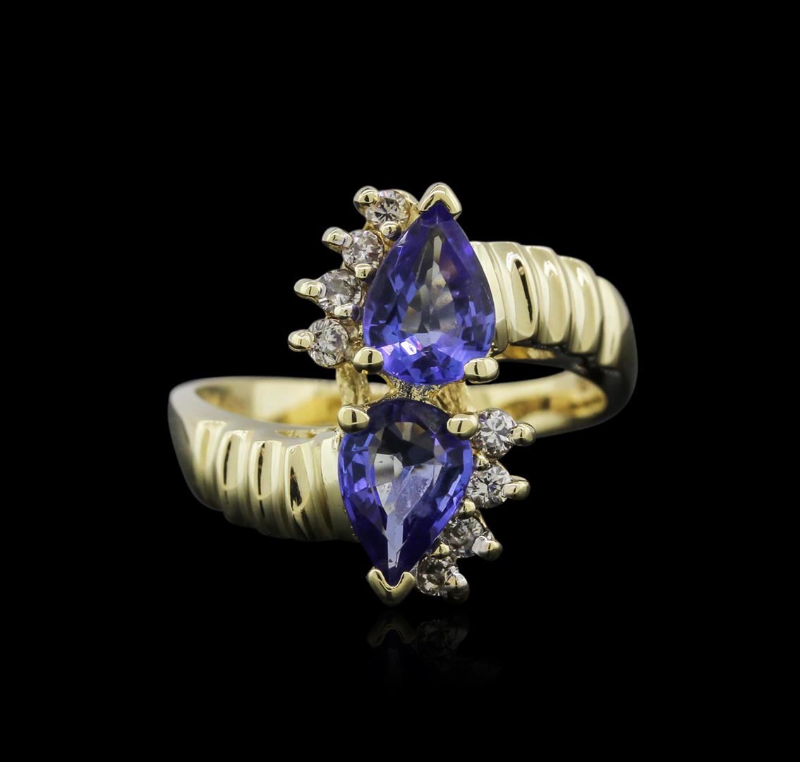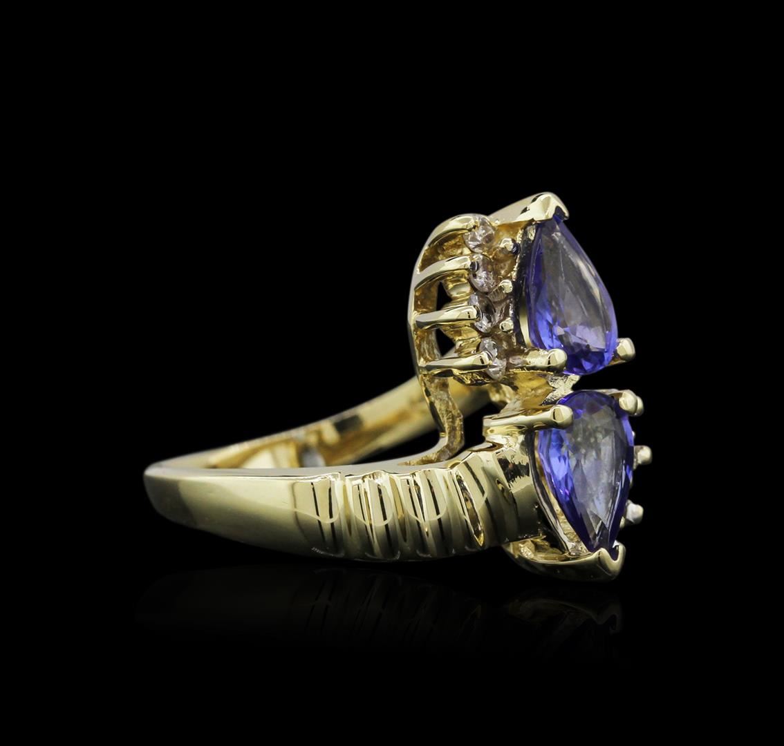 One ring featuring: 14KT yellow gold weighing 5.71 grams containing two tanzanites with a total weight of 2.00ct and diamonds with a total weight of 0.10ct.
