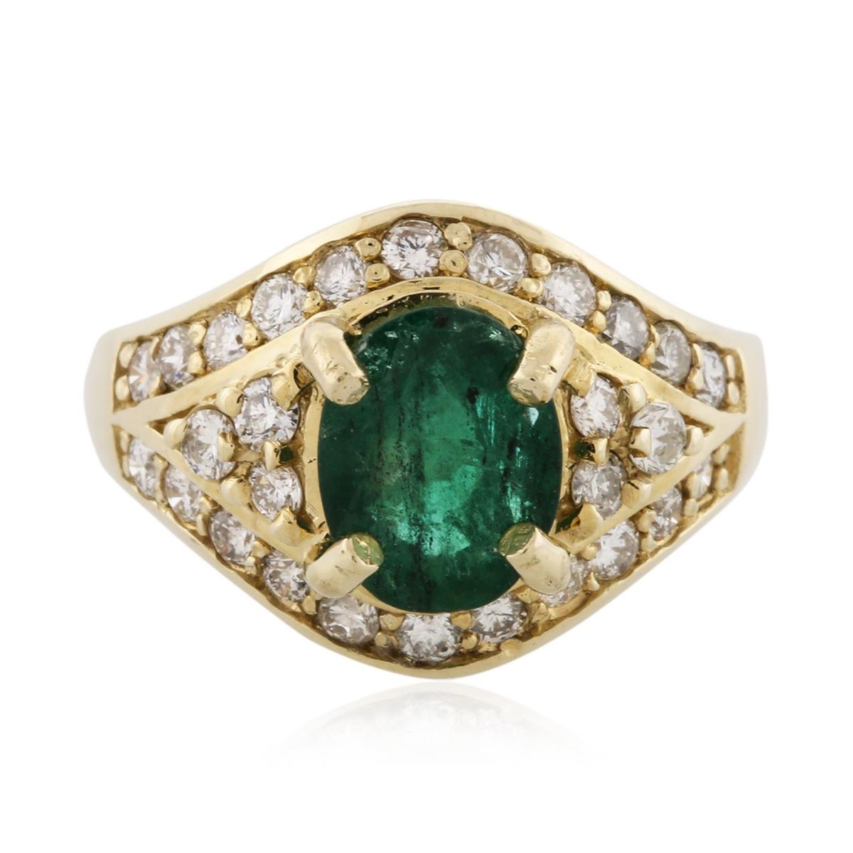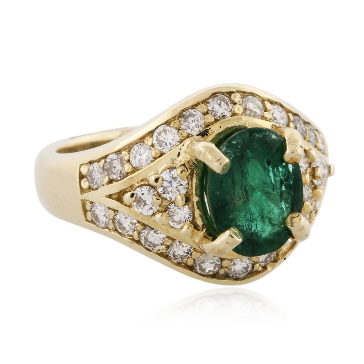 One electronically tested 14KT yellow gold ladies cast emerald and diamond ring with a bright polish finish. Condition is new, good workmanship. The featured emerald is supported by diamond accented shoulders framed by mirroring ribbons of diamonds, completed by a three and one-half millimeter wide. Identified with markings of "K14". Containing: One prong set oval mixed cut natural emerald, measuring 9.10 x 7.10 x 5.10mm, 8% bulge factor, approximate weight of 2.01ct, clarity is heavily included, type III, medium dark, moderately strong, very slightly bluish green color, (GIA vslbG 6/4), cut is good. Transmitting light with a minimum of distortion, transparent to translucent. Naturally occurring internal & external characteristics are present. Indications of oil & opticon residue. Graded in the setting. Twenty-Eight prong & bead set round brilliant cut diamonds, measuring 2.20 - 2.00 x 1.26mm (depth est.) approximate total weight of 28 Stones = 1.05ct. Graded in the setting. Clarity SI-2 to I-1 Color G - I Total Weight of Colored Stones 2.01ct. Total Weight of Diamonds 1.05ct. Total Weight of Ring 7.80 grams. AIG Appraised at $7,400.00.