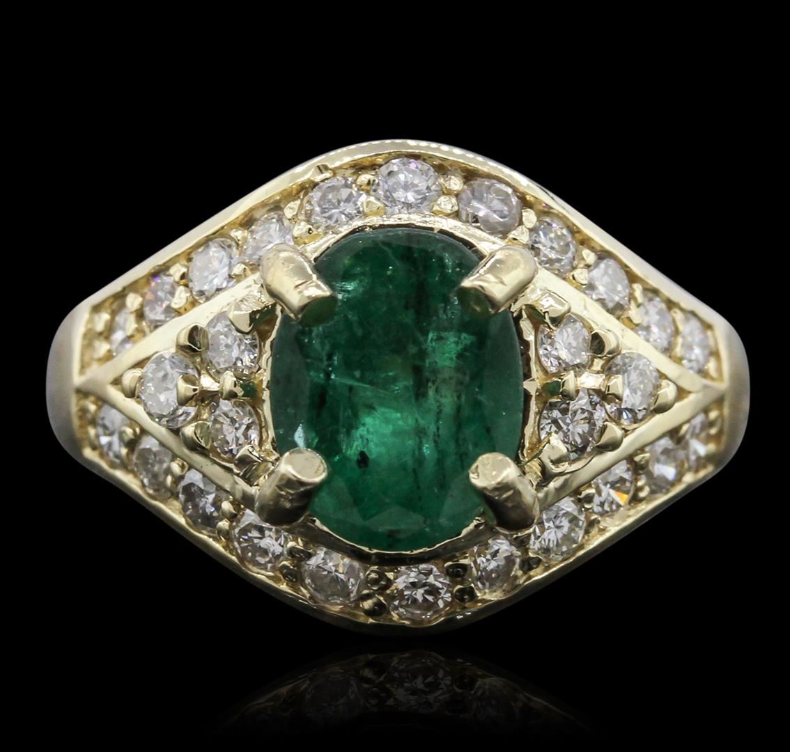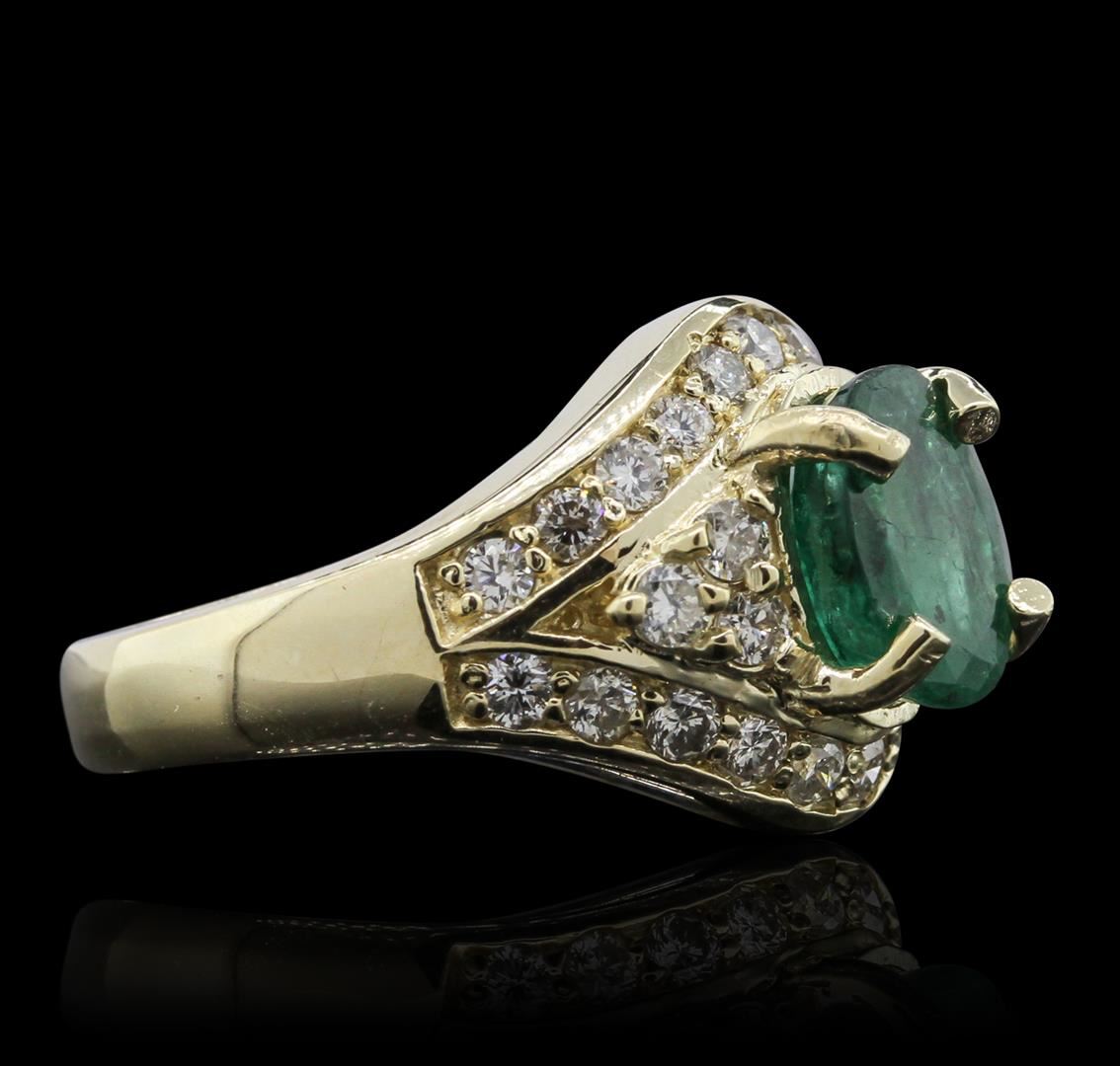 One electronically tested 14KT yellow gold ladies cast emerald and diamond ring with a bright polish finish. Condition is new, good workmanship. The featured emerald is supported by diamond accented shoulders framed by mirroring ribbons of diamonds, completed by a three and one-half millimeter wide. Identified with markings of "K14". Containing: One prong set oval mixed cut natural emerald, measuring 9.10 x 7.10 x 5.10mm, 8% bulge factor, approximate weight of 2.01ct, clarity is heavily included, type III, medium dark, moderately strong, very slightly bluish green color, (GIA vslbG 6/4), cut is good. Transmitting light with a minimum of distortion, transparent to translucent. Naturally occurring internal & external characteristics are present. Indications of oil & opticon residue. Graded in the setting. Twenty-Eight prong & bead set round brilliant cut diamonds, measuring 2.20 - 2.00 x 1.26mm (depth est.) approximate total weight of 28 Stones = 1.05ct. Graded in the setting. Clarity SI-2 to I-1 Color G - I Total Weight of Colored Stones 2.01ct. Total Weight of Diamonds 1.05ct. Total Weight of Ring 7.80 grams. AIG Appraised at $7,400.00.