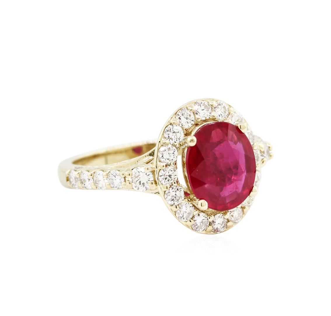 One electronically tested 14KT yellow gold ladies cast ruby and diamond ring with a bright polish finish. The featured ruby is set within a diamond bezel supported by an elaborate diamond set under gallery and diamond set shoulders, completed by a two millimeter wide band. Identified with markings of "K14". Condition is new, good workmanship. Containing: One prong set oval mixed cut natural ruby, measuring 8.90 x 7.50 x 2.70mm, 20% bulge factor, exact weight 2.02ct., clarity is heavily included, type II, medium dark, very slightly brownish, red color, (GIA R 6/3), cut is good. Transmitting light somewhat diffusely, transparent to translucent. Naturally occurring internal & external characteristics are present. Indications of laboratory high temperature heat treatment, with glass & flux additives. Graded in the setting. Ruby has a low tolerance to rhodium plating, repolishing the surface, & ultrasonic cleaning. Seventy-Four prong set round brilliant cut diamonds exact total weight 74 Stones = 1.15ct. Graded in the setting. Clarity: SI-1 to SI-2. Color: F - H. Total Weight of Colored Stones 2.02ct. Total Weight of Diamonds 1.15ct. Total Weight of Ring 5.26gm. AIG Appraised at $5,365.00.