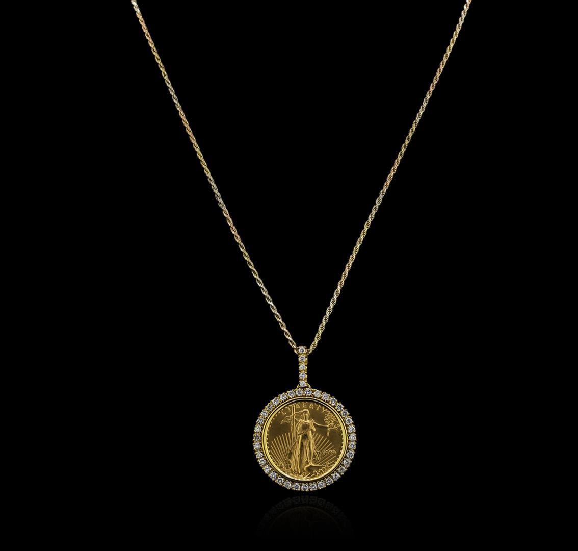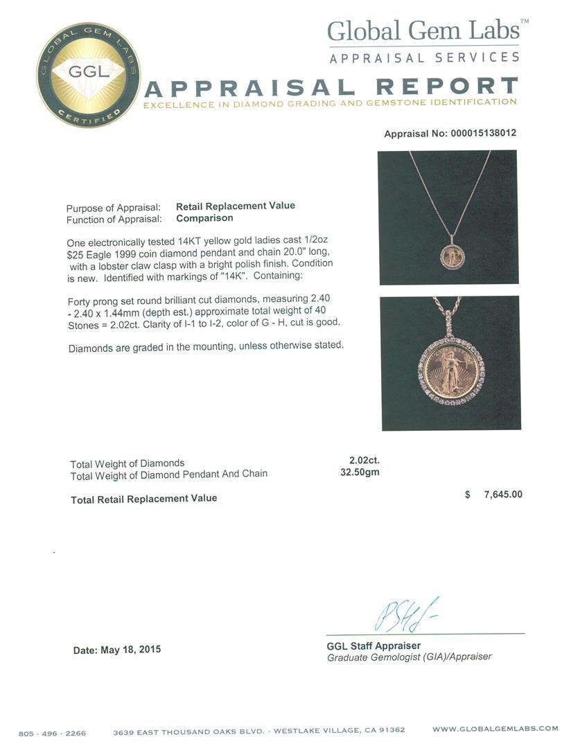 One electronically tested 14KT yellow gold ladies cast 1/2oz $25 Eagle 1999 coin diamond pendant and chain 20.0" long, with a lobster claw clasp with a bright polish finish. Identified with markings of "14K". Condition is new. Containing: Forty prong set round brilliant cut diamonds, measuring 2.40 - 2.40 x 1.44mm (depth est.) approximate total weight of 40 Stones = 2.02ct. Clarity: I-1 to I-2. Color: G - H, Cut is Good. Diamonds are graded in the mounting, unless otherwise stated. Total Weight of Diamonds 2.02ct. Total Weight of Diamond Pendant And Chain 32.50 grams. GGL Appraised at $7,645.00.