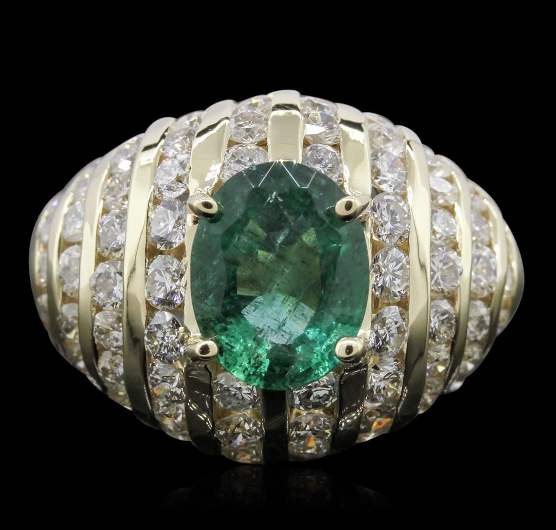 One electronically tested 14KT yellow gold Ladies combination cast & assembled fashion ring with a high polish finish. Condition is new. Identified with markings of "14K". Containing: One prong set oval modified mixed cut natural emerald, measuring 9.95 x 8.08 x 4.60mm, approximate weight of 2.03ct., clarity is heavily included, type III, medium, very slightly grayish, very slightly bluish green color, (GIA vslbG 5/3), cut is good. Colored gemstones are presumed to have been subjected to commonly used and possible undetectable color/clarity enhancement processes. Sixty-Six prong set round brilliant cut diamonds, measuring 2.50 - 1.50 x 1.20mm (depth est.) approximate total weight of 66 Stones = 1.93ct. Clarity of SI-1 to I-1, Color of I - J, Cut is Good. Total Weight of Colored Stones 2.03ct. Total Weight of Diamonds 1.93ct. Total Weight of Ring 12.70 grams. GGL Appraised at $12,415.00.