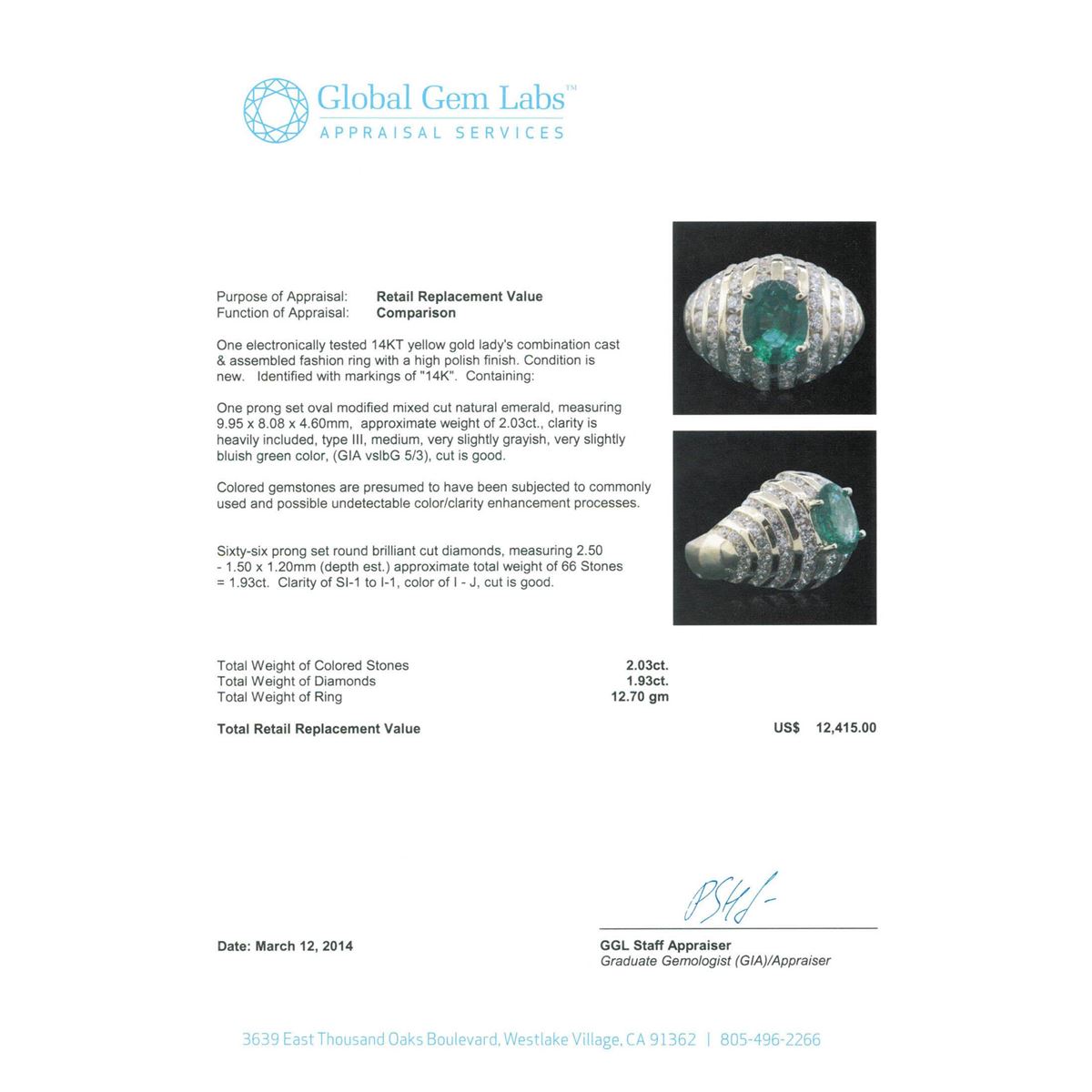 One electronically tested 14KT yellow gold Ladies combination cast & assembled fashion ring with a high polish finish. Condition is new. Identified with markings of "14K". Containing: One prong set oval modified mixed cut natural emerald, measuring 9.95 x 8.08 x 4.60mm, approximate weight of 2.03ct., clarity is heavily included, type III, medium, very slightly grayish, very slightly bluish green color, (GIA vslbG 5/3), cut is good. Colored gemstones are presumed to have been subjected to commonly used and possible undetectable color/clarity enhancement processes. Sixty-Six prong set round brilliant cut diamonds, measuring 2.50 - 1.50 x 1.20mm (depth est.) approximate total weight of 66 Stones = 1.93ct. Clarity of SI-1 to I-1, Color of I - J, Cut is Good. Total Weight of Colored Stones 2.03ct. Total Weight of Diamonds 1.93ct. Total Weight of Ring 12.70 grams. GGL Appraised at $12,415.00.