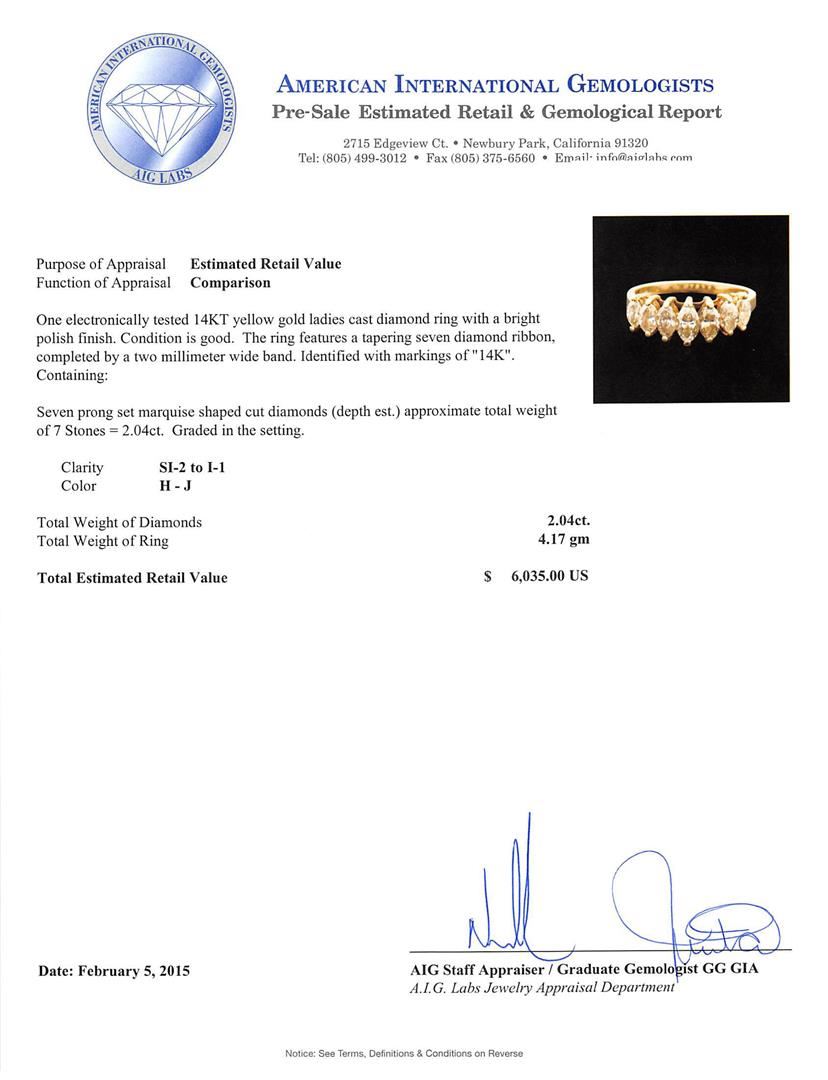 One electronically tested 14KT yellow gold ladies cast diamond ring with a bright polish finish. The ring features a tapering seven diamond ribbon, completed by a two millimeter wide band. Identified with markings of "14K". Condition is good. Containing: Seven prong set marquise shaped cut diamonds (depth est.) approximate total weight of 7 Stones = 2.04ct. Graded in the setting. Clarity: SI-2 to I-1. Color: H - J. Total Weight of Diamonds 2.04ct. Total Weight of Ring 4.17 grams. AIG Appraised at $6,035.00.