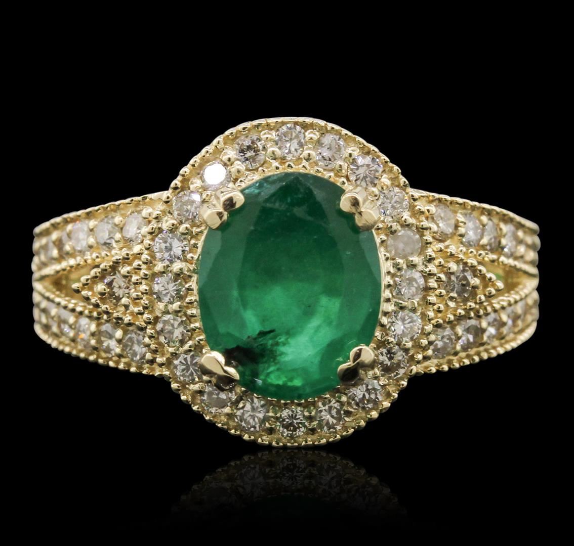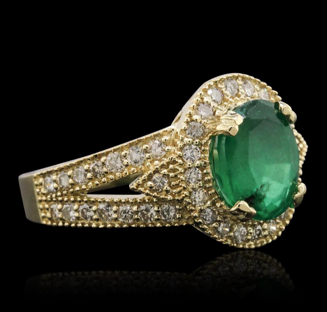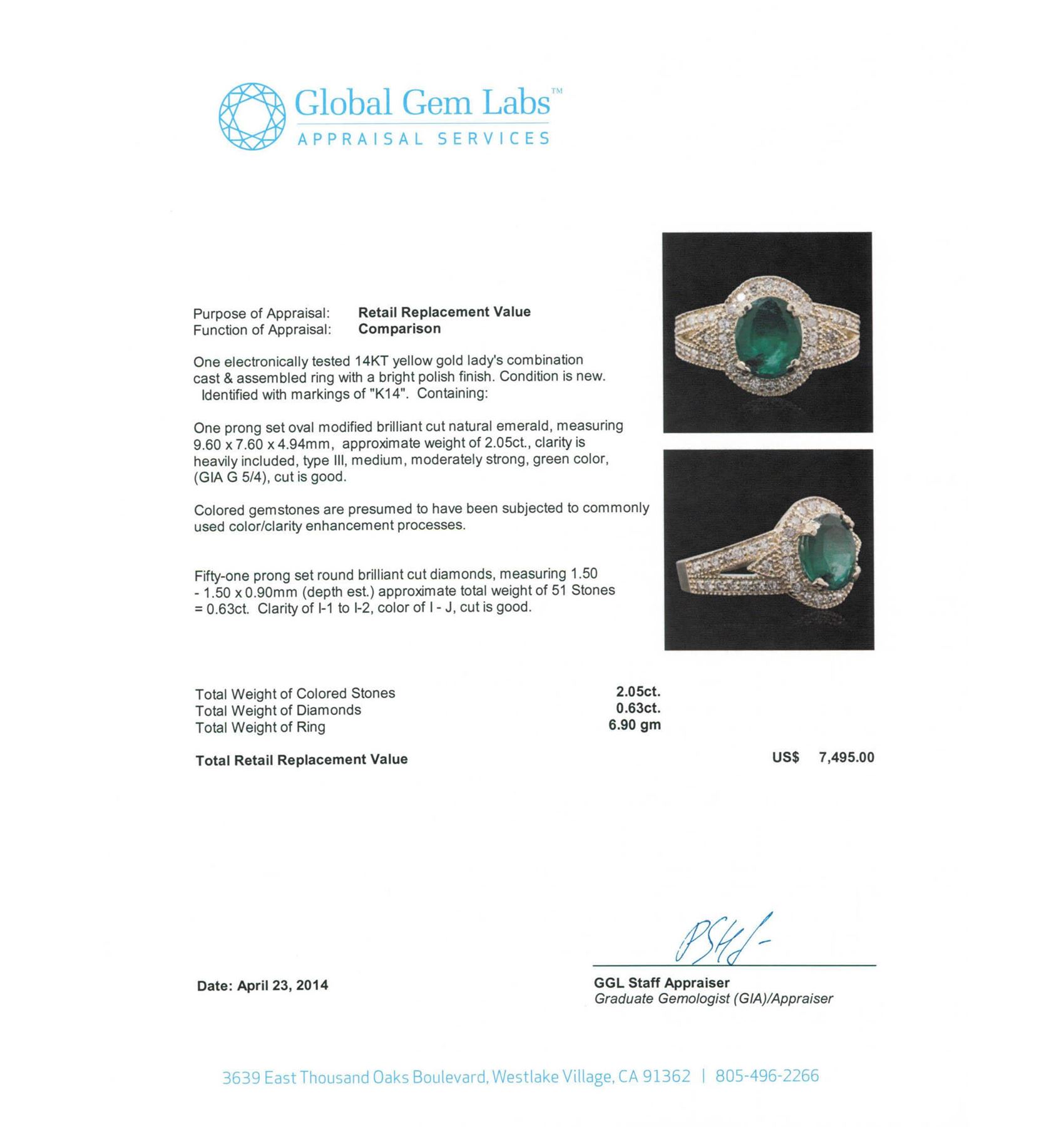 One electronically tested 14KT yellow gold Ladies combination cast & assembled ring with a bright polish finish. Condition is new. Identified with markings of "K14". Containing: One prong set oval modified brilliant cut natural emerald, measuring 9.60 x 7.60 x 4.94mm, approximate weight of 2.05ct., clarity is heavily included, type III, medium, moderately strong, green color, (GIA G 5/4), cut is good. Colored gemstones are presumed to have been subjected to commonly used color/clarity enhancement processes. Fifty-One prong set round brilliant cut diamonds, measuring 1.50 - 1.50 x 0.90mm (depth est.) approximate. Total Weight of 51 Stones = 0.63ct. Clarity: I-1 to I-2. Color: I - J, Cut is Good. Total Weight of Colored Stones 2.05ct. Total Weight of Diamonds 0.63ct. Total Weight of Ring 6.90 grams. GGL Appraised at $7,495.00.