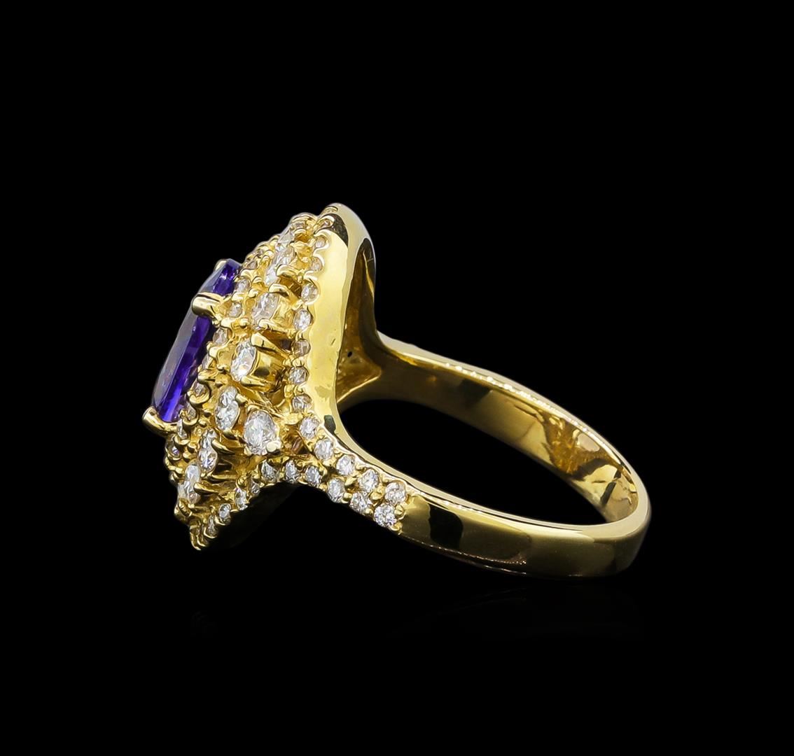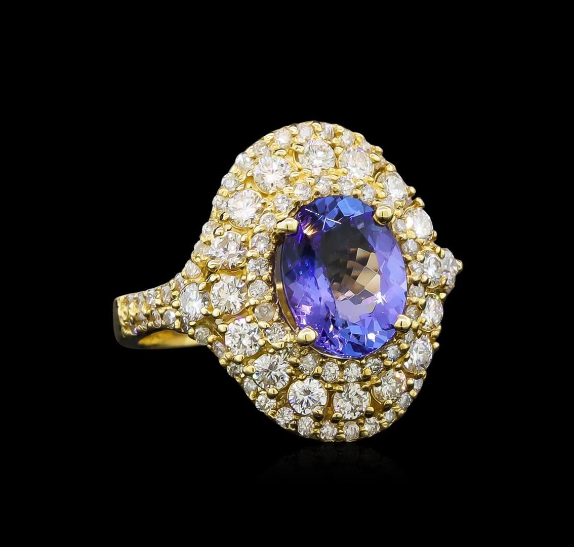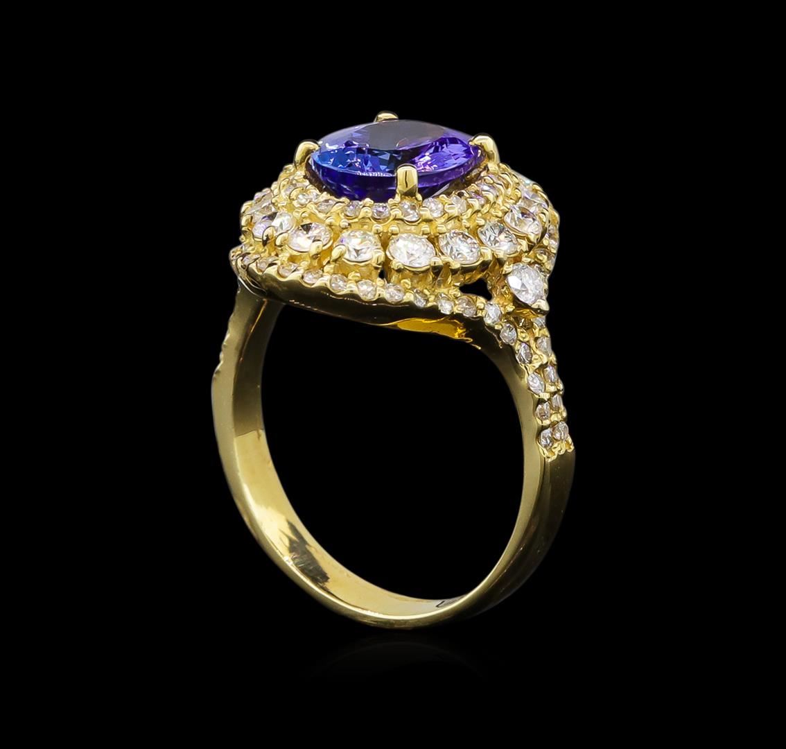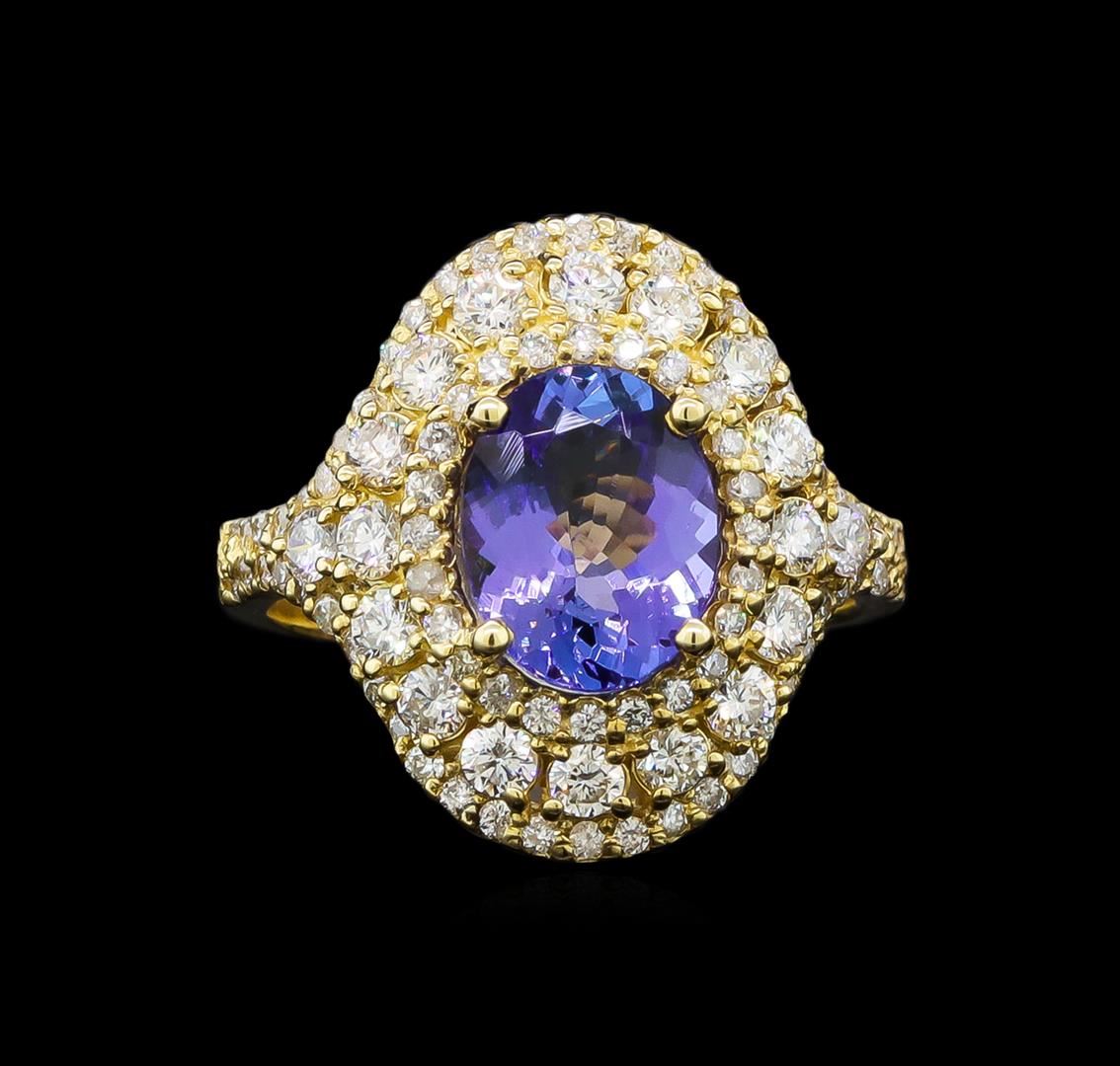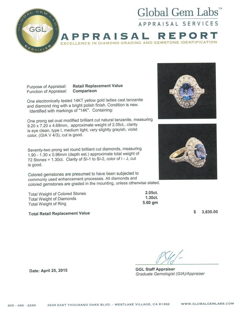 One electronically tested 14KT yellow gold ladies cast tanzanite and diamond ring with a bright polish finish. Identified with markings of "14K". Condition is new. Containing: One prong set oval modified brilliant cut natural tanzanite, measuring 9.20 x 7.20 x 4.68mm, approximate weight of 2.05ct., clarity is eye clean, type I, medium light, very slightly grayish, violet color, (GIA V 4/3), cut is good. Seventy-Two prong set round brilliant cut diamonds, measuring 1.90 - 1.30 x 0.96mm (depth est.) approximate total weight of 72 Stones = 1.30ct. Clarity: SI-1 to SI-2. Color: I - J, Cut is Good. Colored gemstones are presumed to have been subjected to commonly used enhancement processes. All diamonds and colored gemstones are graded in the mounting, unless otherwise stated. Total Weight of Colored Stones 2.05ct. Total Weight of Diamonds 1.30ct. Total Weight of Ring 5.60 grams. GGL Appraised at $3,630.00.