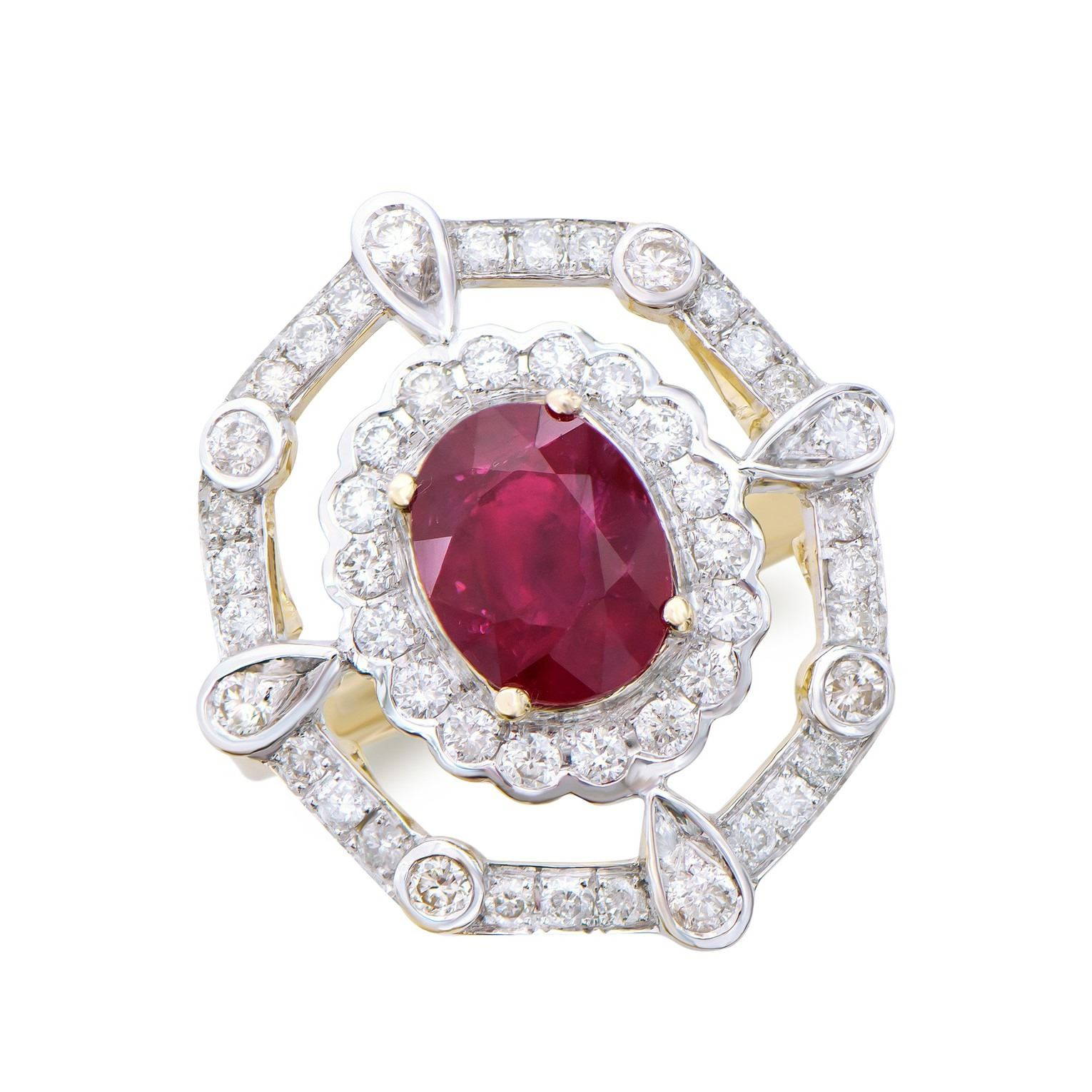 (1) Ruby with a total weight of 2.05cts. (50) round Diamonds with a total weight of 1.02cts with a color of H-I and clarity of I2-I3. Total weight of the ring is 4.60 grams. Ring size 7.5.
