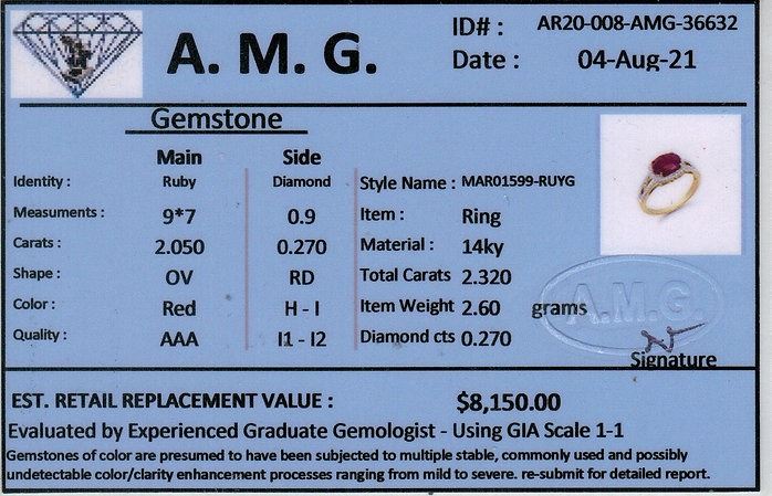 (1) Ruby with a total weight of 2.05cts. (64) round Diamonds with a total weight of 0.27cts with a color of H-I and clarity of I1-I2. Total weight of this ring is 2.60 grams. Ring size is 7.5.