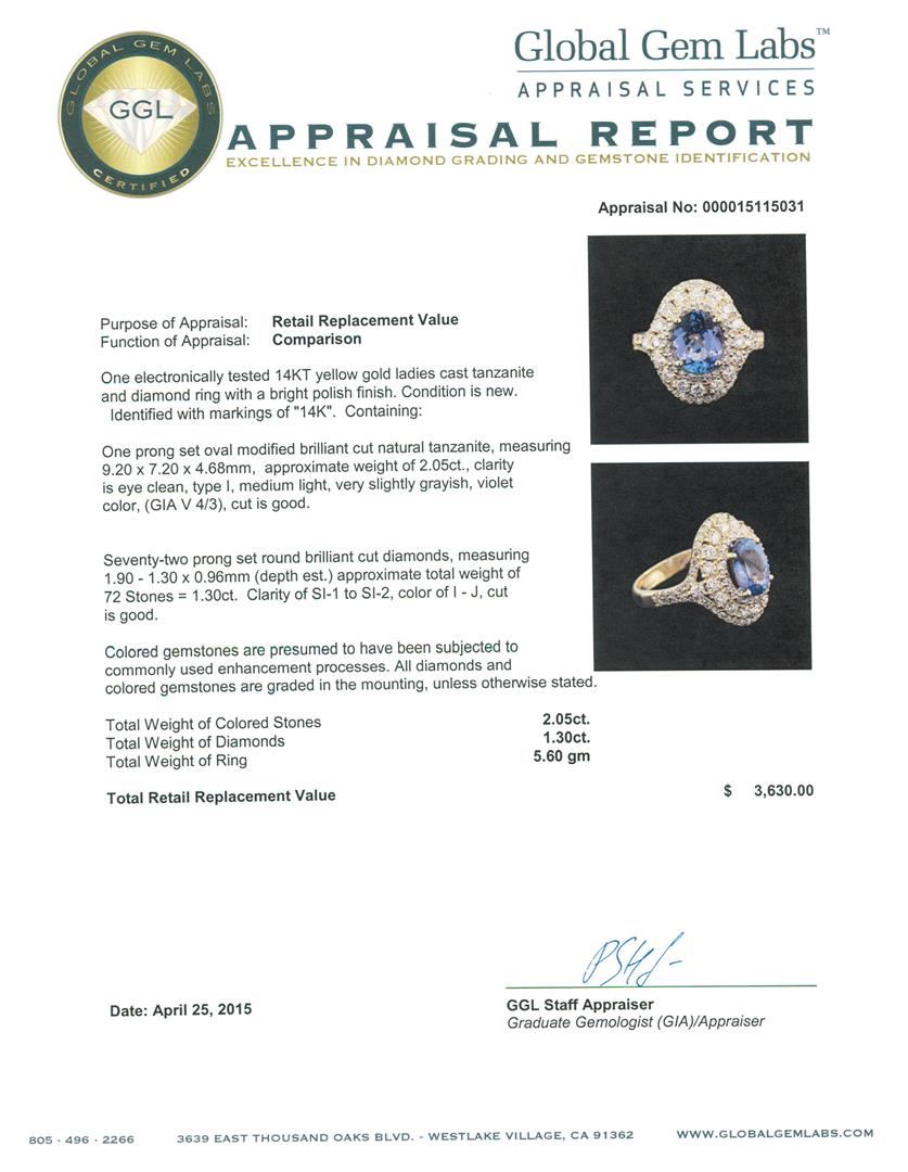 One electronically tested 14KT yellow gold ladies cast tanzanite and diamond ring with a bright polish finish. Identified with markings of "14K". Condition is new. Containing: One prong set oval modified brilliant cut natural tanzanite, measuring 9.20 x 7.20 x 4.68mm, approximate weight of 2.05ct., clarity is eye clean, type I, medium light, very slightly grayish, violet color, (GIA V 4/3), cut is good. Seventy-Two prong set round brilliant cut diamonds, measuring 1.90 - 1.30 x 0.96mm (depth est.) approximate total weight of 72 Stones = 1.30ct. Clarity: SI-1 to SI-2. Color: I - J, Cut is Good. Colored gemstones are presumed to have been subjected to commonly used enhancement processes. All diamonds and colored gemstones are graded in the mounting, unless otherwise stated. Total Weight of Colored Stones 2.05ct. Total Weight of Diamonds 1.30ct. Total Weight of Ring 5.60 grams. GGL Appraised at $3,630.00.