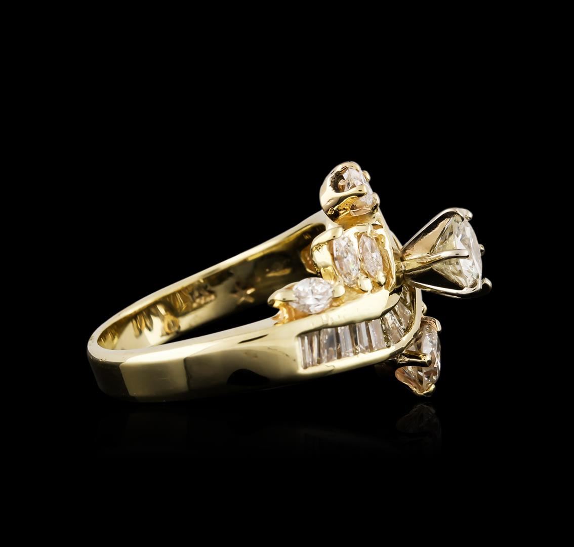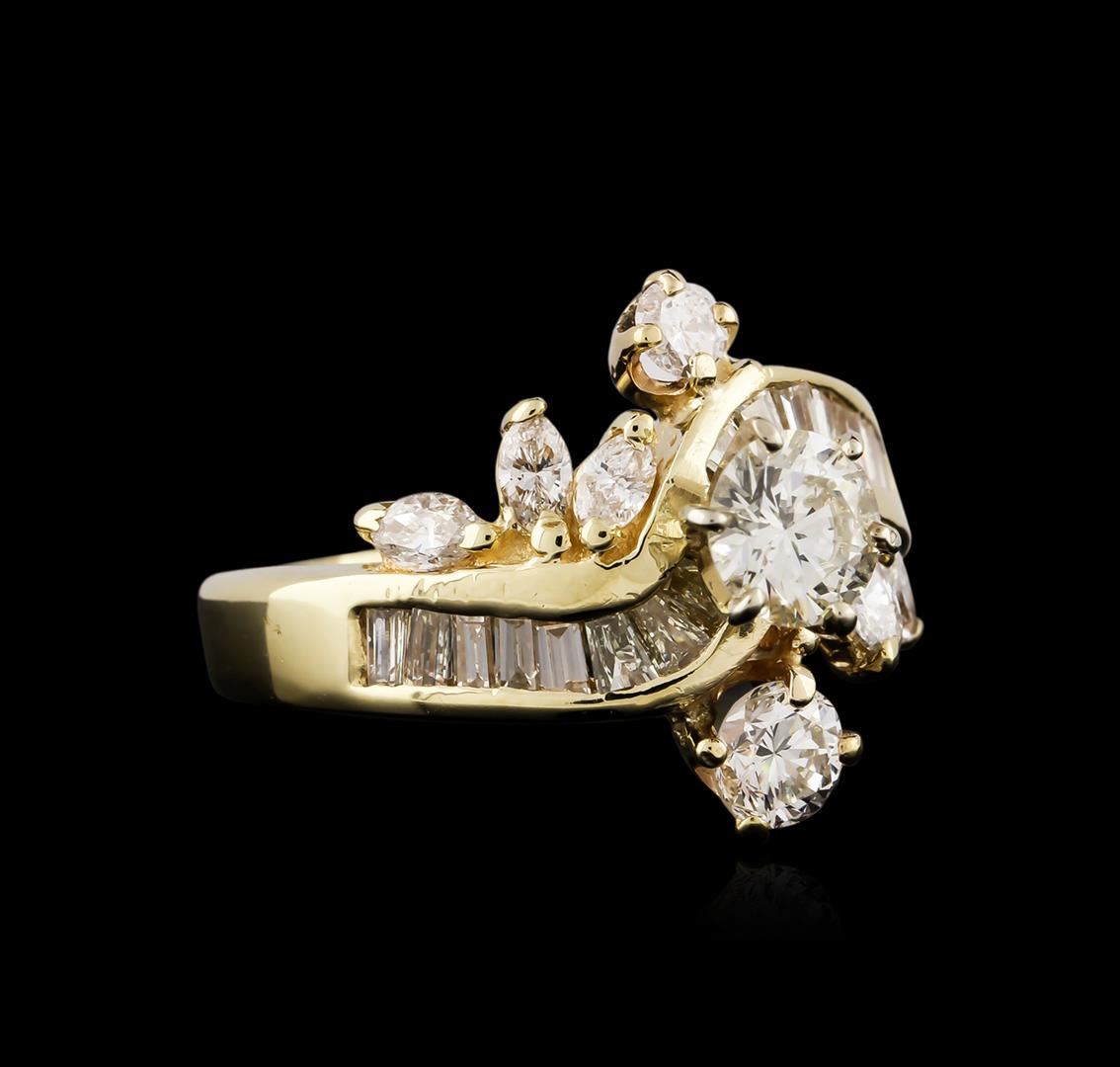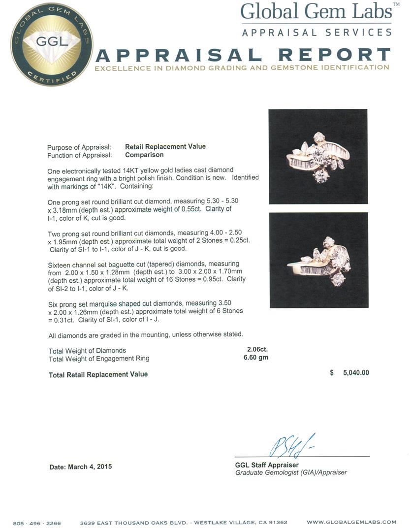 One electronically tested 14KT yellow gold ladies cast diamond engagement ring with a bright polish finish. Identified with markings of "14K". Condition is new. Containing: One prong set round brilliant cut diamond, measuring 5.30 - 5.30 x 3.18mm (depth est.) approximate weight of 0.55ct. Clarity: I-1. Color: K, Cut is Good. Two prong set round brilliant cut diamonds, measuring 4.00. - 2.50 x 1.95mm (depth est.) approximate total weight of 2 Stones = 0.25ct. Clarity: SI-1 to I-1. Color: J - K, Cut is Good. Sixteen channel set baguette cut (tapered) diamonds, measuring from 2.00. x 1.50 x 1.28mm (depth est.) to 3.00. x 2.00. x 1.70mm (depth est.) approximate total weight of 16 Stones = 0.95ct. Clarity: SI-2 to I-1. Color: J - K. Six prong set marquise shaped cut diamonds, measuring 3.50 x 2.00. x 1.26mm (depth est.) approximate total weight of 6 Stones = 0.31ct. Clarity: SI-1. Color: I - J. All diamonds are graded in the mounting, unless otherwise stated. Total Weight of Diamonds 2.06ct. Total Weight of Engagement Ring 6.60 grams. GGL Appraised at $5,040.00.