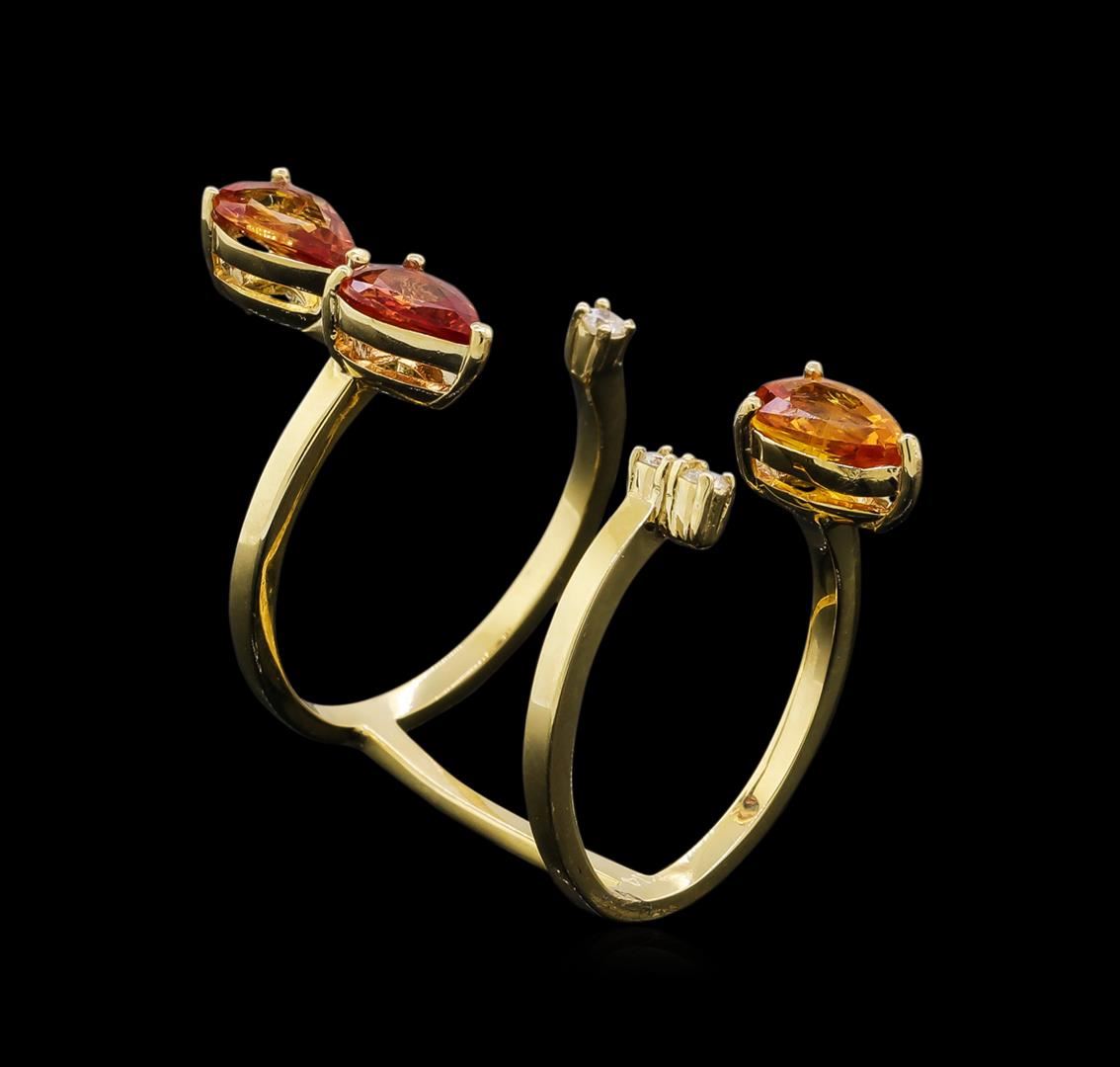 One electronically tested 14KT yellow gold ladies cast sapphire and diamond ring with a bright polish finish. Identified with markings of "K14". Condition is new. Containing: Three prong set pear modified brilliant cut natural orange sapphires, measuring 7.00 x 5.00 x 3.25mm, approximate total weight of 2.06ct., clarity is moderately included, type II, medium light, brownish, orange color, (GIA O 4/3), cut is good. Three prong set round brilliant cut diamonds, measuring 1.80 - 1.80 x 1.08mm (depth est.) approximate total weight of 3 Stones = 0.07ct. Clarity: SI-1 to SI-2. Color: J - K, Cut is Good. Colored gemstones are presumed to have been subjected to commonly used enhancement processes. All diamonds and colored gemstones are graded in the mounting, unless otherwise stated. Total Weight of Colored Stones 2.06ct. Total Weight of Diamonds 0.07ct. Total Weight of Ring 4.40 grams. GGL Appraised at $1,680.00.