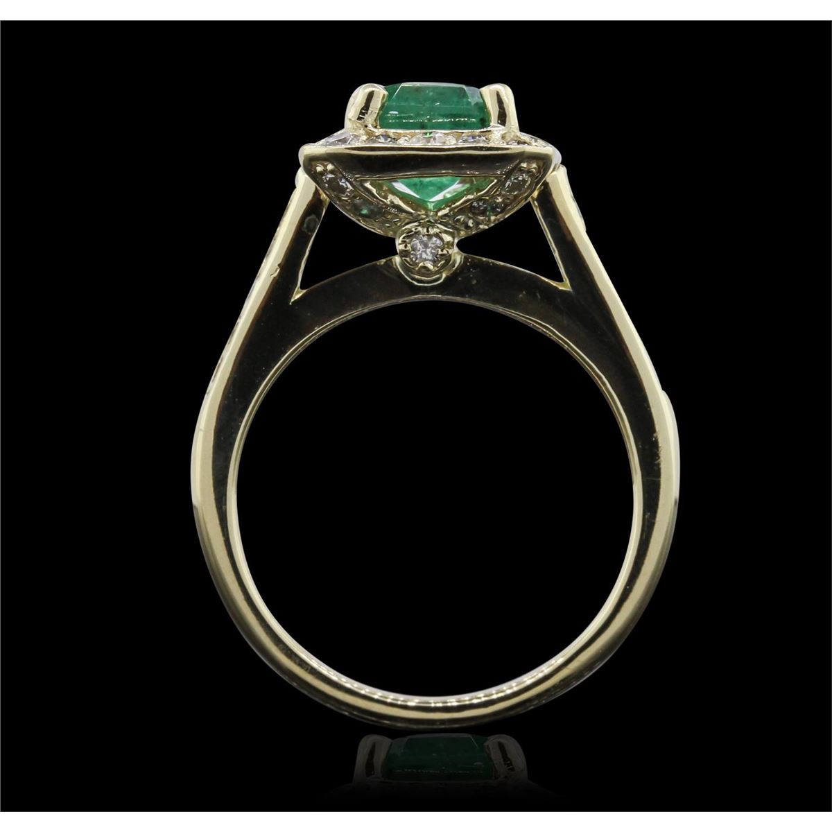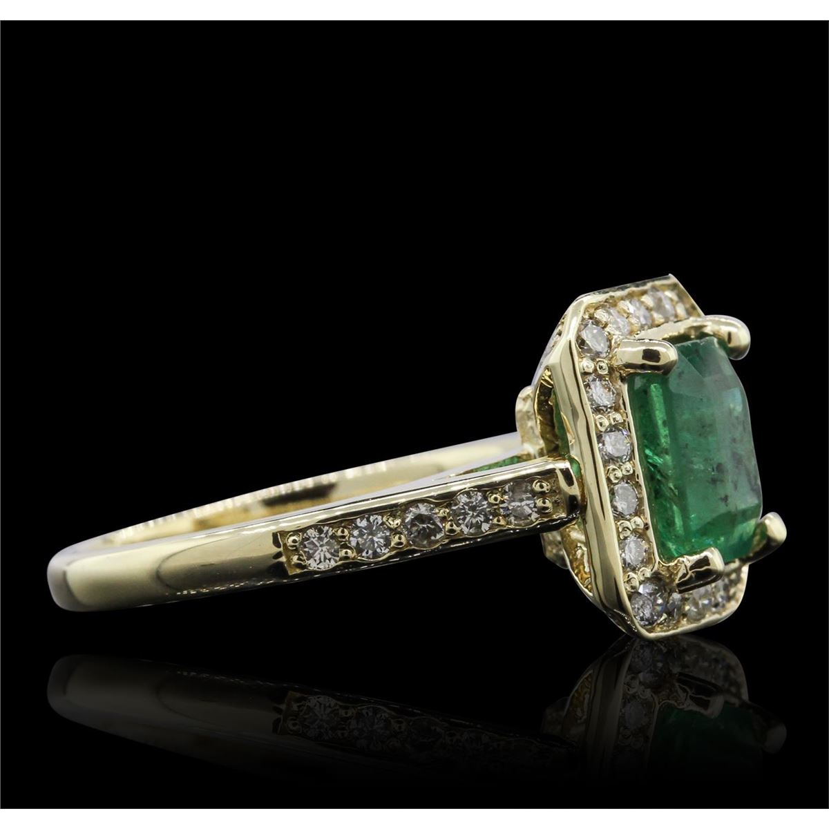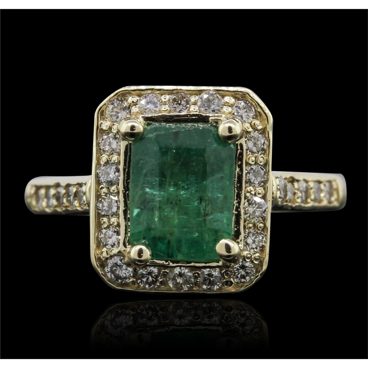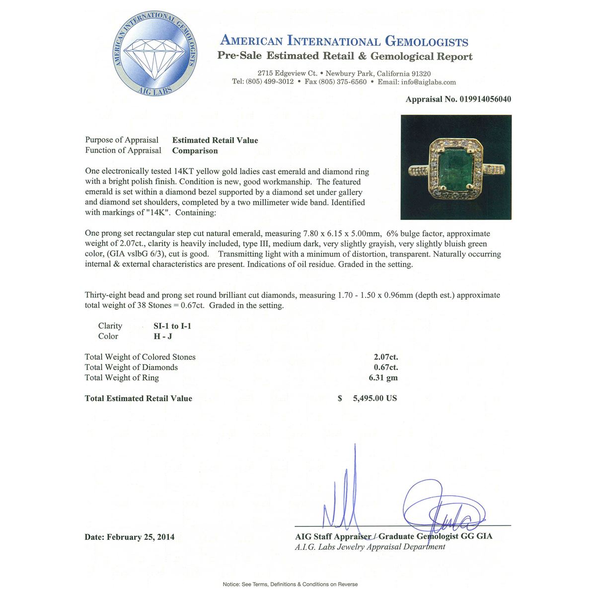 One electronically tested 14KT yellow gold ladies cast emerald and diamond ring with a bright polish finish. Condition is new, good workmanship. The featured emerald is set within a diamond bezel supported by a diamond set under gallery and diamond set shoulders, completed by a two millimeter wide band. Identified with markings of "14K". Containing: One prong set rectangular step cut natural emerald, measuring 7.80 x 6.15 x 5.00mm, 6% bulge factor, approximate weight of 2.07ct, clarity is heavily included, type III, medium dark, very slightly grayish, very slightly bluish green color, (GIA vslbG 6/3), cut is good. Transmitting light with a minimum of distortion, transparent. Naturally occurring internal & external characteristics are present. Indications of oil residue. Graded in the setting. Thirty-Eight bead and prong set round brilliant cut diamonds, measuring 1.70 - 1.50 x 0.96mm (depth est.) approximate total weight of 38 Stones = 0.67ct. Graded in the setting. Clarity SI-1 to I-1 Color H - J Total Weight of Colored Stones 2.07ct. Total Weight of Diamonds 0.67ct. Total Weight of Ring 6.31 grams. AIG Appraised at $5,495.00.