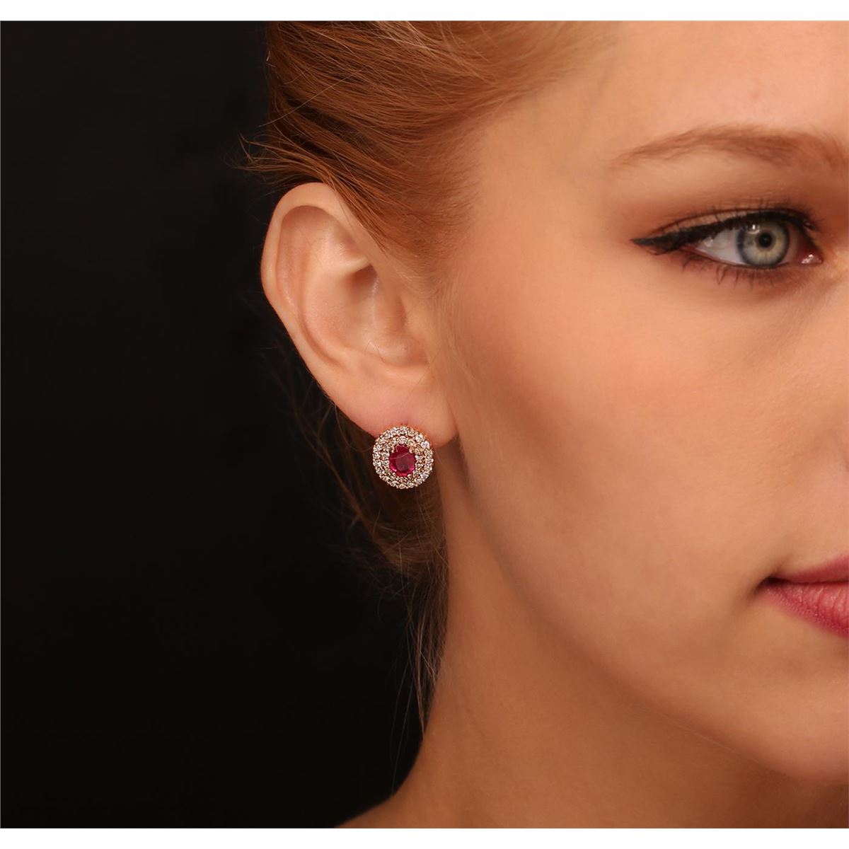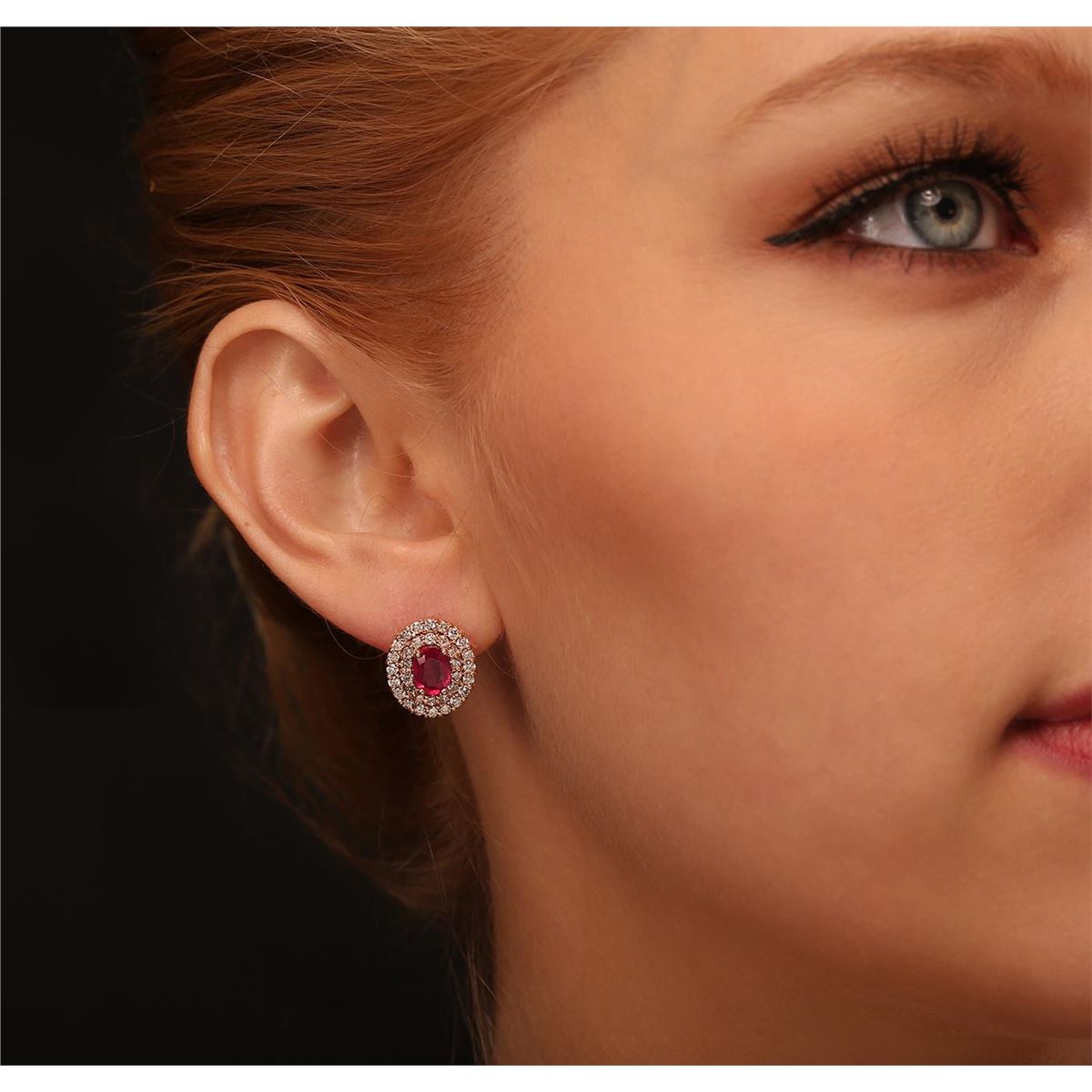 One pair electronically tested 14KT yellow gold Ladies combination cast & assembled stud earrings with friction posts with a bright polish finish. Condition is new. Identified with markings of "14K". Containing: Two prong set oval modified brilliant cut natural rubies, measuring 6.89 x 5.02 x 2.65mm, approximate. Total Weight of 2.07ct., clarity is heavily included, medium, moderately strong, strongly purplish red color, (GIA stpR 5/4), cut is good. Colored gemstones are presumed to have been subjected to commonly used color/clarity enhancement processes. Seventy-Two prong set round brilliant cut diamonds, measuring 1.50 - 1.50 x 0.90mm (depth est.) approximate. Total Weight of 72 Stones = 1.41ct. Clarity: I-1 to I-2. Color: J - K, Cut is Good. Total Weight of Colored Stones 2.07ct. Total Weight of Diamonds 1.41ct. Total Weight of Earrings 5.00 grams. GGL Appraised at $4,675.00.
