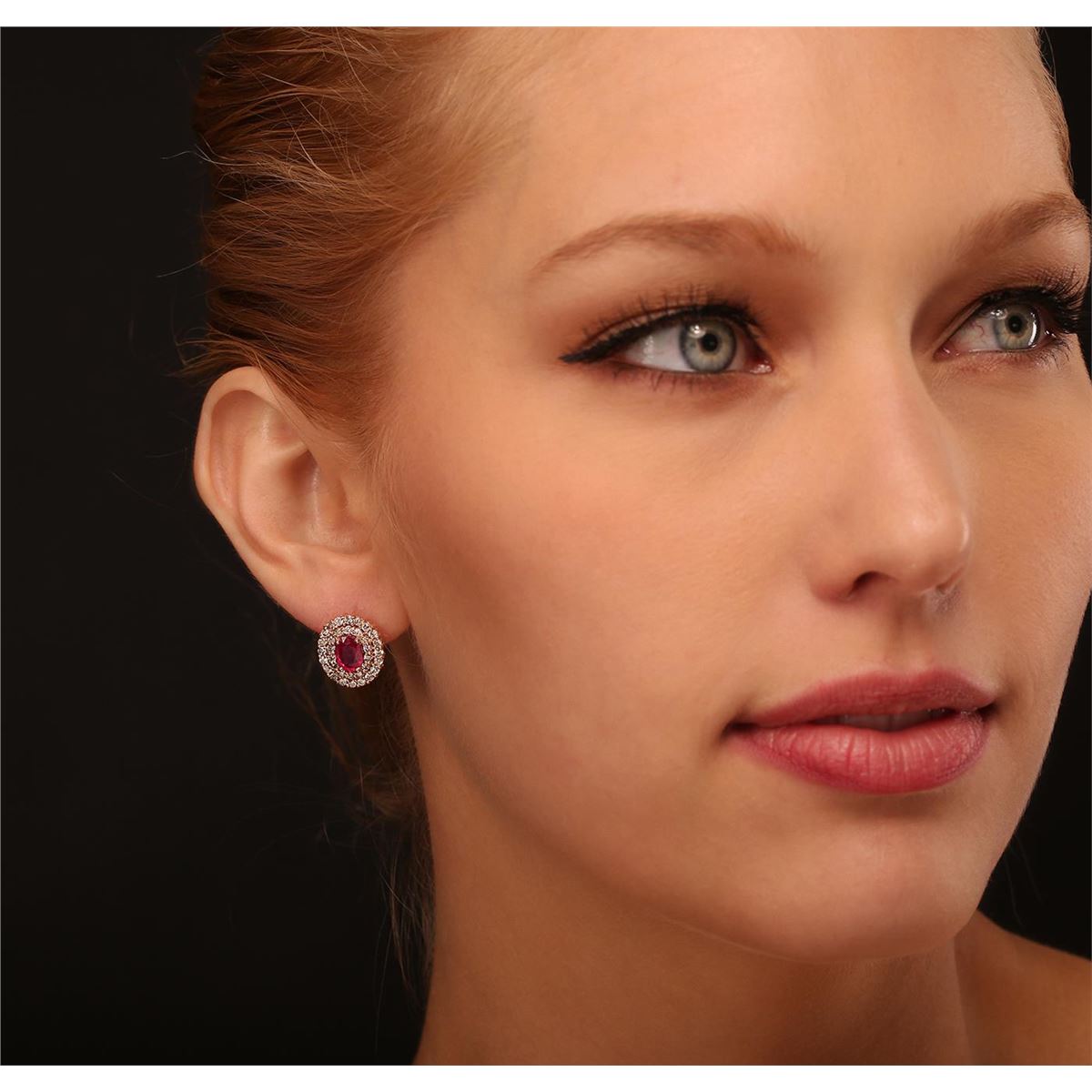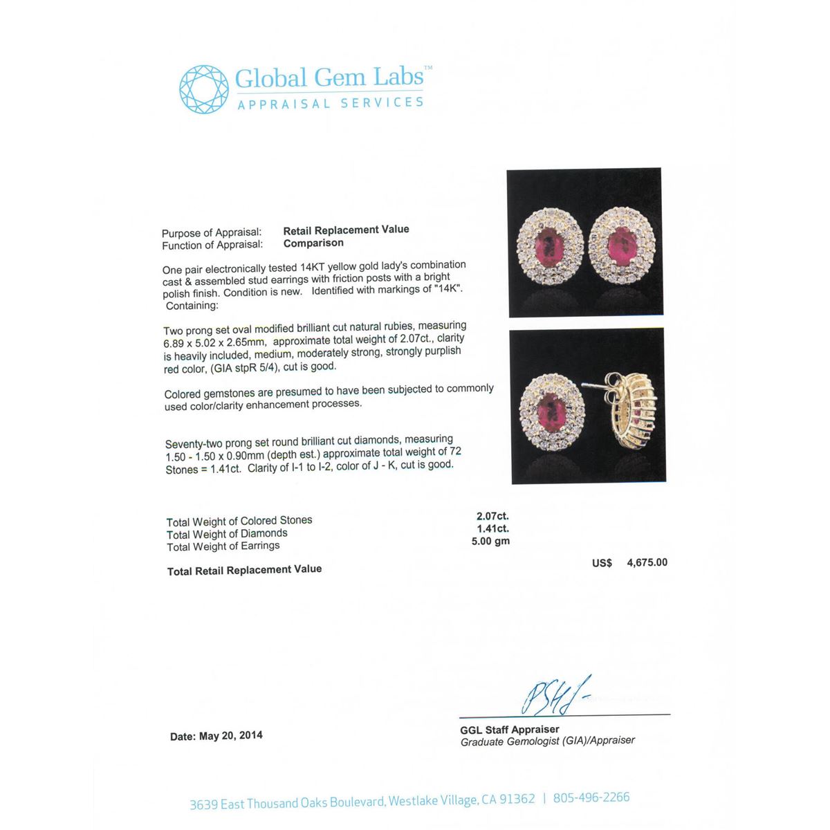 One pair electronically tested 14KT yellow gold Ladies combination cast & assembled stud earrings with friction posts with a bright polish finish. Condition is new. Identified with markings of "14K". Containing: Two prong set oval modified brilliant cut natural rubies, measuring 6.89 x 5.02 x 2.65mm, approximate. Total Weight of 2.07ct., clarity is heavily included, medium, moderately strong, strongly purplish red color, (GIA stpR 5/4), cut is good. Colored gemstones are presumed to have been subjected to commonly used color/clarity enhancement processes. Seventy-Two prong set round brilliant cut diamonds, measuring 1.50 - 1.50 x 0.90mm (depth est.) approximate. Total Weight of 72 Stones = 1.41ct. Clarity: I-1 to I-2. Color: J - K, Cut is Good. Total Weight of Colored Stones 2.07ct. Total Weight of Diamonds 1.41ct. Total Weight of Earrings 5.00 grams. GGL Appraised at $4,675.00.