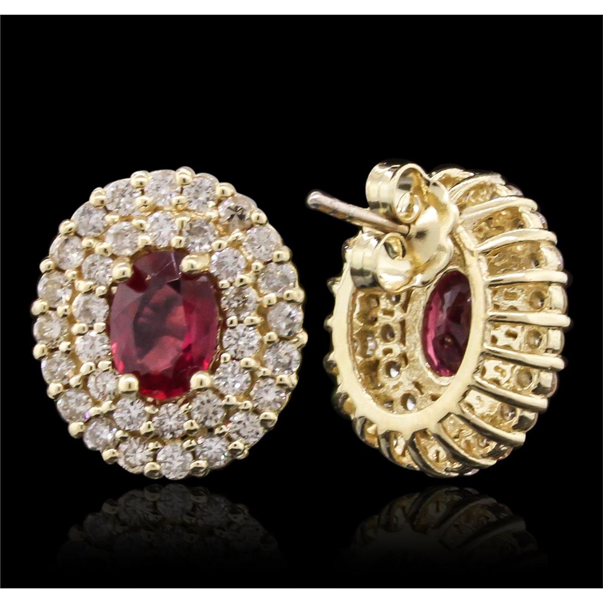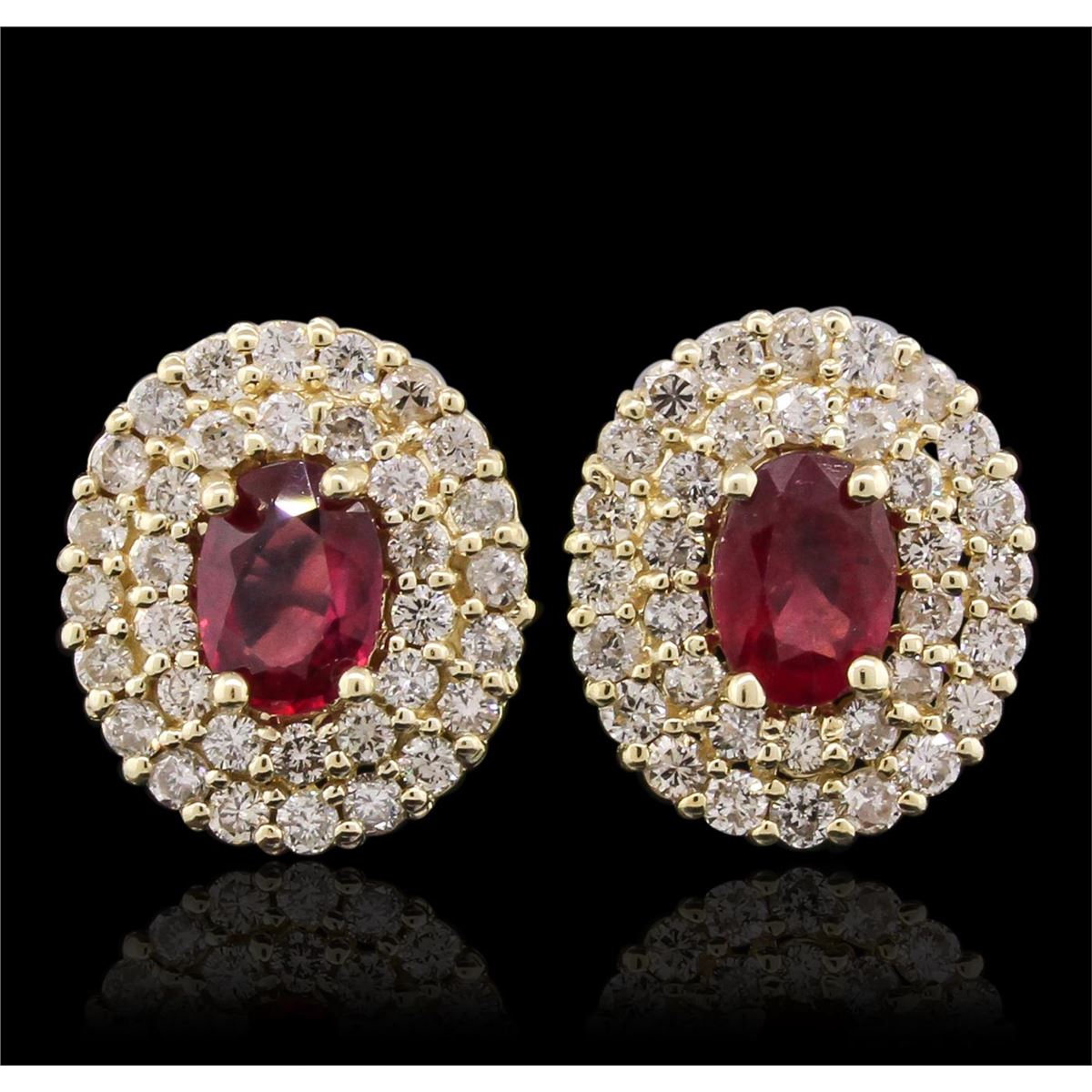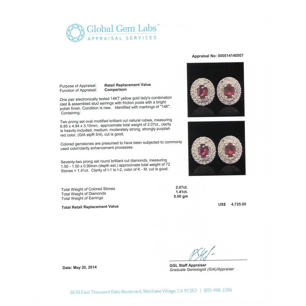 One pair electronically tested 14KT yellow gold Ladies combination cast & assembled stud earrings with friction posts with a bright polish finish. Condition is new. Identified with markings of "14K". Containing: Two prong set oval modified brilliant cut natural rubies, measuring 6.85 x 4.94 x 3.10mm, approximate. Total Weight of 2.07ct., clarity is heavily included, medium, moderately strong, strongly purplish red color, (GIA stpR 5/4), cut is good. Colored gemstones are presumed to have been subjected to commonly used color/clarity enhancement processes. Seventy-Two prong set round brilliant cut diamonds, measuring 1.50 - 1.50 x 0.90mm (depth est.) approximate. Total Weight of 72 Stones = 1.41ct. Clarity: I-1 to I-2. Color: K - M, Cut is Good. Total Weight of Colored Stones 2.07ct. Total Weight of Diamonds 1.41ct. Total Weight of Earrings 5.00 grams. GGL Appraised at $4,725.00.