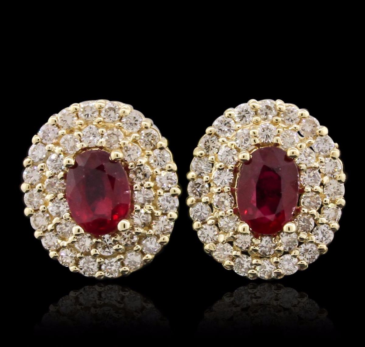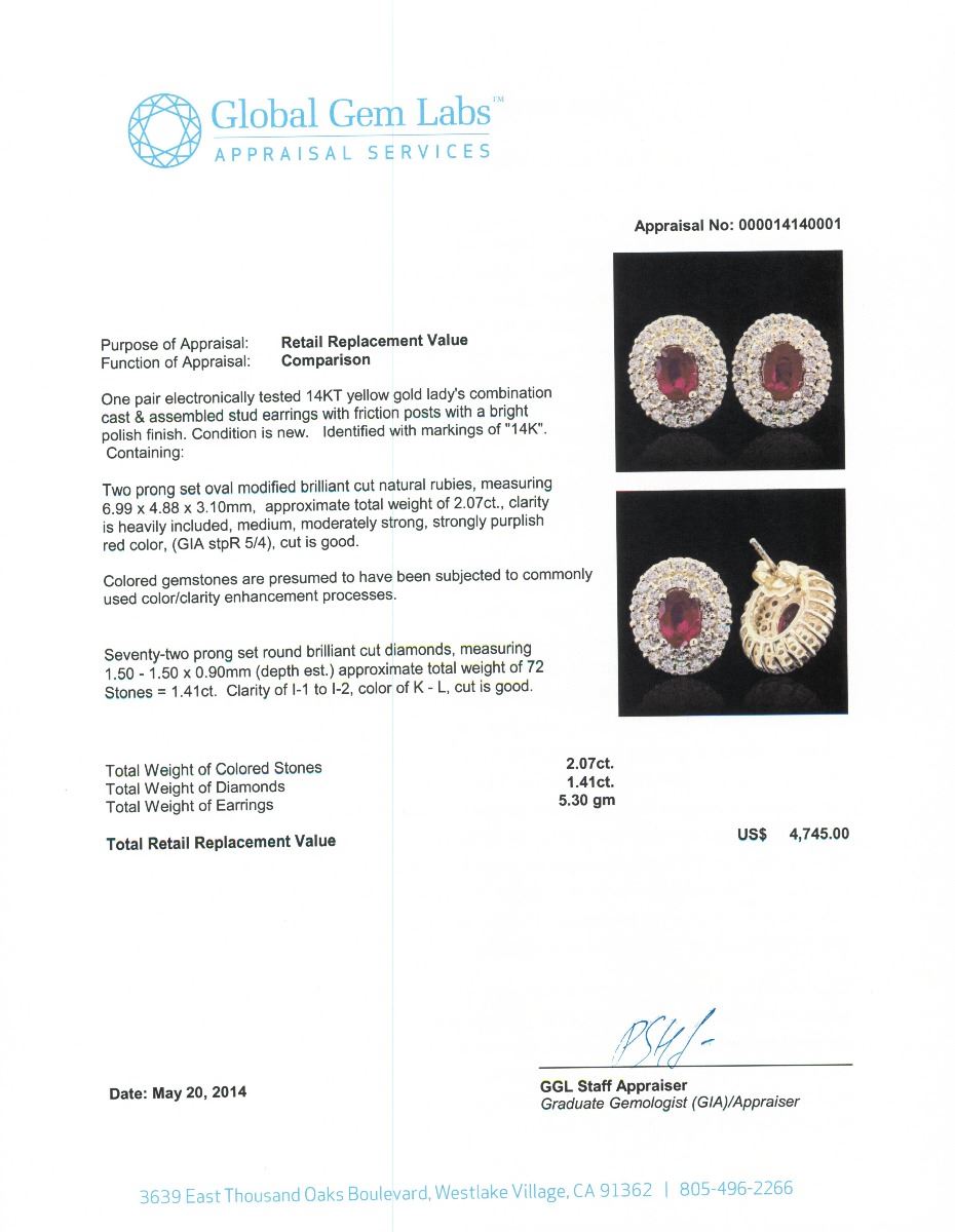 One pair electronically tested 14KT yellow gold Ladies combination cast & assembled stud earrings with friction posts with a bright polish finish. Condition is new. Identified with markings of "14K". Containing: Two prong set oval modified brilliant cut natural rubies, measuring 6.99 x 4.88 x 3.10mm, approximate. Total Weight of 2.07ct., clarity is heavily included, medium, moderately strong, strongly purplish red color, (GIA stpR 5/4), cut is good. Colored gemstones are presumed to have been subjected to commonly used color/clarity enhancement processes. Seventy-Two prong set round brilliant cut diamonds, measuring 1.50 - 1.50 x 0.90mm (depth est.) approximate. Total Weight of 72 Stones = 1.41ct. Clarity: I-1 to I-2. Color: K - L, Cut is Good. Total Weight of Colored Stones 2.07ct. Total Weight of Diamonds 1.41ct. Total Weight of Earrings 5.30 grams. GGL Appraised at $4,745.00.