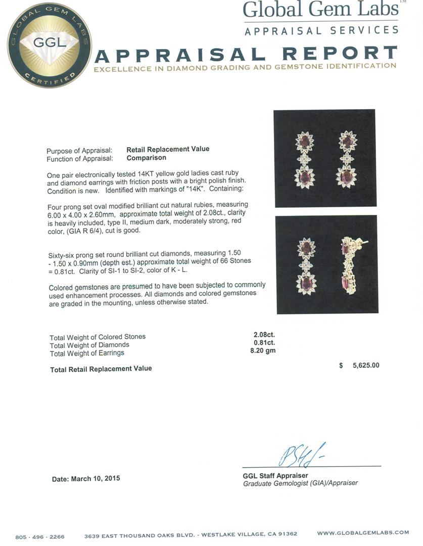 One pair electronically tested 14KT yellow gold ladies cast ruby and diamond earrings with friction posts with a bright polish finish. Identified with markings of "14K". Condition is new. Containing: Four prong set oval modified brilliant cut natural rubies, measuring 6.00 x 4.00 x 2.60mm, approximate total weight of 2.08ct., clarity is heavily included, type II, medium dark, moderately strong, red color, (GIA R 6/4), cut is good. Sixty-Six prong set round brilliant cut diamonds, measuring 1.50 - 1.50 x 0.90mm (depth est.) approximate total weight of 66 Stones = 0.81ct. Clarity: SI-1 to SI-2. Color: K - L. Colored gemstones are presumed to have been subjected to commonly used enhancement processes. All diamonds and colored gemstones are graded in the mounting, unless otherwise stated. Total Weight of Colored Stones 2.08ct. Total Weight of Diamonds 0.81ct. Total Weight of Earrings 8.20 grams. GGL Appraised at $5,625.00.