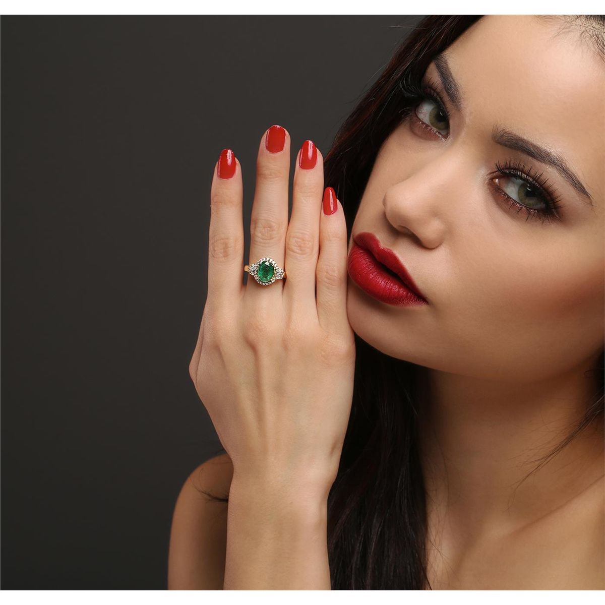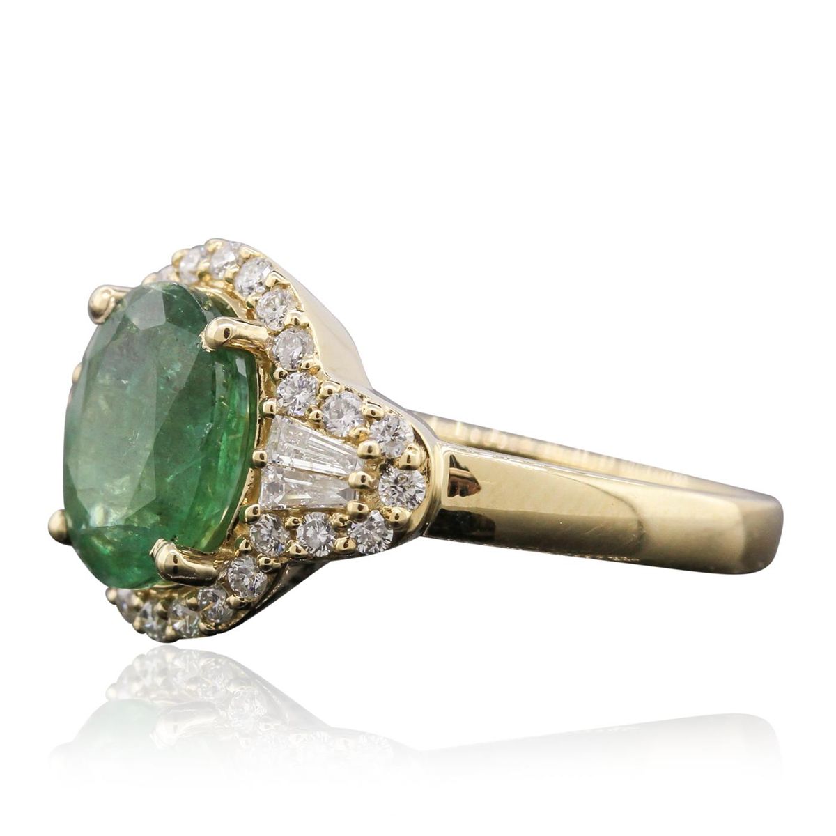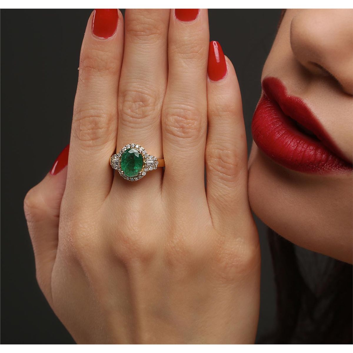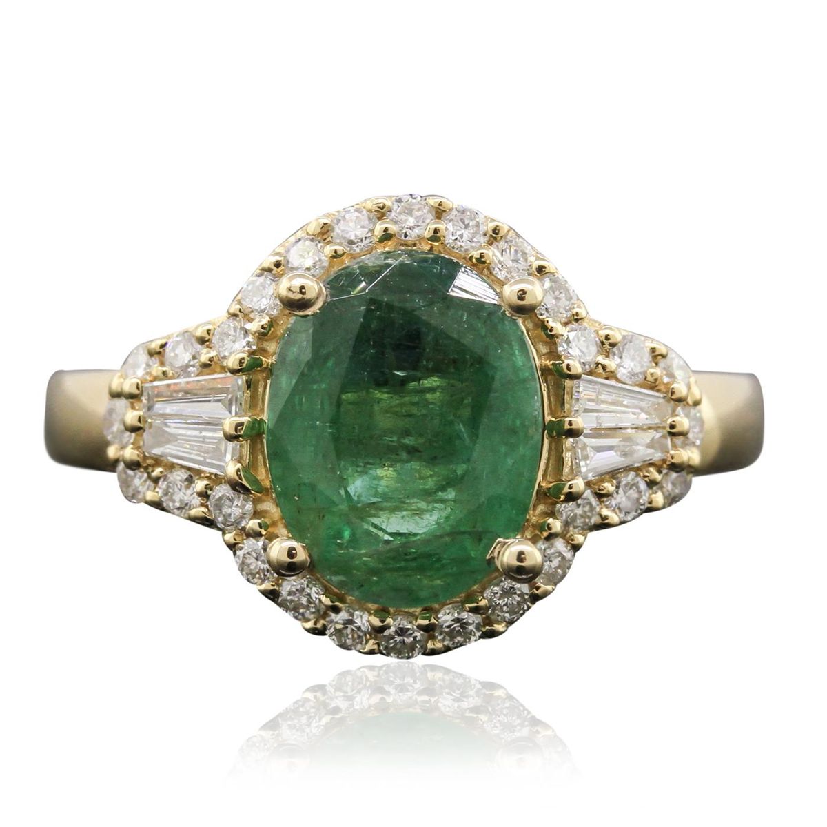 One electronically tested 14KT yellow gold Ladies combination cast & assembled ring with a bright polish finish. Condition is new. Identified with markings of "14K". Containing: One prong set oval modified brilliant cut natural emerald, measuring 10.00 x 7.60 x 4.94mm, approximate weight of 2.08ct., clarity is heavily included, type III, medium light, moderately strong, green color, (GIA G 4/4), cut is good. Colored gemstones are presumed to have been subjected to commonly used color/clarity enhancement processes. Twenty-Eight bead set round brilliant cut diamonds, measuring 1.30 - 1.30 x 0.78mm (depth est.) approximate. Total Weight of 28 Stones = 0.22ct. Clarity: I-1 to I-2. Color: I - J, Cut is Good. Four prong set baguette cut diamonds, measuring 3.00 x 1.50 x 1.28mm (depth est.) approximate. Total Weight of 4 Stones = 0.21ct. Clarity: SI-2 to I-1. Color: H - I, Cut is Good. Total Weight of Colored Stones 2.08ct. Total Weight of Diamonds 0.44ct. Total Weight of Ring 5.70 grams. GGL Appraised at $6,965.00.