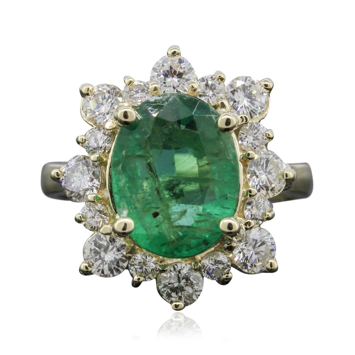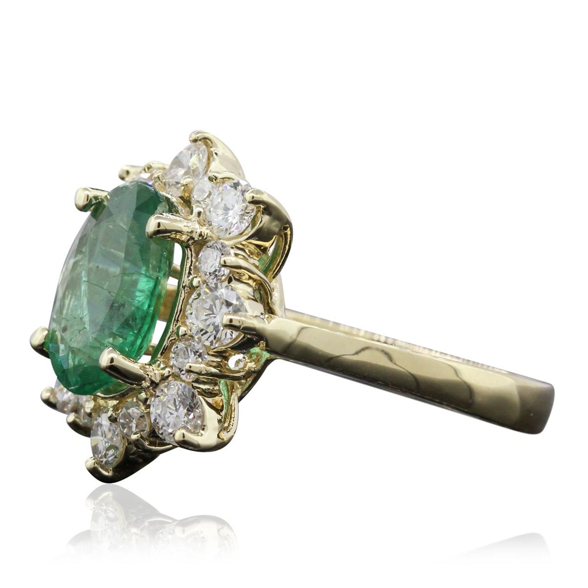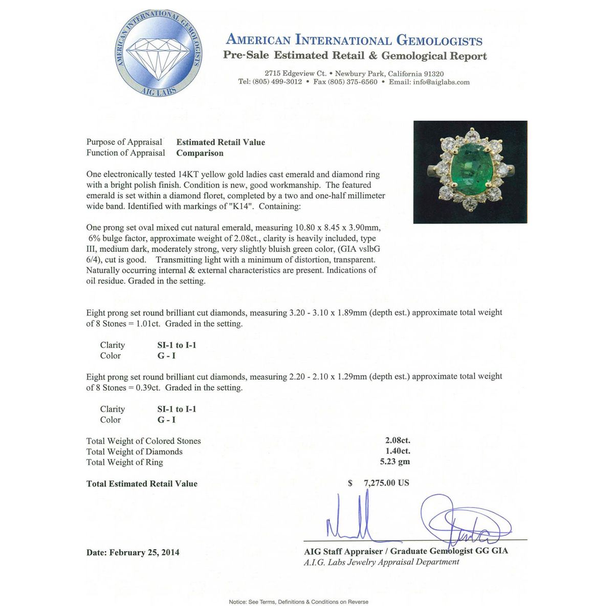 One electronically tested 14KT yellow gold ladies cast emerald and diamond ring with a bright polish finish. Condition is new, good workmanship. The featured emerald is set within a diamond floret, completed by a two and one-half millimeter wide band. Identified with markings of "K14". Containing: One prong set oval mixed cut natural emerald, measuring 10.80 x 8.45 x 3.90mm, 6% bulge factor, approximate weight of 2.08ct, clarity is heavily included, type III, medium dark, moderately strong, very slightly bluish green color, (GIA vslbG 6/4), cut is good. Transmitting light with a minimum of distortion, transparent. Naturally occurring internal & external characteristics are present. Indications of oil residue. Graded in the setting. Eight prong set round brilliant cut diamonds, measuring 3.20 - 3.10 x 1.89mm (depth est.) approximate total weight of 8 Stones = 1.01ct. Graded in the setting. Clarity SI-1 to I-1 Color G - I Eight prong set round brilliant cut diamonds, measuring 2.20 - 2.10 x 1.29mm (depth est.) approximate total weight of 8 Stones = 0.39ct. Graded in the setting. Clarity SI-1 to I-1 Color G - I Total Weight of Colored Stones 2.08ct. Total Weight of Diamonds 1.40ct. Total Weight of Ring 5.23 grams. AIG Appraised at $7,275.00.