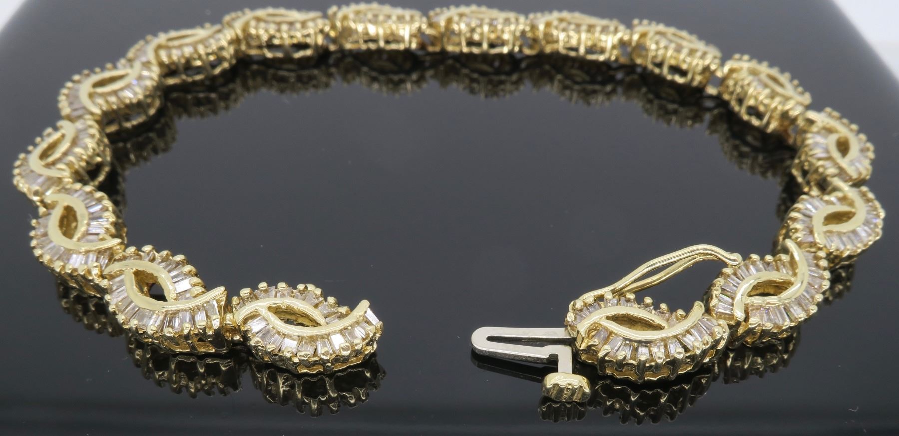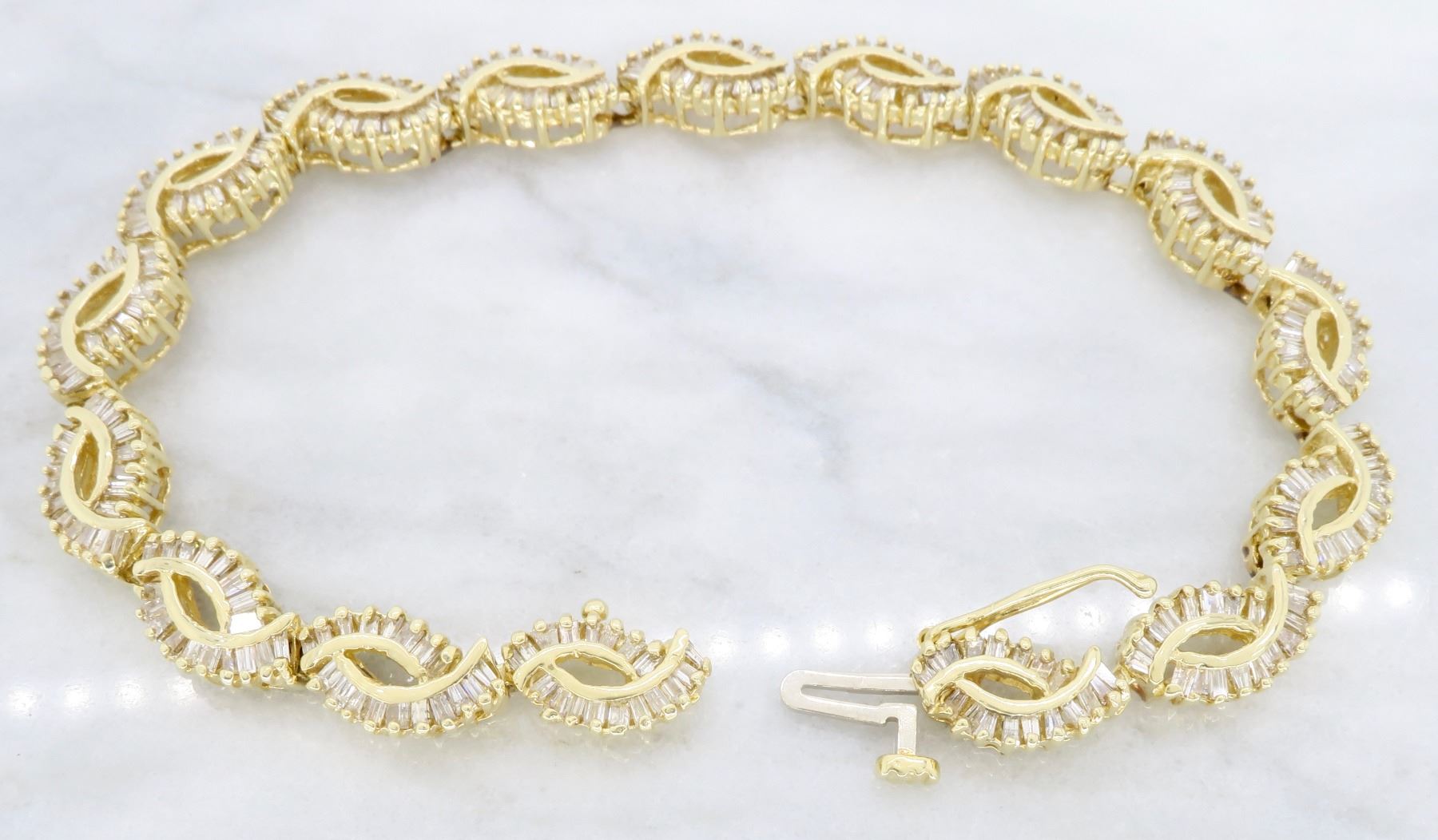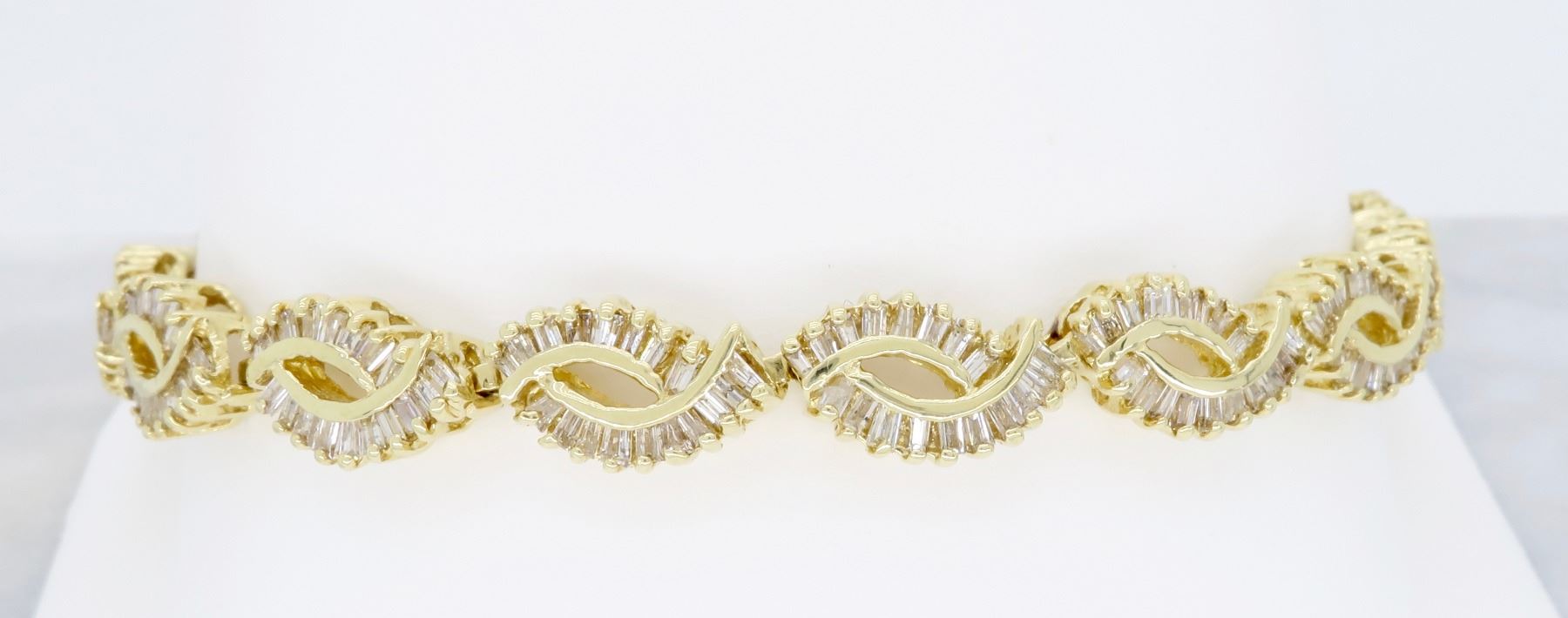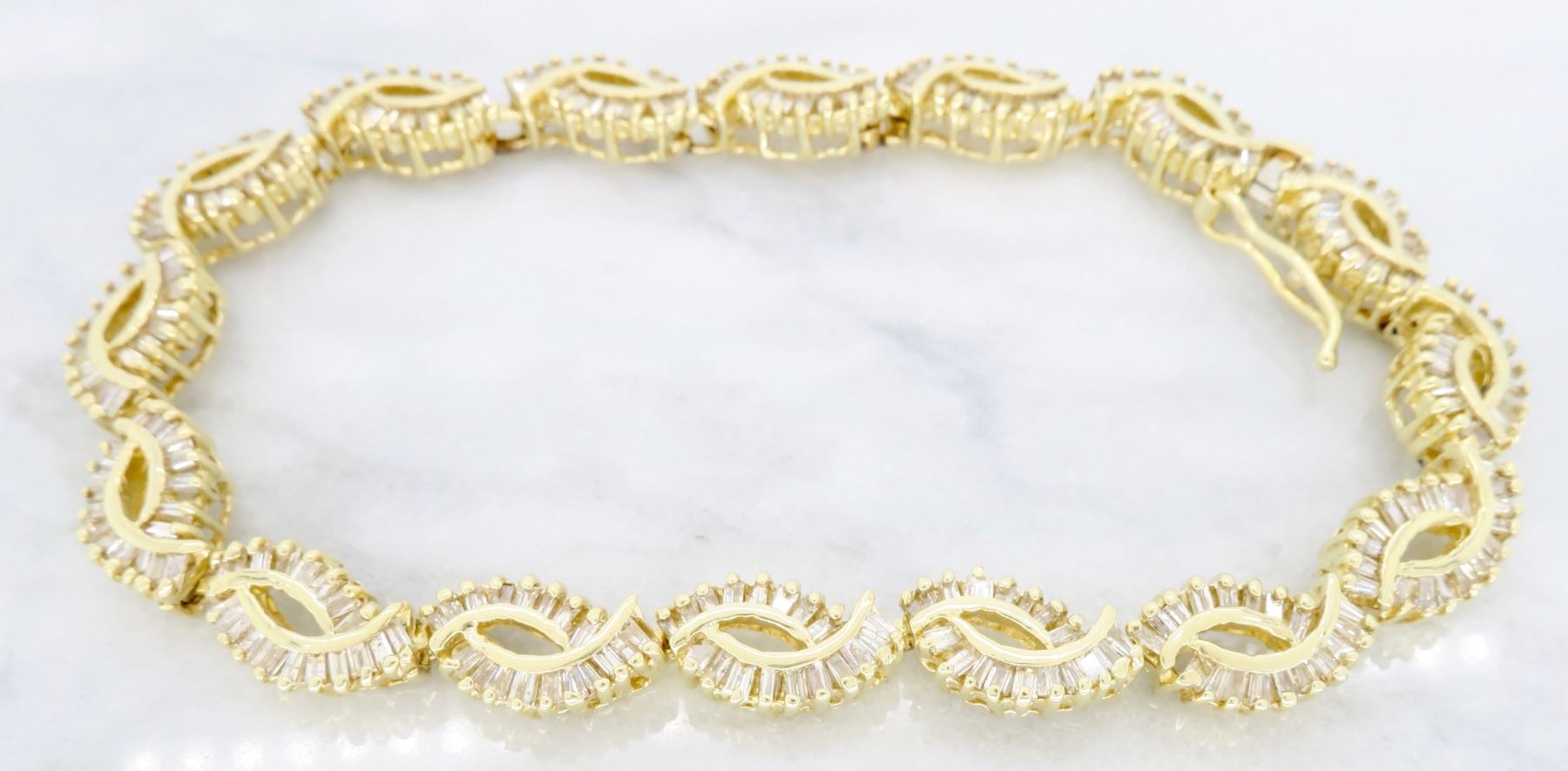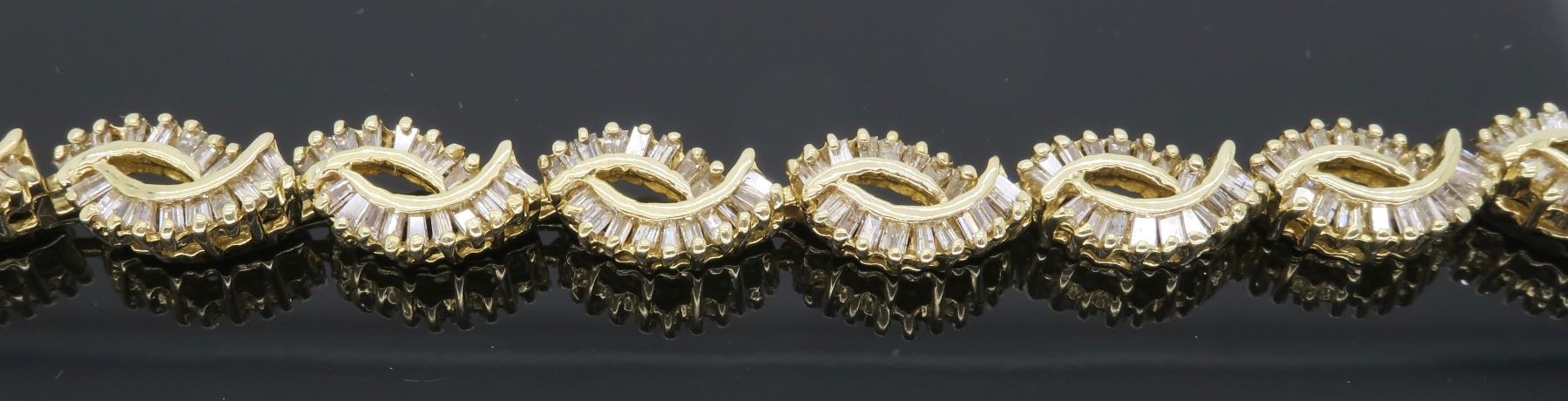 One 14KT Yellow Gold 2.08ctw Diamond Bracelet. Baguette Diamonds with a total weight of 2.08cts with a color of H-J and clarity of I-1. Length of this bracelet is 7 inches. Total weight of 15.30 grams.