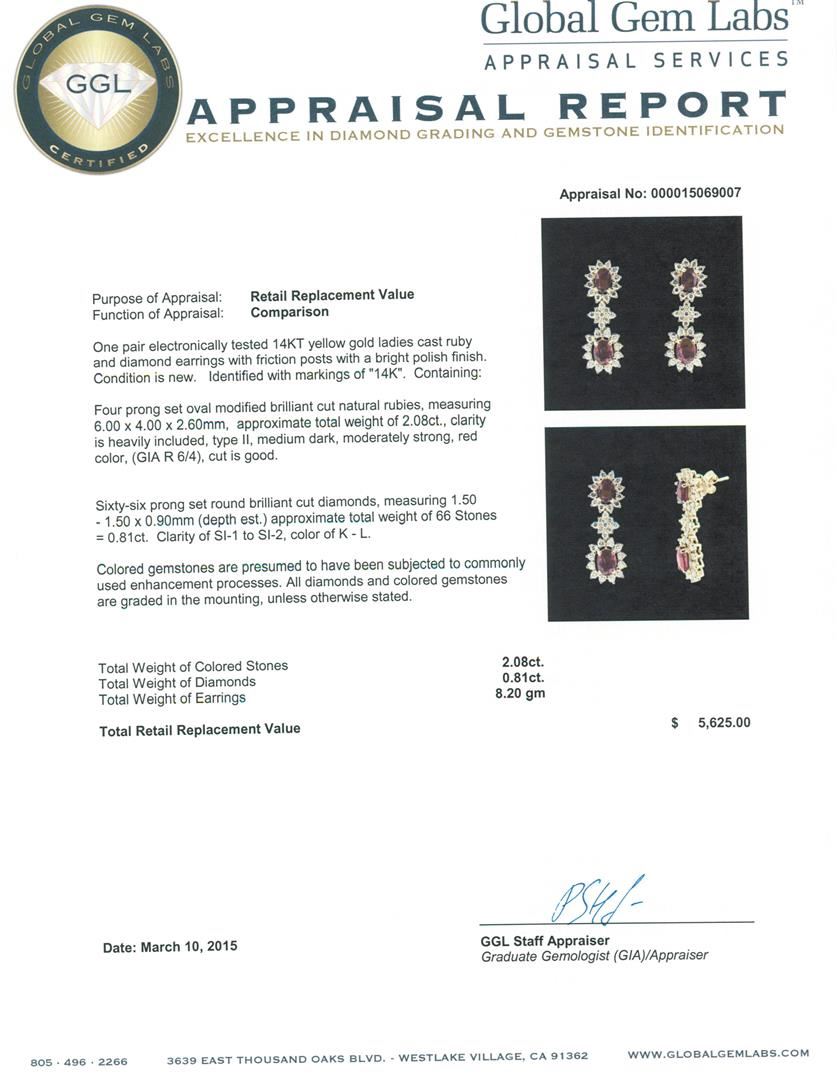 One pair electronically tested 14KT yellow gold ladies cast ruby and diamond earrings with friction posts with a bright polish finish. Identified with markings of "14K". Condition is new. Containing: Four prong set oval modified brilliant cut natural rubies, measuring 6.00 x 4.00 x 2.60mm, approximate total weight of 2.08ct., clarity is heavily included, type II, medium dark, moderately strong, red color, (GIA R 6/4), cut is good. Sixty-Six prong set round brilliant cut diamonds, measuring 1.50 - 1.50 x 0.90mm (depth est.) approximate total weight of 66 Stones = 0.81ct. Clarity: SI-1 to SI-2. Color: K - L. Colored gemstones are presumed to have been subjected to commonly used enhancement processes. All diamonds and colored gemstones are graded in the mounting, unless otherwise stated. Total Weight of Colored Stones 2.08ct. Total Weight of Diamonds 0.81ct. Total Weight of Earrings 8.20 grams. GGL Appraised at $5,625.00.