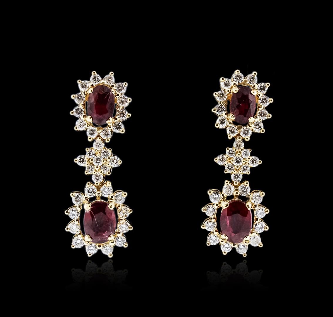 One pair electronically tested 14KT yellow gold ladies cast ruby and diamond earrings with friction posts with a bright polish finish. Identified with markings of "14K". Condition is new. Containing: Four prong set oval modified brilliant cut natural rubies, measuring 6.00 x 4.00 x 2.60mm, approximate total weight of 2.08ct., clarity is heavily included, type II, medium dark, moderately strong, red color, (GIA R 6/4), cut is good. Sixty-Six prong set round brilliant cut diamonds, measuring 1.50 - 1.50 x 0.90mm (depth est.) approximate total weight of 66 Stones = 0.81ct. Clarity: SI-1 to SI-2. Color: K - L. Colored gemstones are presumed to have been subjected to commonly used enhancement processes. All diamonds and colored gemstones are graded in the mounting, unless otherwise stated. Total Weight of Colored Stones 2.08ct. Total Weight of Diamonds 0.81ct. Total Weight of Earrings 8.20 grams. GGL Appraised at $5,625.00.
