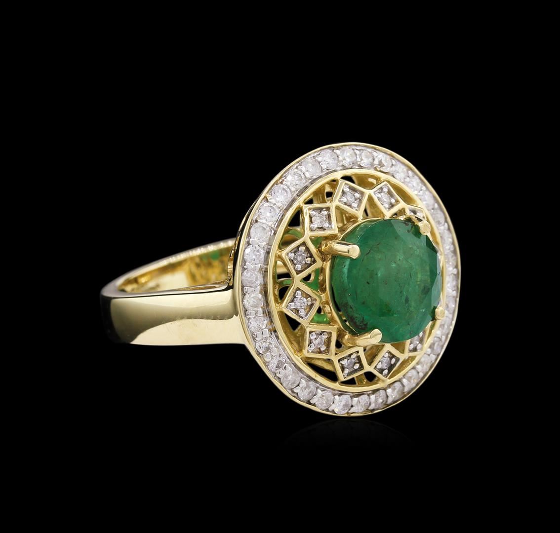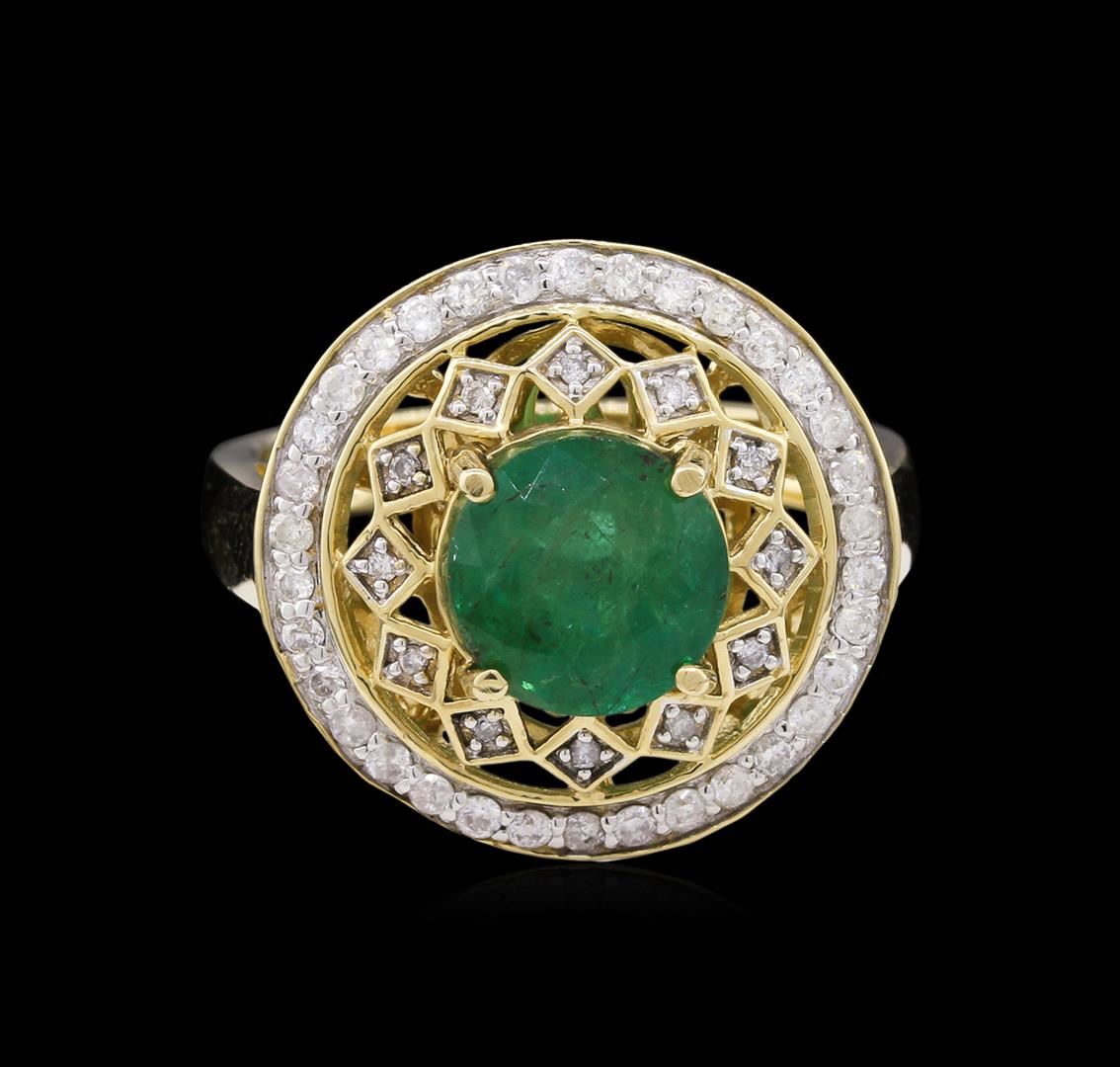 One electronically tested 14KT yellow gold Ladies cast ring with a bright polish finish. Condition is new. Identified with markings of "14K". Containing: One prong set round modified brilliant cut natural emerald, measuring 8.28 - 8.28 x 5.60 mm, approximate weight of 2.09ct., clarity is heavily included, type III, medium, moderately strong, green color, (GIA G 5/4), cut is good. Colored gemstones are presumed to have been subjected to commonly used color/clarity enhancement processes. Forty-Six prong set round brilliant cut diamonds, measuring 1.30 - 1.30 x 0.78mm (depth est.) approximate. Total Weight of 46 Stones = 0.37ct. Clarity: I-1 to I-2. Color: I - J, Cut is Good. Total Weight of Colored Stones 2.09ct. Total Weight of Diamonds 0.37ct. Total Weight of Ring 5.80 Grams. GGL Appraised at $6,850.00.