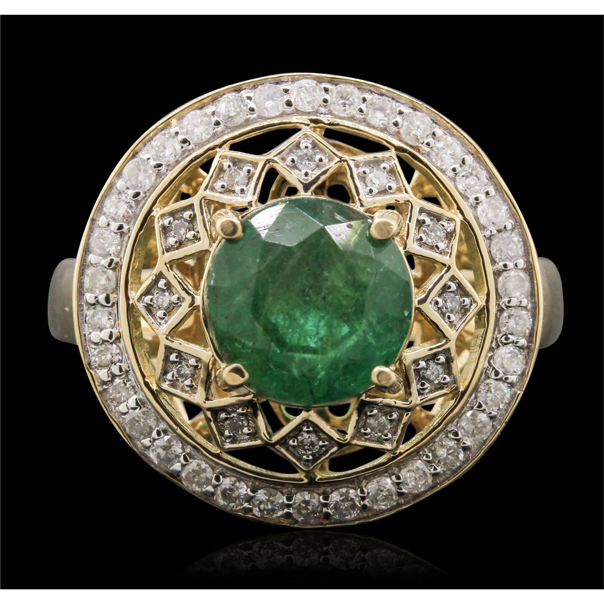 One electronically tested 14KT yellow gold Ladies cast ring with a bright polish finish. Condition is new. Identified with markings of "14K". Containing: One prong set round modified brilliant cut natural emerald, measuring 8.28 - 8.28 x 5.60 mm, approximate weight of 2.09ct., clarity is heavily included, type III, medium, moderately strong, green color, (GIA G 5/4), cut is good. Colored gemstones are presumed to have been subjected to commonly used color/clarity enhancement processes. Forty-Six prong set round brilliant cut diamonds, measuring 1.30 - 1.30 x 0.78mm (depth est.) approximate. Total Weight of 46 Stones = 0.37ct. Clarity: I-1 to I-2. Color: I - J, Cut is Good. Total Weight of Colored Stones 2.09ct. Total Weight of Diamonds 0.37ct. Total Weight of Ring 5.80 Grams. GGL Appraised at $6,850.00.