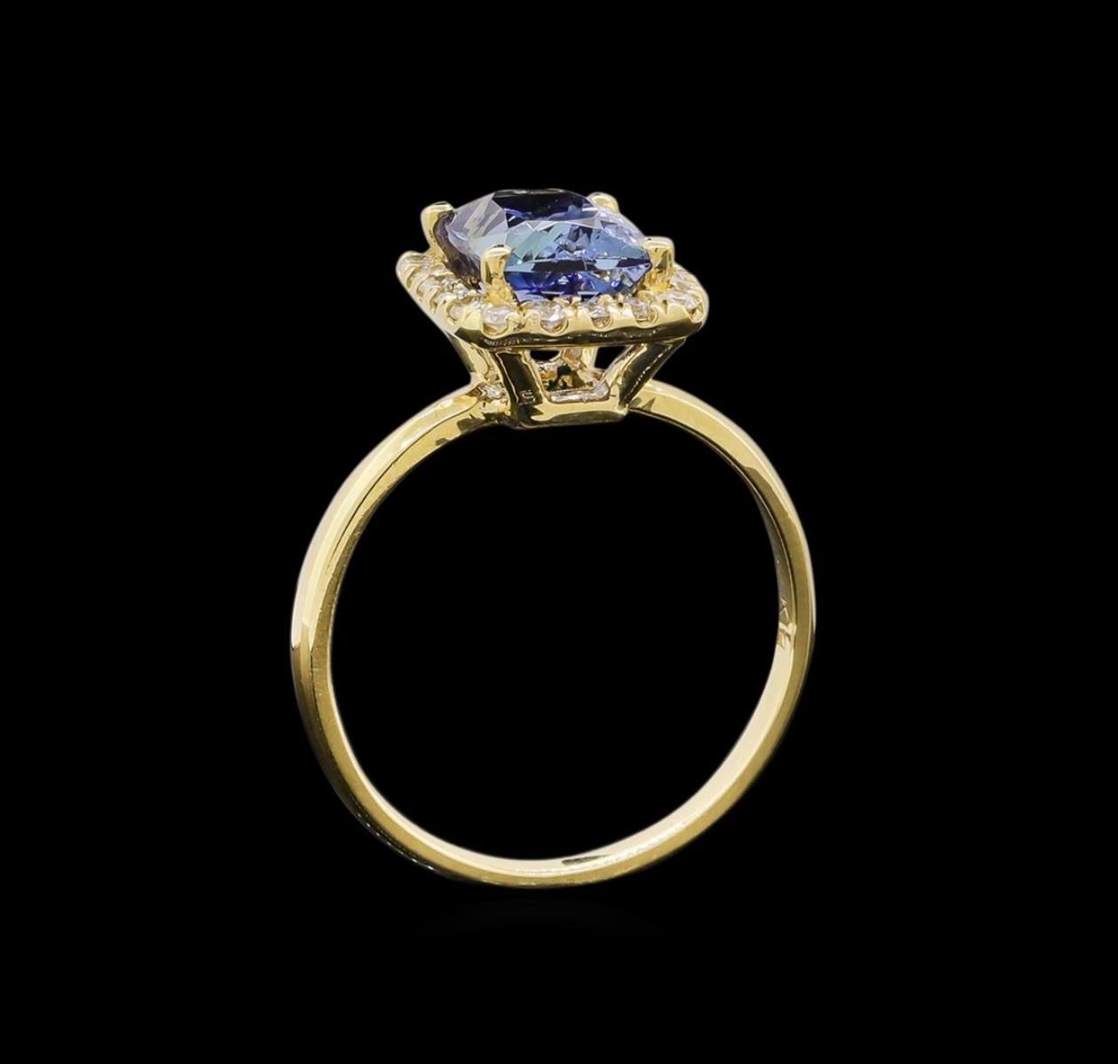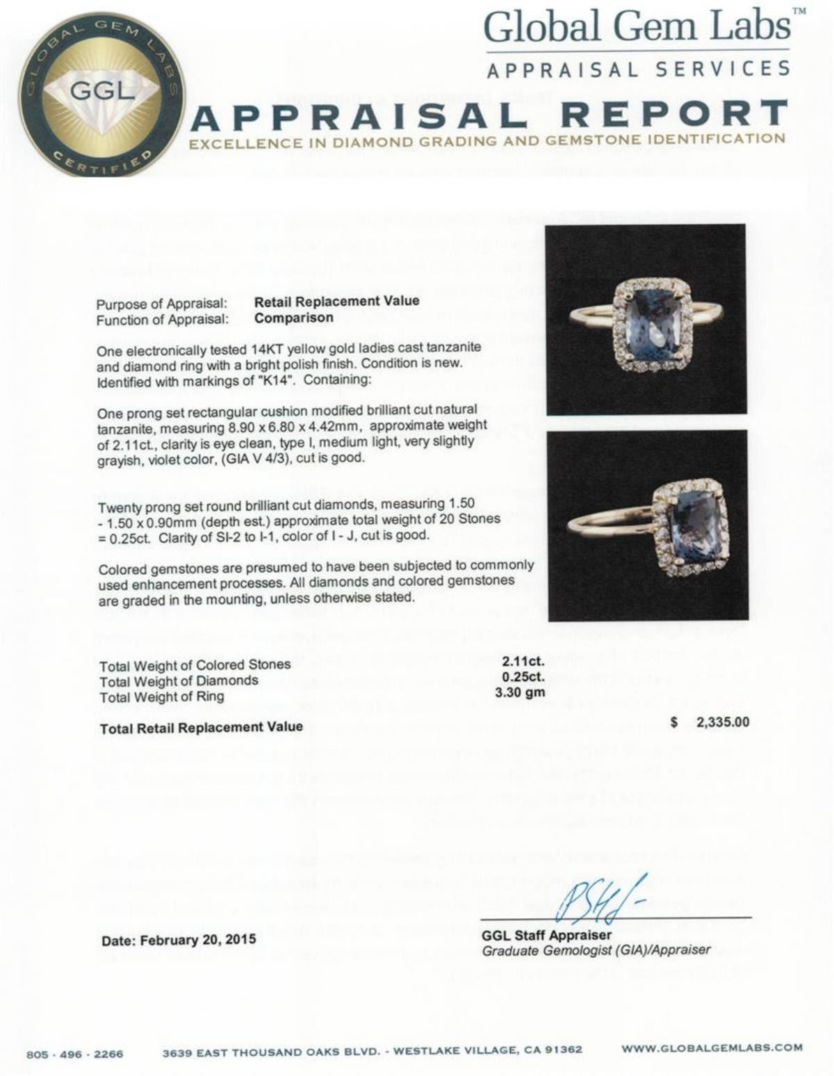 One electronically tested 14KT yellow gold ladies cast tanzanite and diamond ring with a bright polish finish. Identified with markings of "K14". Condition is new. Containing: One prong set rectangular cushion modified brilliant cut natural tanzanite, measuring 8.90 x 6.80 x 4.42mm, approximate weight of 2.11ct., clarity is eye clean, type I, medium light, very slightly grayish, violet color, (GIA V 4/3), cut is good. Twenty prong set round brilliant cut diamonds, measuring 1.50 - 1.50 x 0.90mm (depth est.) approximate total weight of 20 Stones = 0.25ct. Clarity: SI-2 to I-1. Color: I - J, Cut is Good. Colored gemstones are presumed to have been subjected to commonly used enhancement processes. All diamonds and colored gemstones are graded in the mounting, unless otherwise stated. Total Weight of Colored Stones 2.11ct. Total Weight of Diamonds 0.25ct. Total Weight of Ring 3.30 grams. GGL Appraised.