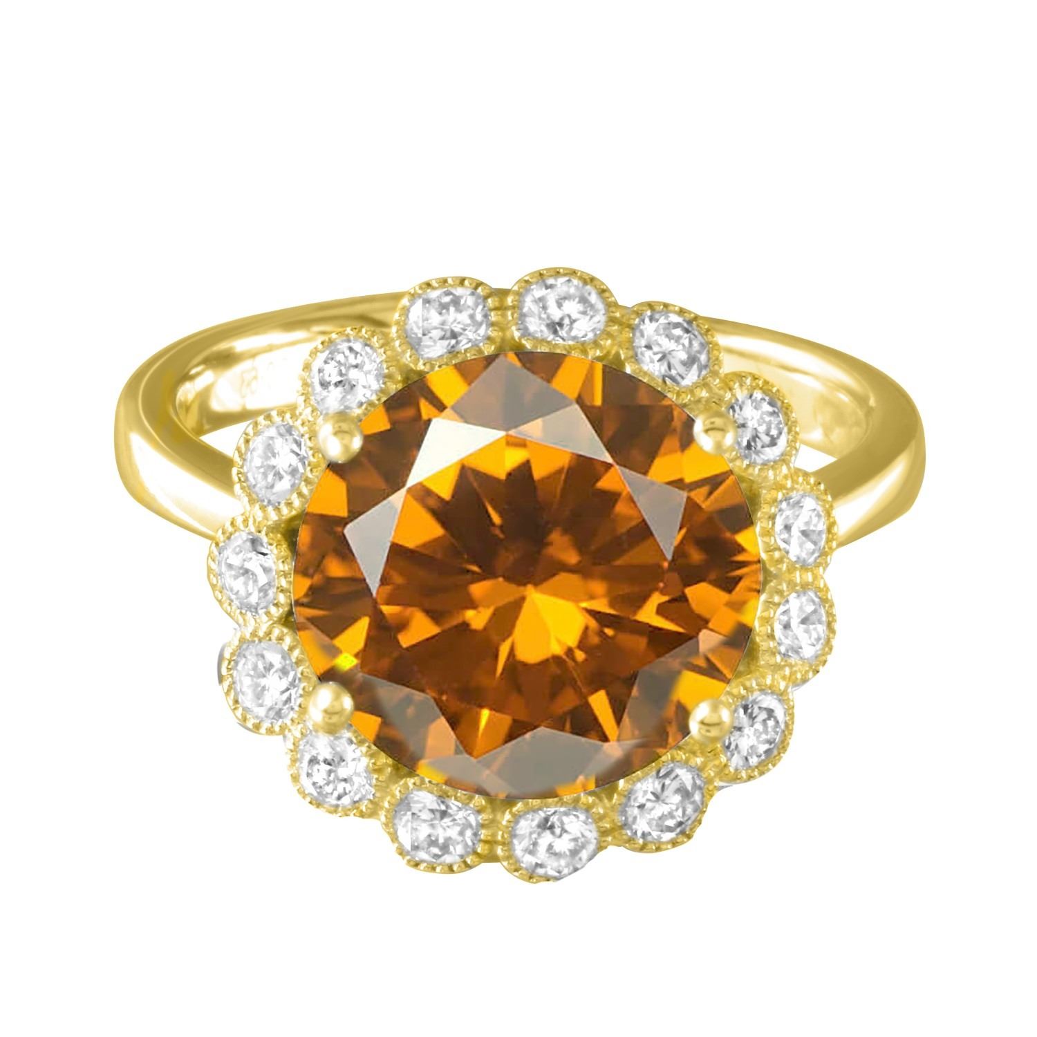 One 14KT Yellow Gold 2.11ct Citrine and Diamond Ring. (1) Citrine stone with a total weight of 2.11cts. (12) Diamonds with a total weight of 0.53cts with a color of H-I and a clarity of SI-2. Total weight of this ring is 4.9 grams. Ring size is 6.5.