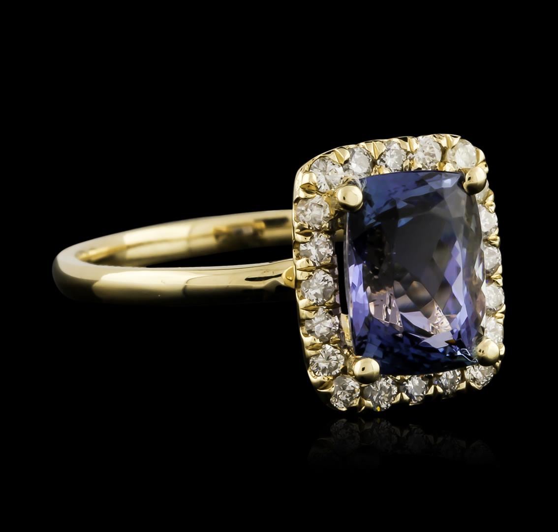 One electronically tested 14KT yellow gold ladies cast tanzanite and diamond ring with a bright polish finish. Identified with markings of "K14". Condition is new. Containing: One prong set rectangular cushion modified brilliant cut natural tanzanite, measuring 8.90 x 6.80 x 4.42mm, approximate weight of 2.11ct., clarity is eye clean, type I, medium light, very slightly grayish, violet color, (GIA V 4/3), cut is good. Twenty prong set round brilliant cut diamonds, measuring 1.50 - 1.50 x 0.90mm (depth est.) approximate total weight of 20 Stones = 0.25ct. Clarity: SI-2 to I-1. Color: I - J, Cut is Good. Colored gemstones are presumed to have been subjected to commonly used enhancement processes. All diamonds and colored gemstones are graded in the mounting, unless otherwise stated. Total Weight of Colored Stones 2.11ct. Total Weight of Diamonds 0.25ct. Total Weight of Ring 3.30 grams. GGL Appraised at $2,335.00.