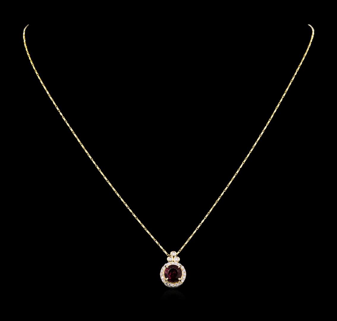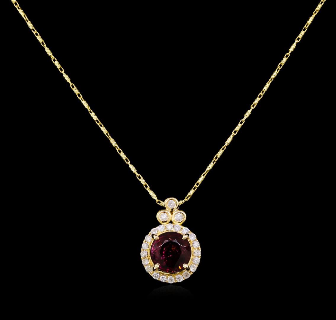 One electronically tested 14KT yellow gold ladies cast & assembled tourmaline and diamond pendant with chain. Condition is new, good workmanship. The featured tourmaline is set within a diamond bezel, completed by a diamond set bail. The pendant is supported by an eighteen inch length 14KT yellow gold designer style chain, terminating in a lobster claw clasp. Bright polish finish. Trademark is ORIANNE. Identified with markings of "14K". Containing: One prong set round mixed cut natural rubellite, measuring 7.50 - 7.40 x 5.20 mm, 15%. bulge factor, approximate weight of 2.12ct., clarity is slightly included, type III, medium dark, moderately strong, strongly purplish red color, (GIA stpR 6/4), cut is good. Transmitting light with a minimum of distortion, transparent. Naturally occurring internal & external characteristics are present. Graded in the setting. Twenty-Three bezel and prong set round brilliant cut diamonds, measuring 1.40 - 1.30 x 0.81mm (depth est.) approximate. Total Weight of 23 Stones = 0.24ct. Graded in the setting. Clarity: SI-2 to I-2. Color: G - I. Total Weight of Colored Stones 2.12ct. Total Weight of Diamonds 0.24ct. Total Weight of Pendant With Chain 4.41 grams. AIG Appraised at $3,025.00.