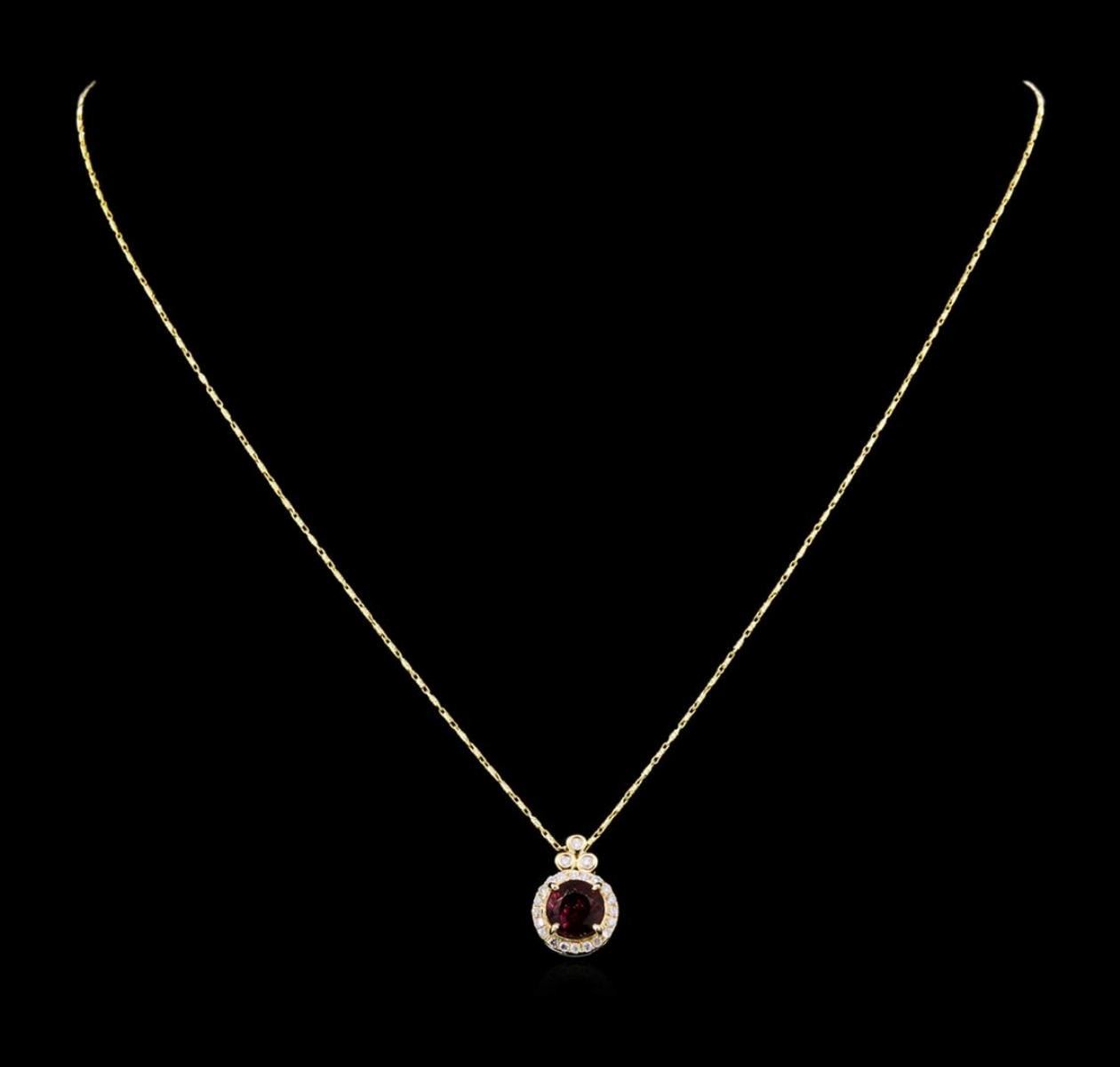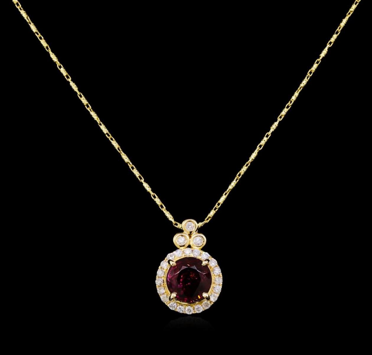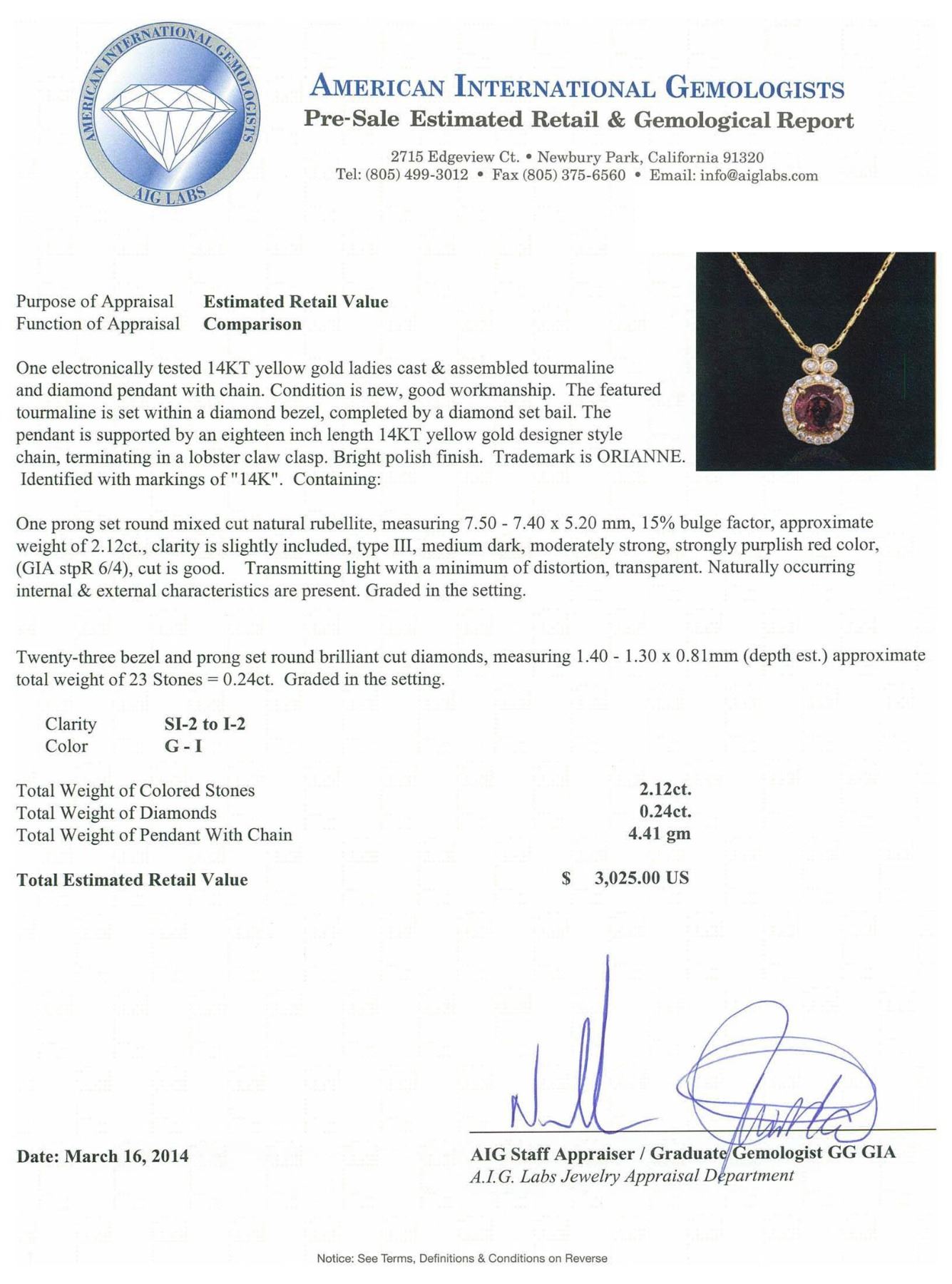One electronically tested 14KT yellow gold ladies cast & assembled tourmaline and diamond pendant with chain. Condition is new, good workmanship. The featured tourmaline is set within a diamond bezel, completed by a diamond set bail. The pendant is supported by an eighteen inch length 14KT yellow gold designer style chain, terminating in a lobster claw clasp. Bright polish finish. Trademark is ORIANNE. Identified with markings of "14K". Containing: One prong set round mixed cut natural rubellite, measuring 7.50 - 7.40 x 5.20 mm, 15%. bulge factor, approximate weight of 2.12ct., clarity is slightly included, type III, medium dark, moderately strong, strongly purplish red color, (GIA stpR 6/4), cut is good. Transmitting light with a minimum of distortion, transparent. Naturally occurring internal & external characteristics are present. Graded in the setting. Twenty-Three bezel and prong set round brilliant cut diamonds, measuring 1.40 - 1.30 x 0.81mm (depth est.) approximate. Total Weight of 23 Stones = 0.24ct. Graded in the setting. Clarity: SI-2 to I-2. Color: G - I. Total Weight of Colored Stones 2.12ct. Total Weight of Diamonds 0.24ct. Total Weight of Pendant With Chain 4.41 grams. AIG Appraised.