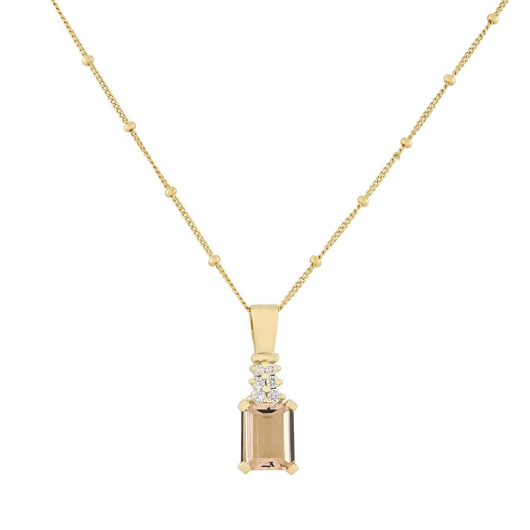 One electronically tested 14KT yellow gold ladies cast morganite and diamond pendant & chain 16.0" long, with a spring ring clasp with a bright polish finish. Identified with markings of "14K". Condition is new. Containing: One prong set emerald standard step cut natural morganite, measuring 9.20 x 7.50 x 3.70mm, approximate weight of 2.13ct., clarity is eye clean, type I, very light, brownish, reddish orange color, (GIA rO 2/1), cut is good. Citrine is commonly heated to improve or change the color. Whether or not this gemstone has been heated cannot currently be determined. Six prong set round brilliant cut diamonds, measuring 2.00 - 1.80 x 1.14mm (depth est.) approximate total weight of 6 Stones = 0.13ct. Clarity: SI-1 to I-1. Color: I - J. Colored gemstones are presumed to have been subjected to commonly used enhancement processes. All diamonds and colored gemstones are graded in the mounting, unless otherwise stated. Total Weight of Colored Stones 2.13ct. Total Weight of Diamonds 0.13ct. Total Weight of Pendant & Chain 5.30 grams.