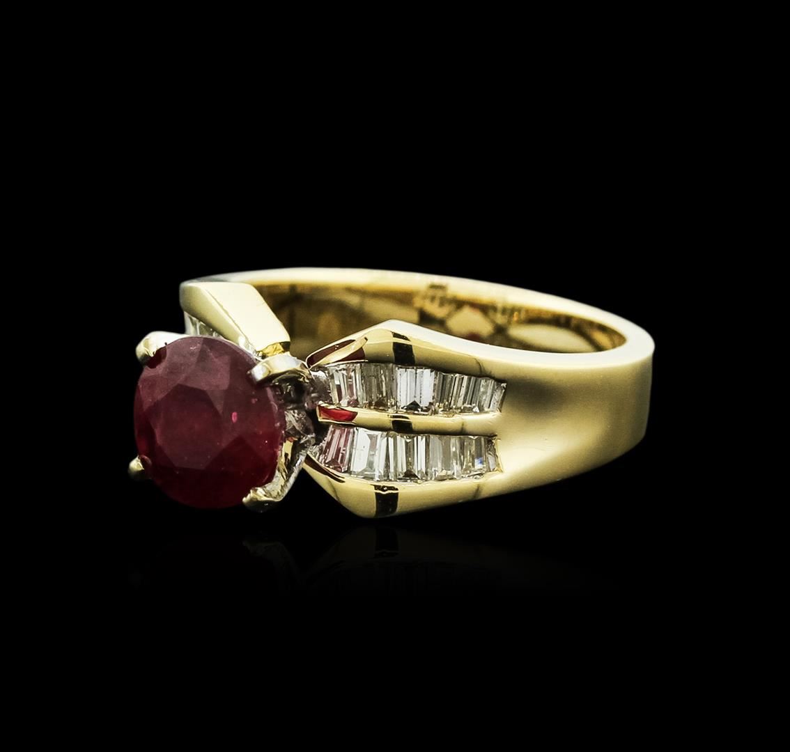 One electronically tested 14KT yellow gold ladies cast ruby and diamond ring with a bright and brushed finish. Identified with markings of "14K". Condition is new. Containing: One prong set round modified brilliant cut natural ruby, measuring 7.40 - 7.40 x 4.81 mm, approximate weight of 2.13ct., clarity is heavily included, medium, moderately strong, strongly purplish red color, (GIA stpR 5/4), cut is good. Twenty channel set baguette cut diamonds, measuring 2.00. x 1.80 x 1.53mm (depth est.) approximate total weight of 20 Stones = 1.01ct. Clarity: VS-2 to SI-1. Color: I - J. Colored gemstones are presumed to have been subjected to commonly used enhancement processes. All diamonds and colored gemstones are graded in the mounting, unless otherwise stated. Total Weight of Colored Stones 2.13ct. Total Weight of Diamonds 1.01ct. Total Weight of Ring 7.60 grams. GGL Appraised at $3,690.00.