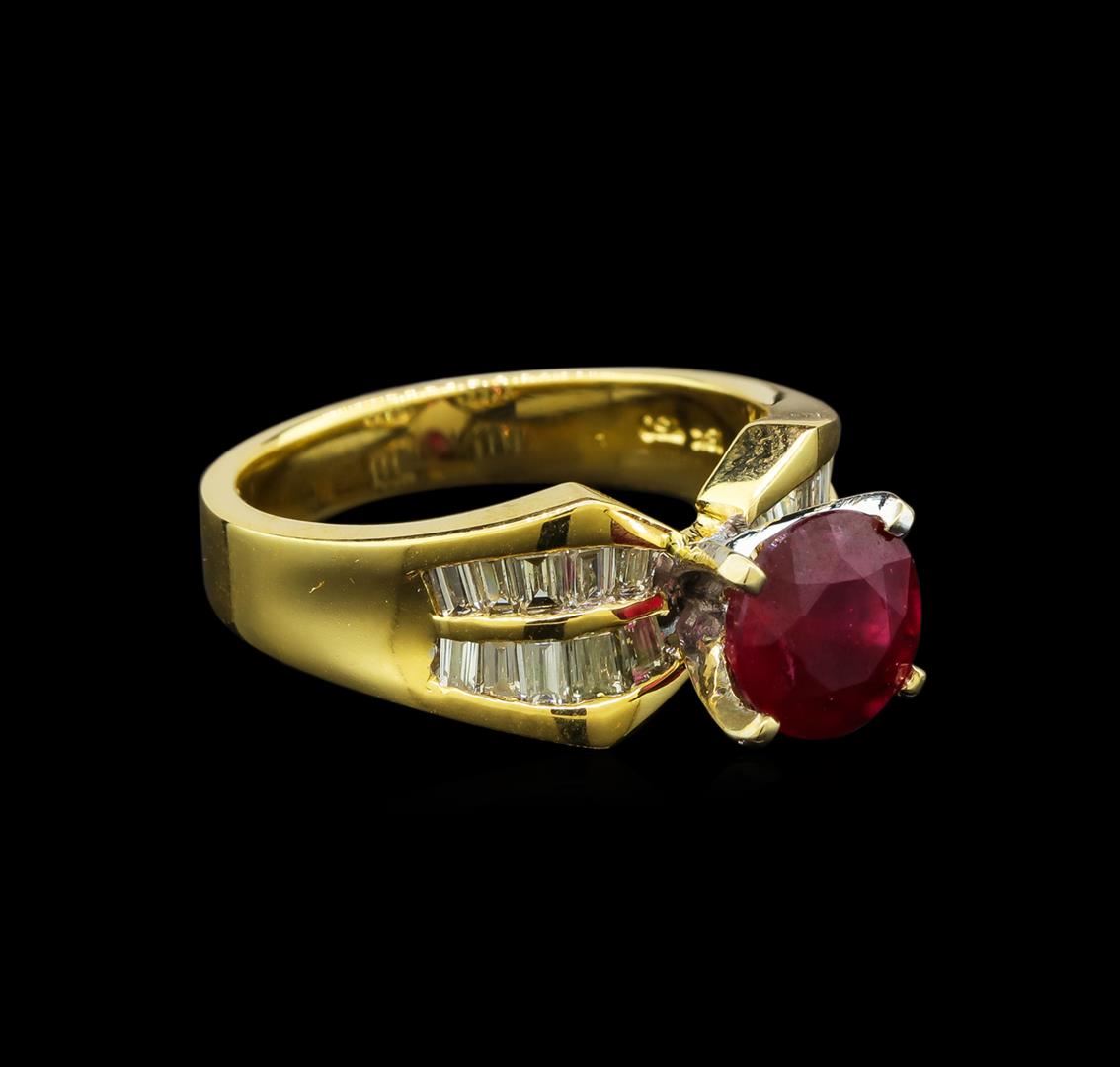 One electronically tested 14KT yellow gold ladies cast ruby and diamond ring with a bright and brushed finish. Identified with markings of "14K". Condition is new. Containing: One prong set round modified brilliant cut natural ruby, measuring 7.40 - 7.40 x 4.81 mm, approximate weight of 2.13ct., clarity is heavily included, medium, moderately strong, strongly purplish red color, (GIA stpR 5/4), cut is good. Twenty channel set baguette cut diamonds, measuring 2.00. x 1.80 x 1.53mm (depth est.) approximate total weight of 20 Stones = 1.01ct. Clarity: VS-2 to SI-1. Color: I - J. Colored gemstones are presumed to have been subjected to commonly used enhancement processes. All diamonds and colored gemstones are graded in the mounting, unless otherwise stated. Total Weight of Colored Stones 2.13ct. Total Weight of Diamonds 1.01ct. Total Weight of Ring 7.60 grams. GGL Appraised at $3,690.00.