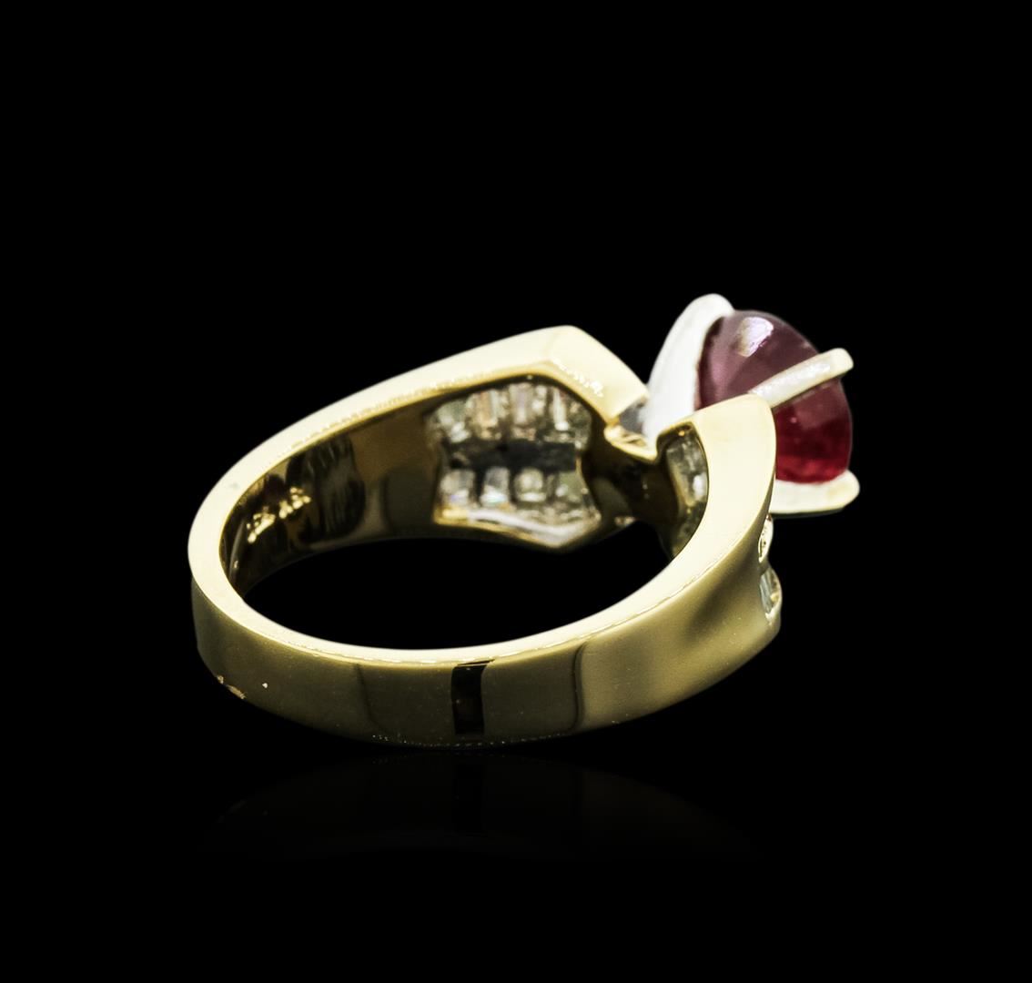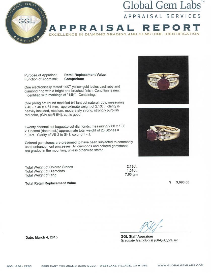 One electronically tested 14KT yellow gold ladies cast ruby and diamond ring with a bright and brushed finish. Identified with markings of "14K". Condition is new. Containing: One prong set round modified brilliant cut natural ruby, measuring 7.40 - 7.40 x 4.81 mm, approximate weight of 2.13ct., clarity is heavily included, medium, moderately strong, strongly purplish red color, (GIA stpR 5/4), cut is good. Twenty channel set baguette cut diamonds, measuring 2.00. x 1.80 x 1.53mm (depth est.) approximate total weight of 20 Stones = 1.01ct. Clarity: VS-2 to SI-1. Color: I - J. Colored gemstones are presumed to have been subjected to commonly used enhancement processes. All diamonds and colored gemstones are graded in the mounting, unless otherwise stated. Total Weight of Colored Stones 2.13ct. Total Weight of Diamonds 1.01ct. Total Weight of Ring 7.60 grams. GGL Appraised at $3,690.00.