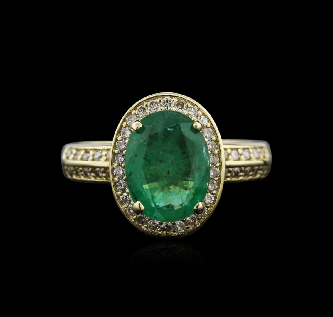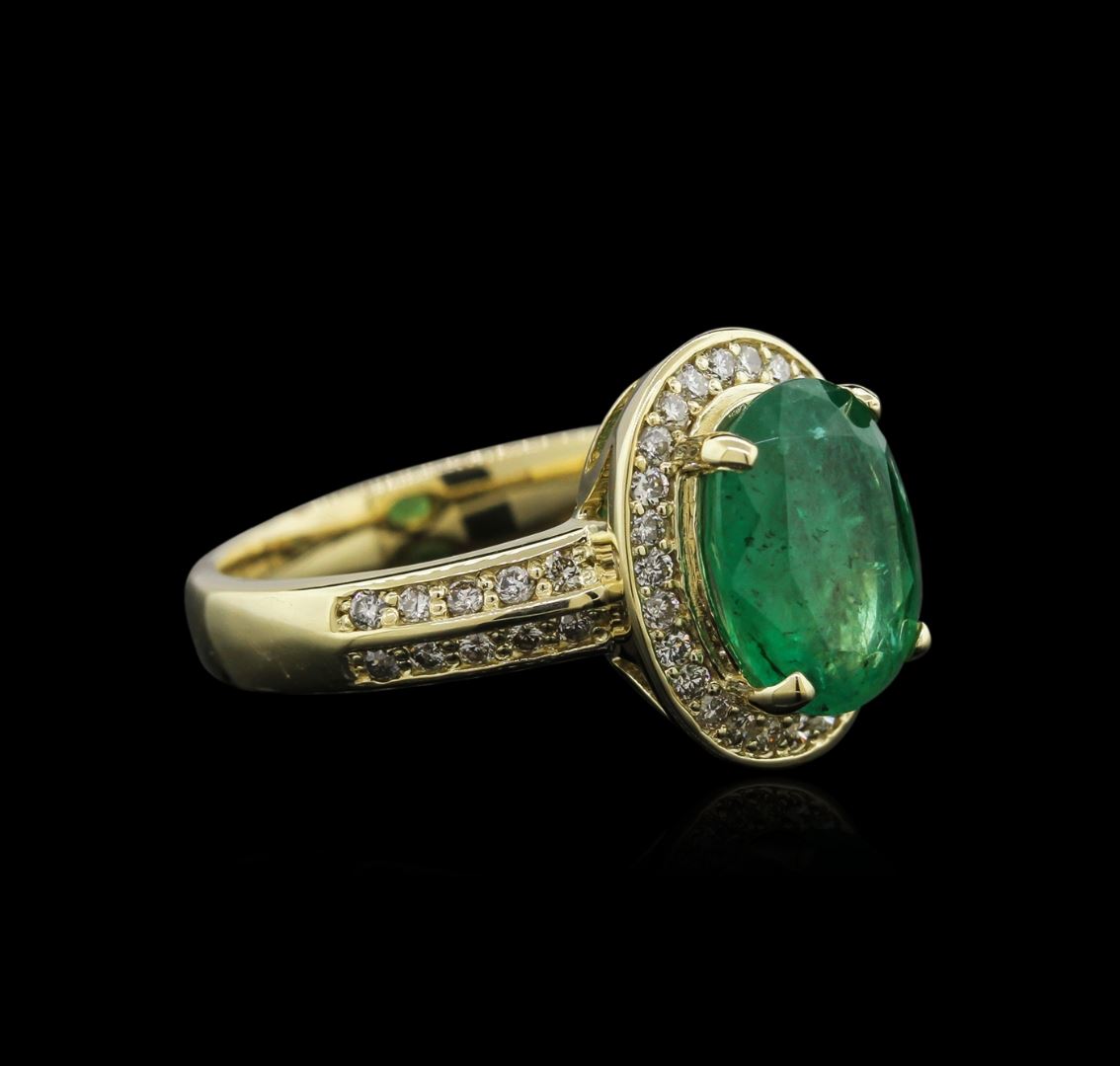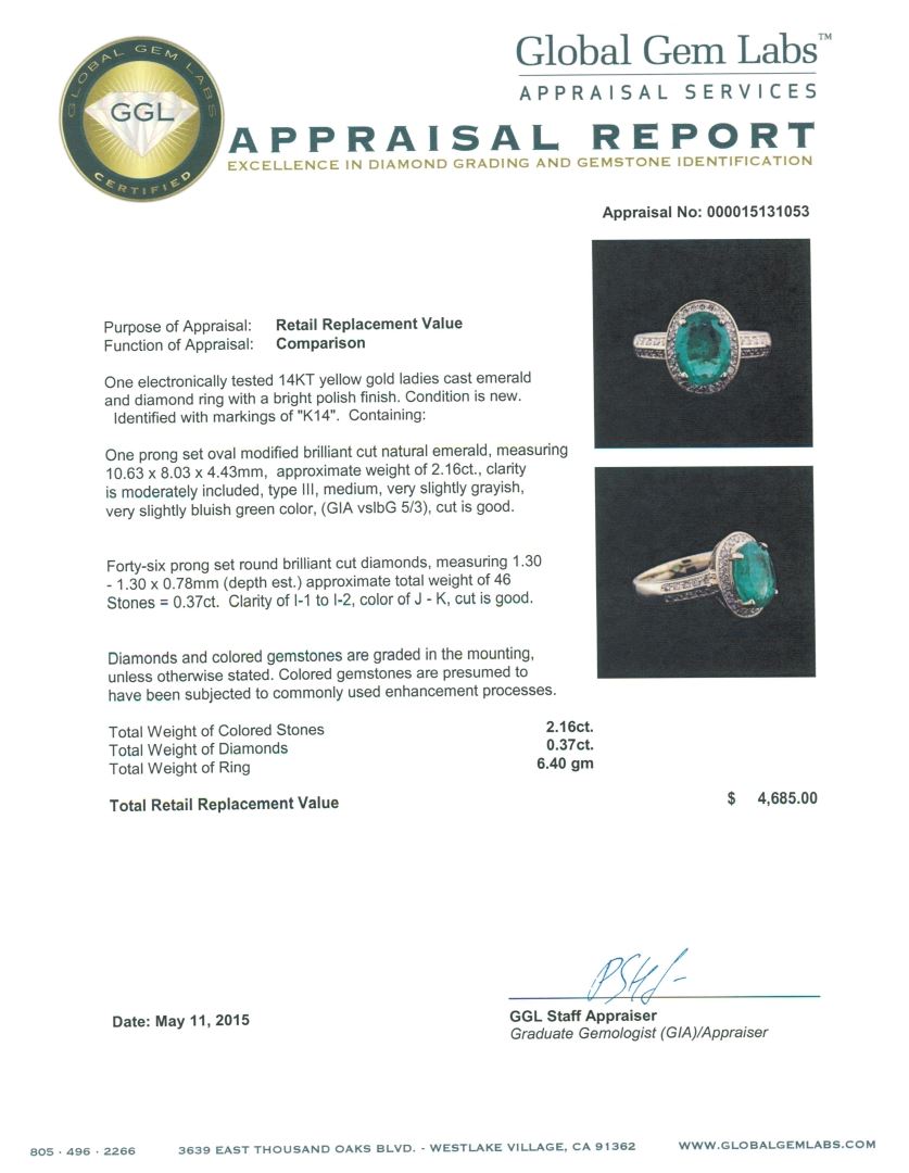 One electronically tested 14KT yellow gold ladies cast emerald and diamond ring with a bright polish finish. Identified with markings of "K14". Condition is new. Containing: One prong set oval modified brilliant cut natural emerald, measuring 10.63 x 8.03 x 4.43mm, approximate weight of 2.16ct., clarity is moderately included, type III, medium, very slightly grayish, very slightly bluish green color, (GIA vslbG 5/3), cut is good. Forty-Six prong set round brilliant cut diamonds, measuring 1.30 - 1.30 x 0.78mm (depth est.) approximate total weight of 46 Stones = 0.37ct. Clarity: I-1 to I-2. Color: J - K, Cut is Good. Diamonds and colored gemstones are graded in the mounting, unless otherwise stated. Colored gemstones are presumed to have been subjected to commonly used enhancement processes. Total Weight of Colored Stones 2.16ct. Total Weight of Diamonds 0.37ct. Total Weight of Ring 6.40 grams. GGL Appraised at $4,685.00.