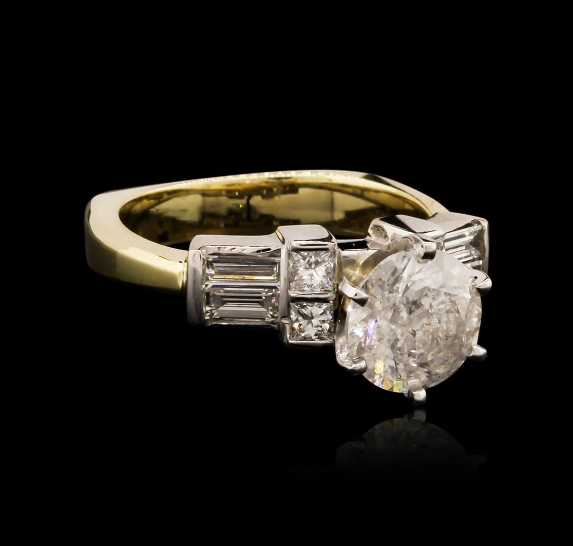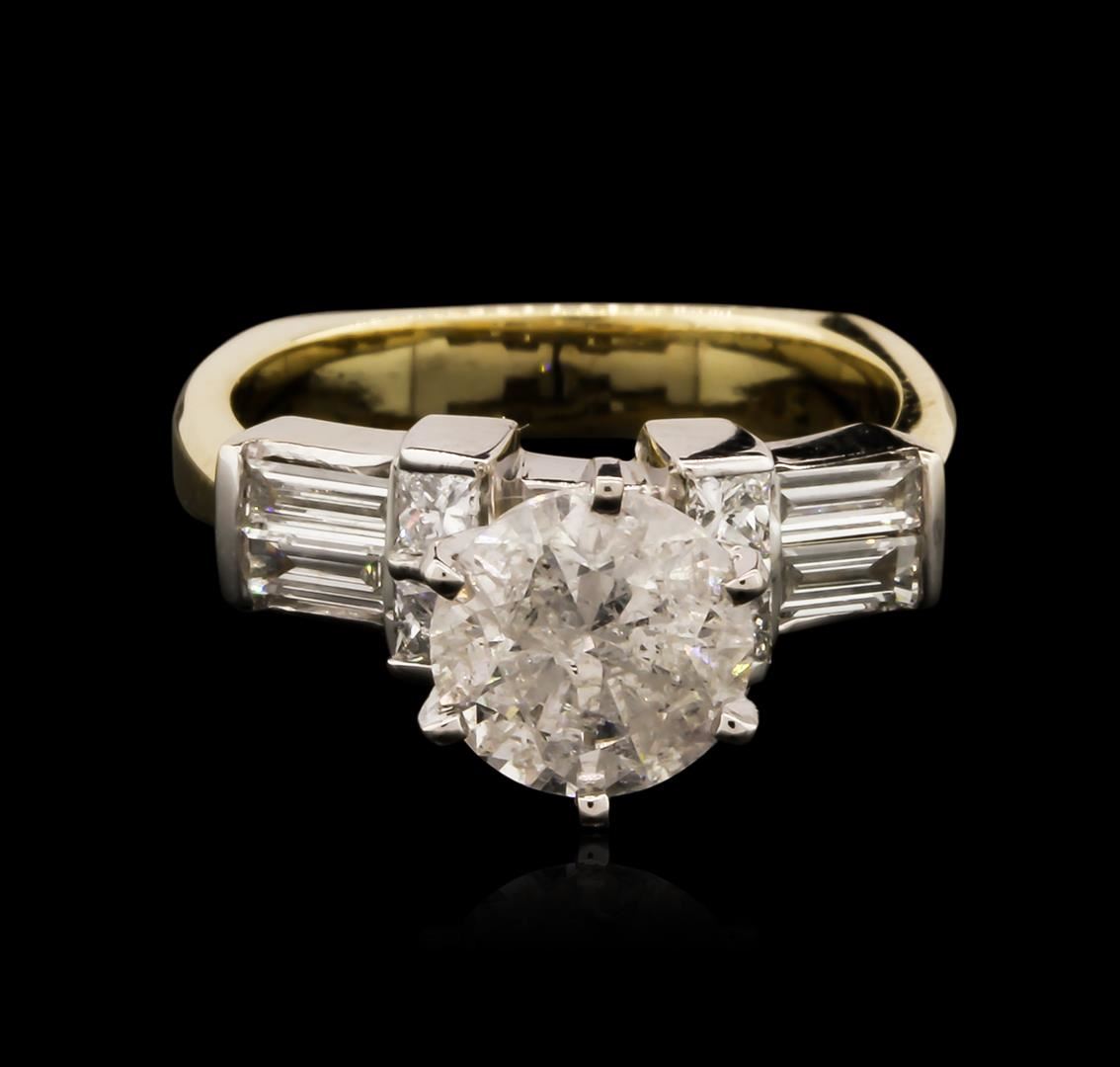 One electronically tested 14KT yellow gold ladies cast diamond engagement ring with a bright polish finish. Identified with markings of "14K". Condition is new. Containing: One prong set round brilliant cut diamond, measuring 7.65 - 7.60 x 4.58mm (depth est.) approximate weight of 1.62ct. Clarity: I-3. Color: J, Cut is Good. Four prong set princess cut diamonds, measuring 2.00 x 2.00 x 1.50mm (depth est.) approximate total weight of 4 Stones = 0.20ct. Clarity: SI-1. Color: I - J, Cut is Good. Four prong set baguette cut diamonds, measuring 4.00 x 1.70 x 1.45mm (depth est.) approximate total weight of 4 Stones = 0.36ct. Clarity: VS-2. Color: I - J, Cut is Good. All diamonds are graded in the mounting, unless otherwise stated. Total Weight of Diamonds 2.18ct. Total Weight of Engagement Ring 6.20 grams. GGL Appraised at $7,880.00.