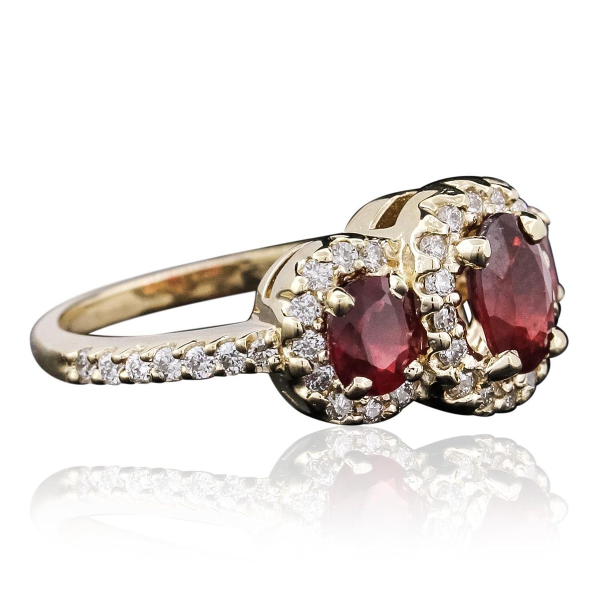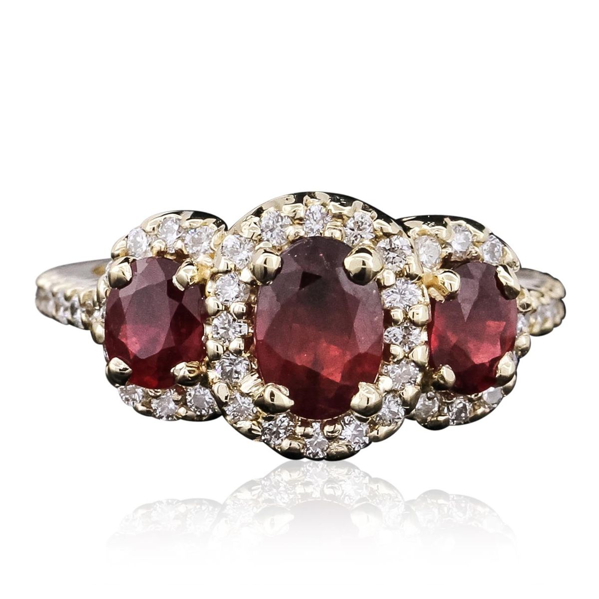 One electronically tested 14KT yellow gold ladies cast ruby and diamond ring with a bright polish finish. The ring features a trio of ruby and diamond bezels supported by diamond set shoulders, completed by a one and one-half millimeter wide band. Identified with markings of "14K". Condition is new, good workmanship. Containing: Three prong set oval mixed cut natural rubies approximate total weight of 2.18ct., clarity is heavily included, type II, medium dark, very slightly brownish, slightly purplish red color, (GIA slpR 6/3), cut is good. Transmitting light somewhat diffusely, transparent to translucent. Naturally occurring internal & external characteristics are present. Indications of laboratory high temperature heat treatment, with glass & flux additives. Color grade is an average for the group. Graded in the setting. Ruby has a low tolerance to rhodium plating, repolishing the surface, & ultrasonic cleaning. Forty-Eight prong set round brilliant cut diamonds, measuring 1.60 - 1.50 x 0.93mm (depth est.) approximate total weight of 48 Stones = 0.75ct. Graded in the setting. Clarity: SI-1 to I-1. Color: G - I. Total Weight of Colored Stones 2.18ct. Total Weight of Diamonds 0.75ct. Total Weight of Ring 5.89 grams. AIG Appraised at $3,615.00.